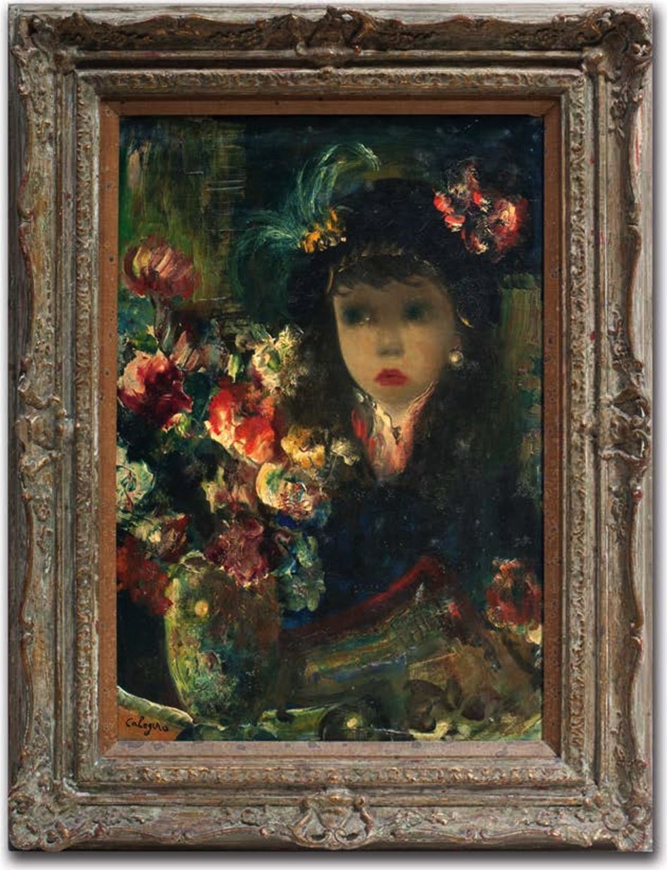 *Имеется авторская подпись в левом нижнем углу: «Calogero». Произведение «Девочка и цветы» написано в реалистической манере с использованием элементов сюрреализма, романтизма, символизма. Мы видим, как художник основательно деформирует реализм, превращая его в сновидение. Изображение маленькой девочки с крупными жемчужными сережками, в черной шляпе с цветами, большими черными глазами, смотрящими в неведомое пространство, воспринимается как тщательно обдуманный метод, стремящийся разорвать наши обыденные представления. Его работа наполнена мистикой, загадкой и тайной. Калоджеро родился в 1922 году на острове Сицилия. Он с детских лет стремился рисовать и посещал художественную школу в городе Этна. Первые его выставки на Сицилии и в Риме были очень успешными, что позволило ему поехать в Париж. Он хотел познакомиться и изучить новые тенденции в живописи и искусстве в целом. С 1947 года Калоджеро учился в Школе изящных искусств. В 1949 году подписал контракт с галереей в Париже. Его персональные выставки с успехом проходят в Нью- Йорке, Лос-Анджелесе, Японии, Италии. В 1954 году выходит его первая монография, автор французский арткритик Максимилиан Готье. В 1957 году Жан получил Большую серебряную медаль. В 1959 году его имя вошло в Международный каталог Benezit, где приводятся сведения о самых влиятельных художниках мира.