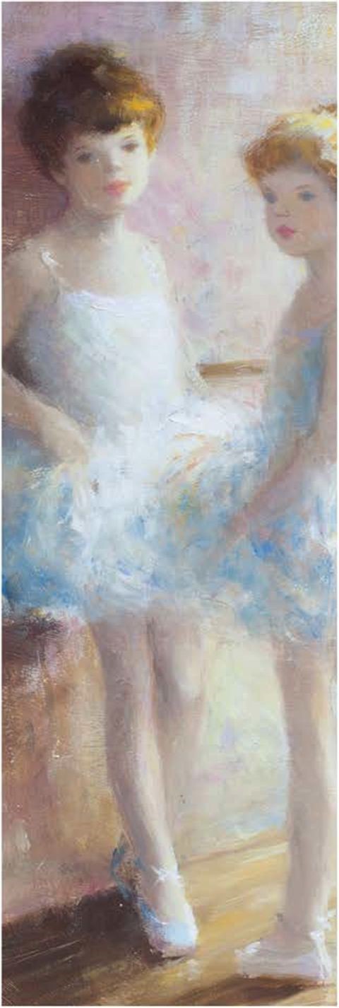 На своей картине Гарри Майерс изображает двух девочек, будущих балерин, которые после занятий у станка, отдыхают. Несмотря на расслабленное состояние, они «держат» спинку и не забывают о позициях ног. Девочки одеты в пачки голубого цвета и пуанты. Один балетный башмачок висит на перекладине станка. Произведение выполнено в пастельной, рафинированной цветовой гамме, воспринимается изысканной композицией, написанной водно мгновение. Пространство холста наполнено светом, что делает краски почти прозрачными.