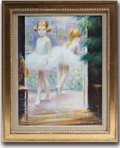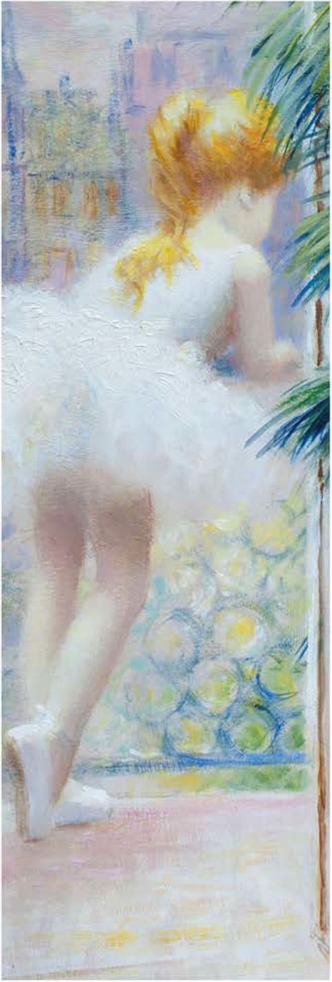 На полотне две девочки, отдыхают на балконе. Несмотря на расслабленное состояние, они «держат» спинку и не забывают о позициях ног. Они в белых пачках, преображенных солнцем и воздухом в голубоватые тона, на ногах - пуанты. Одна из девочек повернута к зрителю спиной. Облокотившись о решетку балкона, она смотрит на цветы, растущие внизу в большом количестве. Картина выполнена в пастельной, цветовой гамме, воспринимается изысканной композицией, написанной в одно мгновение.