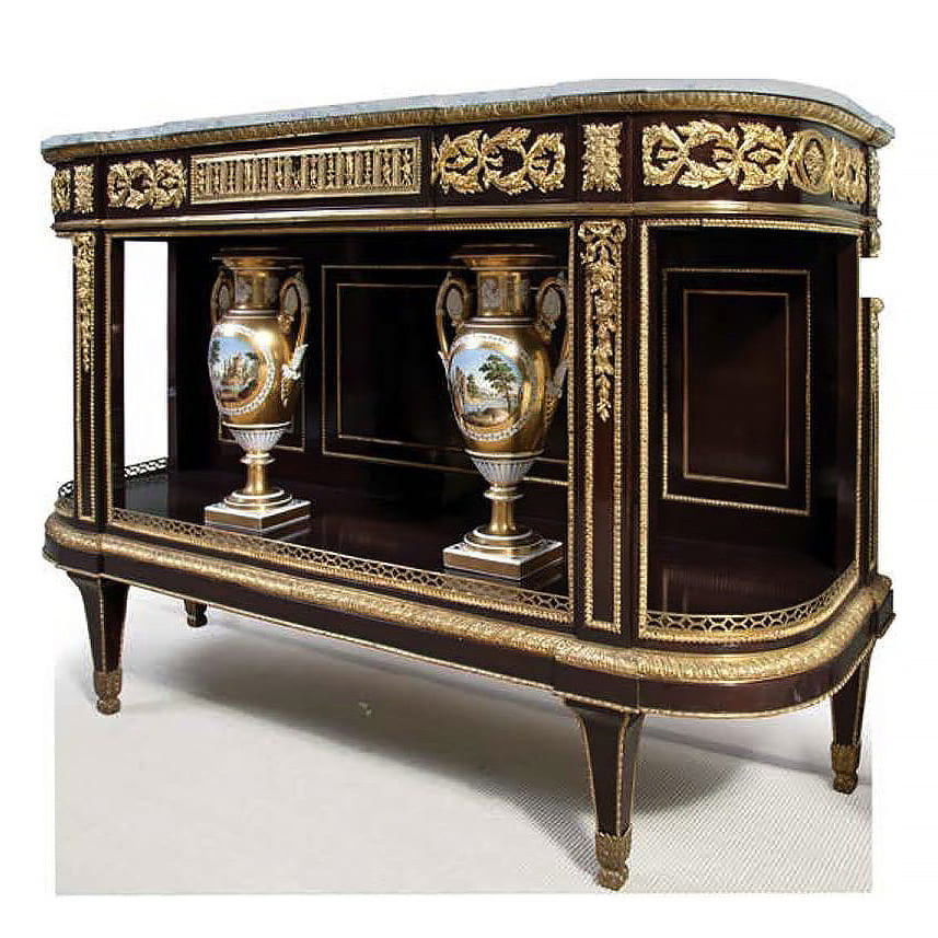 Консоль выполнена из красного дерева, бронзы и мрамора.