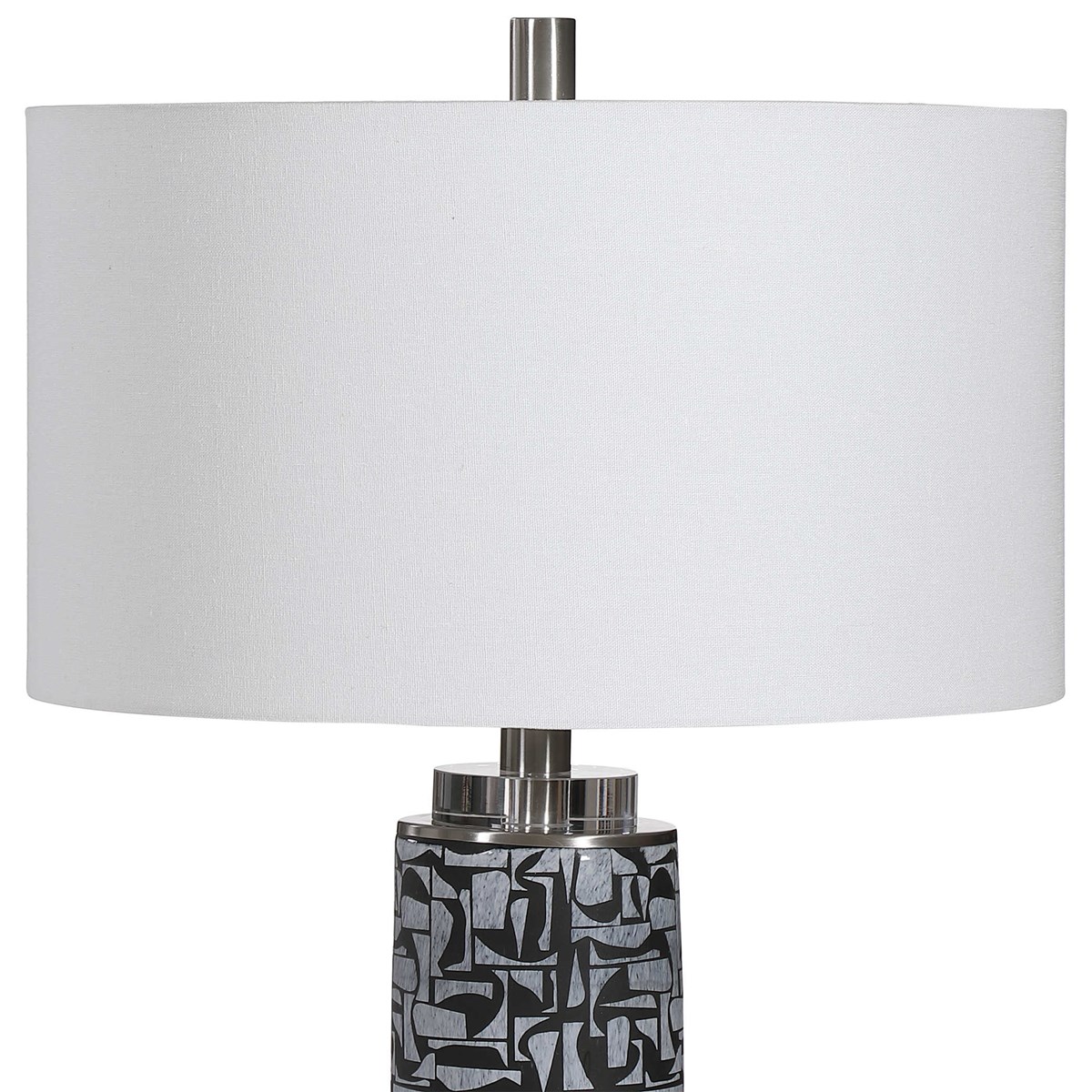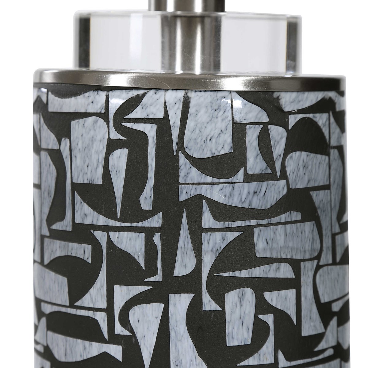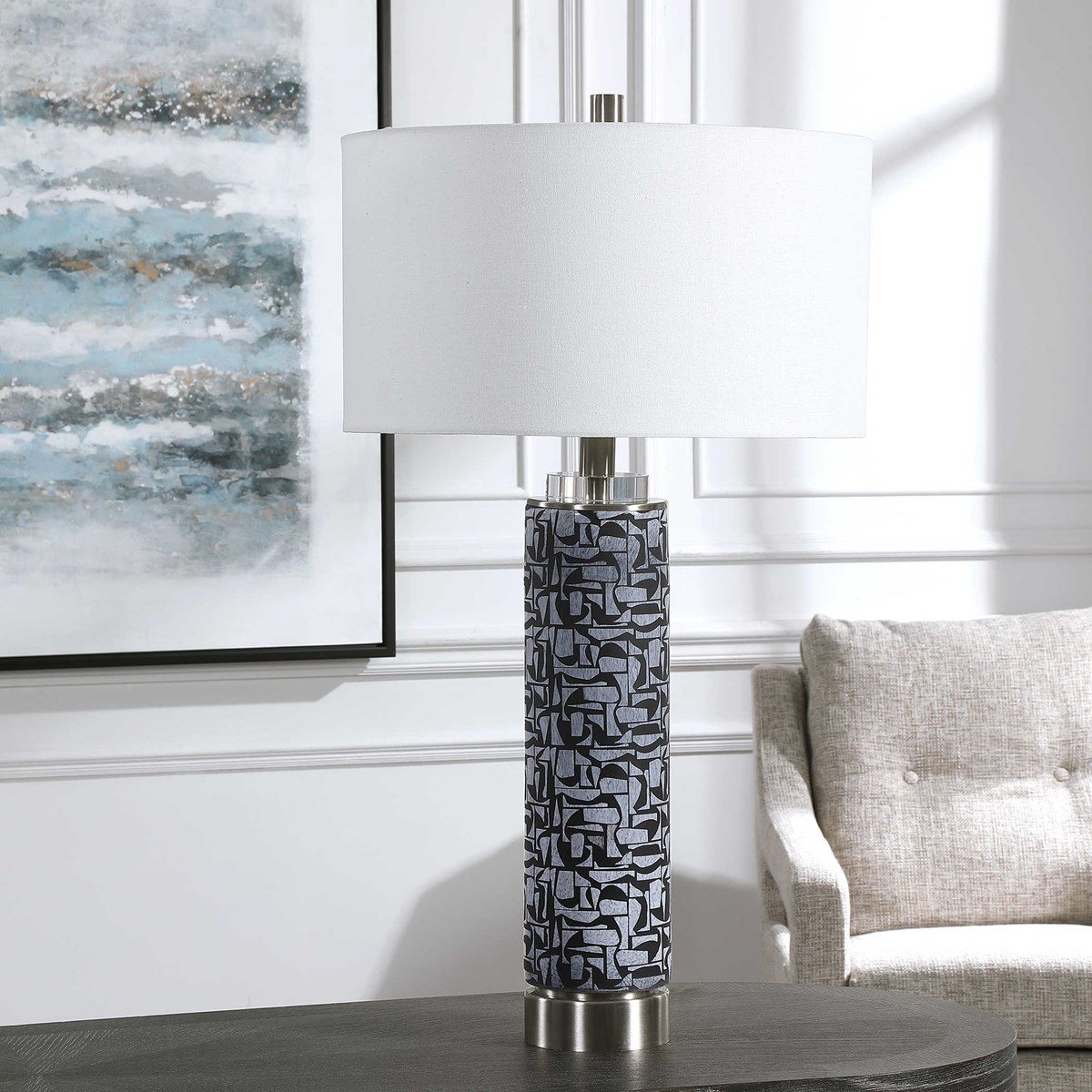 Настольная лампа KRAMER американского бренда Uttermost станет стильным дополнением интерьера. Эта настольная лампа, черпает вдохновение в скандинавском стиле, представляет собой уникальную основу из дымчатого, серого стекла с угольными пятнами, подчеркнутыми матовой черной гравированной вставкой. Хрустальные и матовые никелевые элементы подчеркивают дизайн. Завершает образ белый тканевый плафон, создающий мягкий, рассеивающий свет.