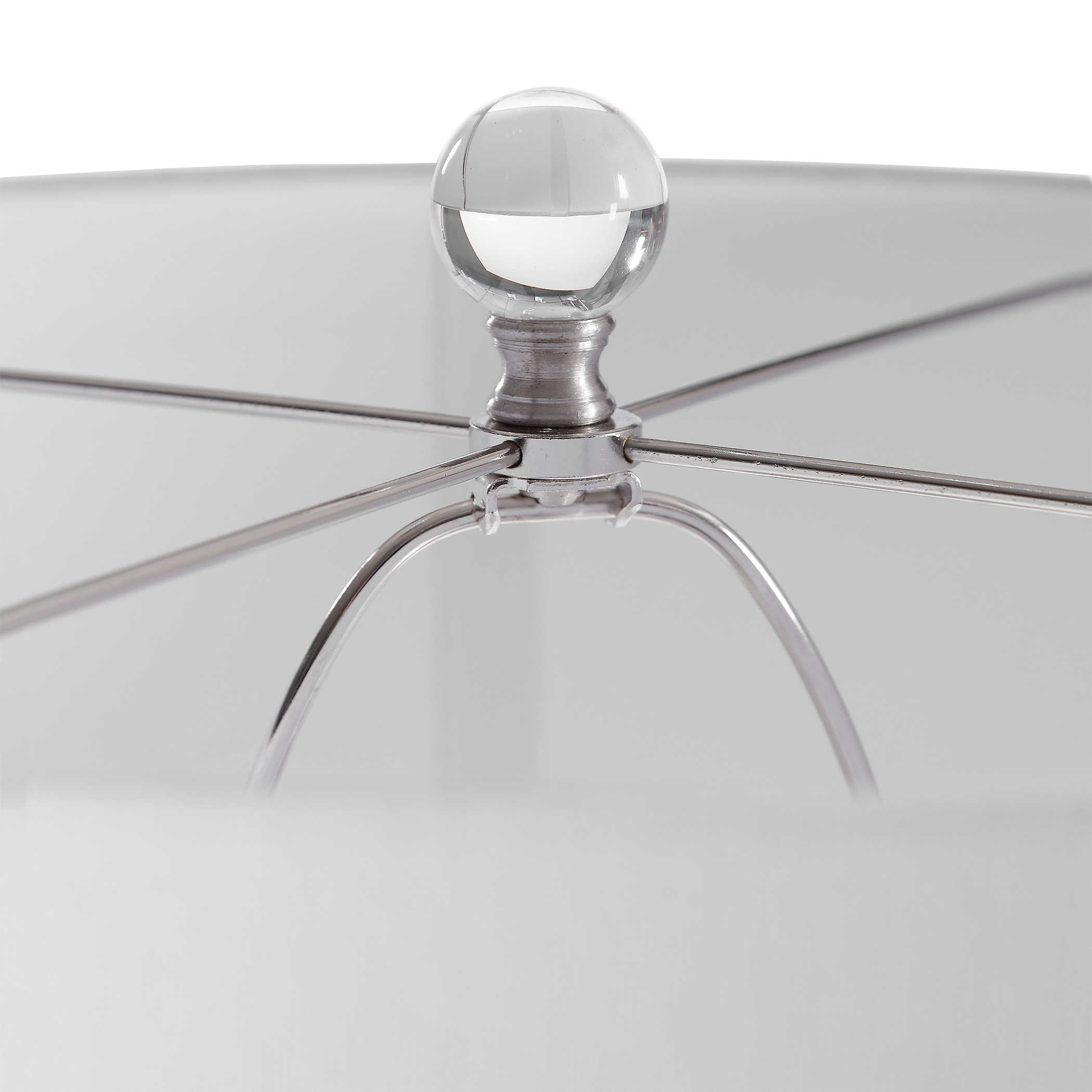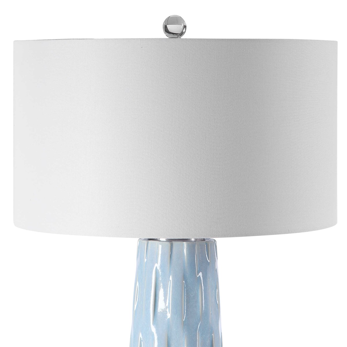 Настольная лампа BRIENNE американского бренда Uttermost станет стильным дополнением интерьера. Эта керамическая настольная лампа имеет волнистую переменную текстуру, покрытую светло-голубой глазурью с кремовыми оттенками, с акцентом на матовые никелированные детали и толстую хрустальную ножку. Абажур выполнен из белой льняной ткани для создания приятного светового комфорта.