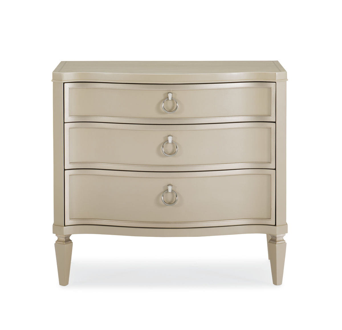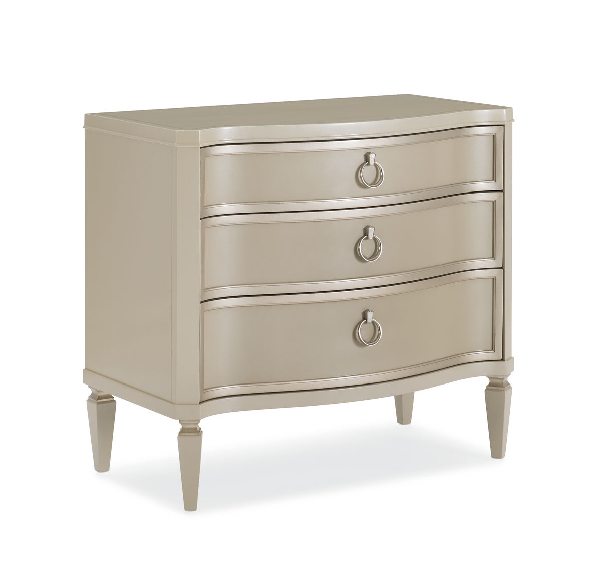 Элитарная тумба Next To Me представляет безупречную интерпретацию классического стиля. Легкий изгиб фасадов модели, оснащенный тремя вместительными ящиками с доводчиками, отражает сияние жемчужного покрытия с серебристыми акцентами. Изделие покоряет причудливым орнаментом на фигурной столешнице, выполненным в технике шелкографии, и скромными ручками-кольцами. Привлекательная во всех отношениях прикроватная тумба добавит особого очарования в любую спальню.