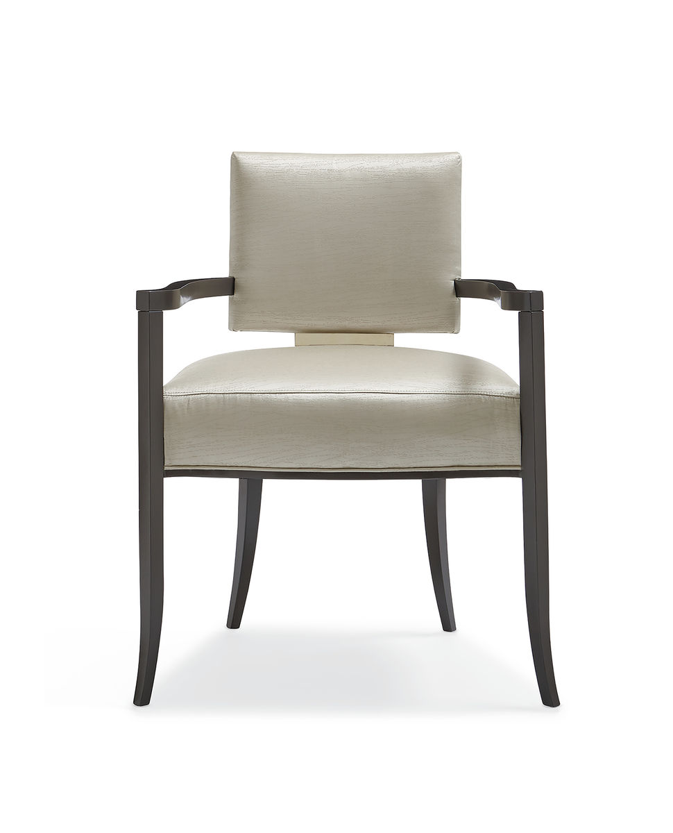 Стул Reserved Seating с подлокотниками выглядит просто блестяще! Атласная обивка с тонким муаровым узором жемчужного оттенка полностью окутывает верхнюю часть спинки и подушку сиденья. Контрастный каркас с изящно изгибающимися подлокотниками, отделанными финишем Seal Skin, опирается на саблевидные ножки. Яркий характер изделию придает отполированная до зеркального блеска декоративная панель на внешней стороне спинки.