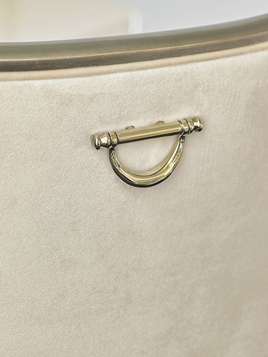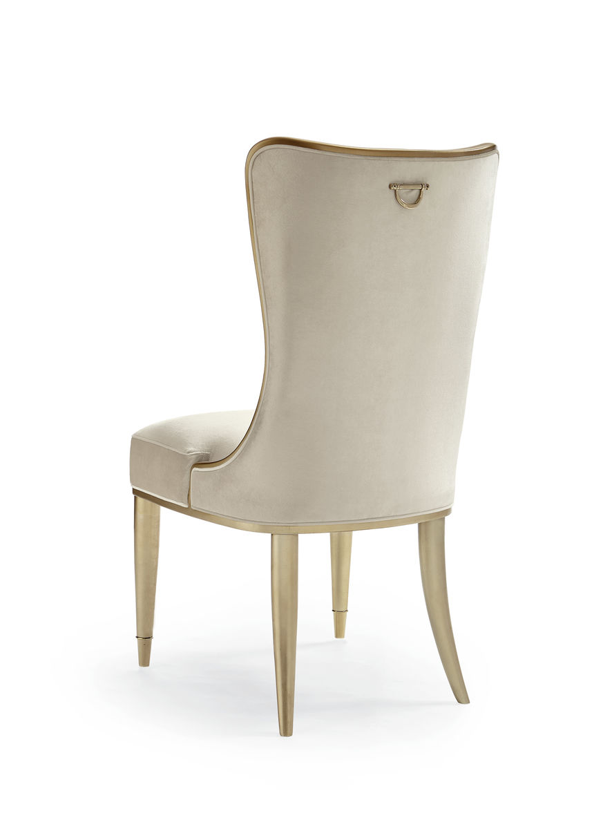 Этот прекрасный обеденный стул словно вышел из мира высокой моды. Деревянный каркас, покрытый золотой поталью, тонко очерчивает «крылатую» спинку модели из кремового бархата с оригинальной особенностью в виде золотой подковообразной ручки. Стройные деревянные ножки спереди украшены золотыми металлическими наконечниками. Этот роскошный экземпляр прекрасно сочетается как с традиционной, так и с современной обстановкой гостиной.