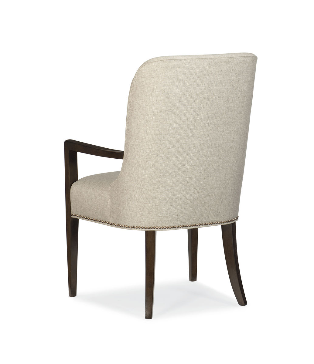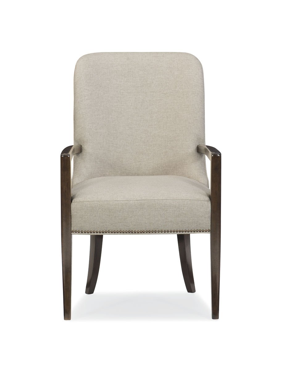 Стул с подлокотниками Streamline отличают прямые классические линии. Изделие полностью обтянуто нейтральной матовой тканью, а его квадратные подлокотники и прямоугольные саблевидные ножки отделаны дымчатой бронзой. Модель с окантовкой основания латунными гвоздиками прекрасно впишется в современную обстановку.