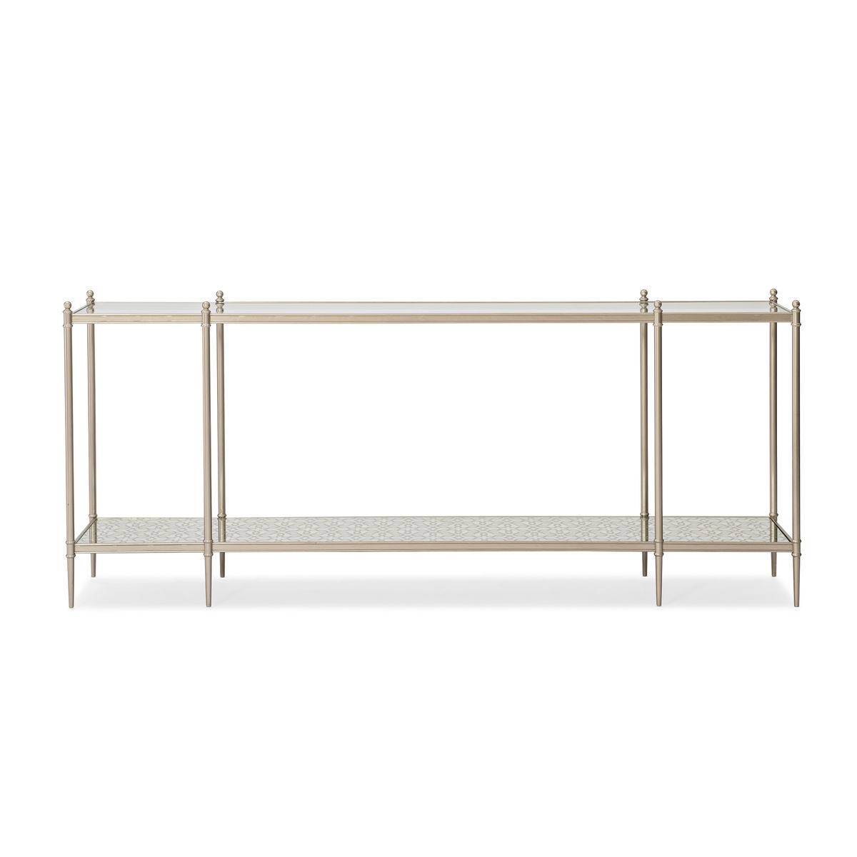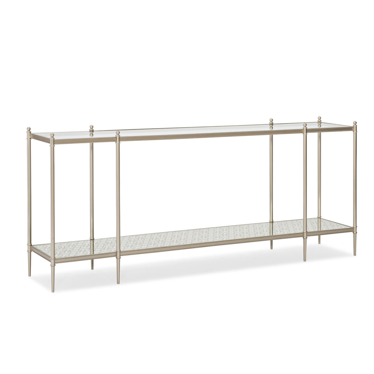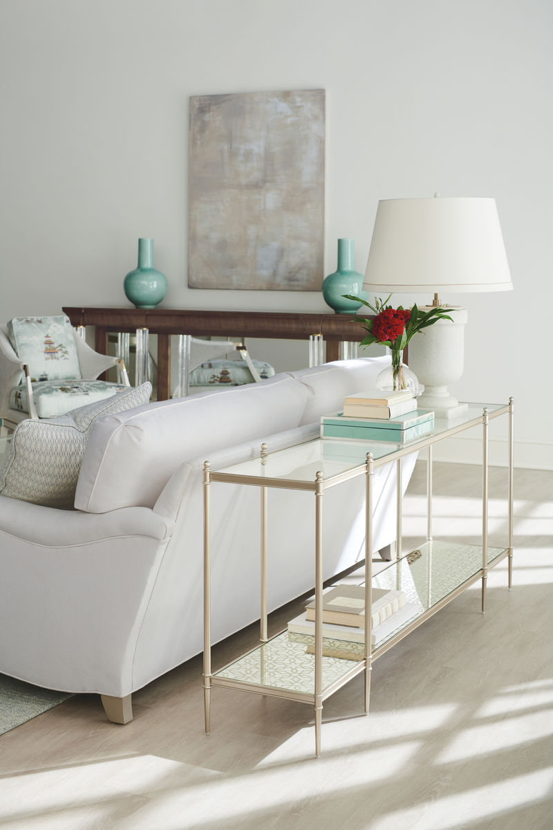 Выразите свой личный стиль с помощью консоли от производителя американской мебели Caracole - PERFECTION. Минималистичный дизайн изящно масштабируется и идеально вписывается в любую обстановку. Современное сочетание материалов включает в себя столешницу из прозрачного стекла, металлическую раму цвета Neutral Metallic и нижнюю полку, изготовленную из зеркала с узором в оттенке с эффектом металлик (Silver Leaf). Хранение, сервировка или демонстрация — этот стильный предмет подходит для любого случая.