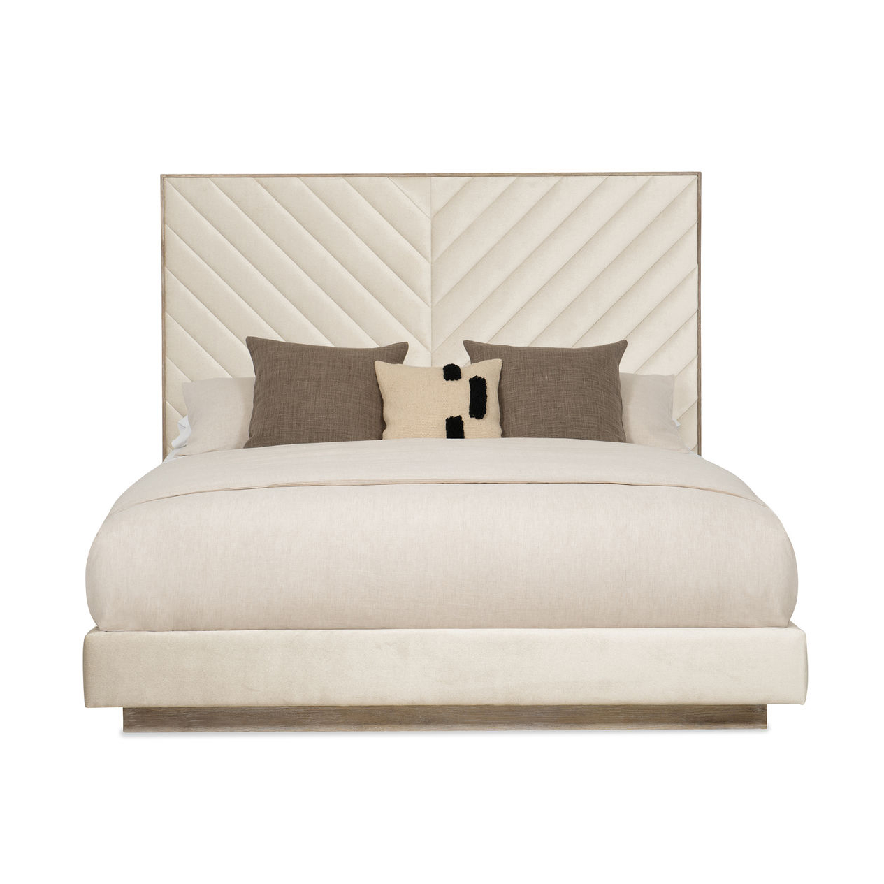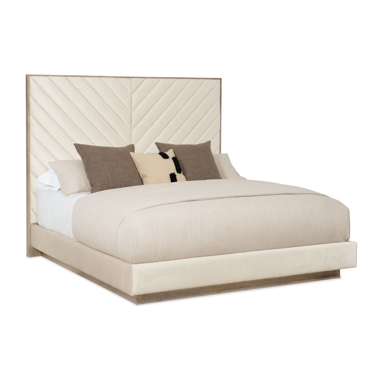 Выразительная кровать Meet U in the Middle, изготовленная американским мебельным брендом Caracole, придающая спальне современный вид, — настоящий интерьерный шедевр. Ее высокое, массивное изголовье в вертикальной стяжке с завораживающим шевронным паттерном обрамлено деревянной рамой в светло-коричневой отделке с текстурой ясеня (Ash Driftwood). Кровать, кажется, парит над землей, подвешенная на изысканном деревянном основании, также в финише Ash Driftwood.