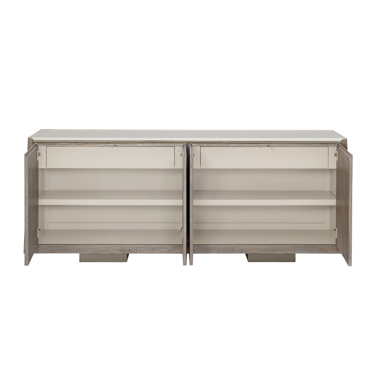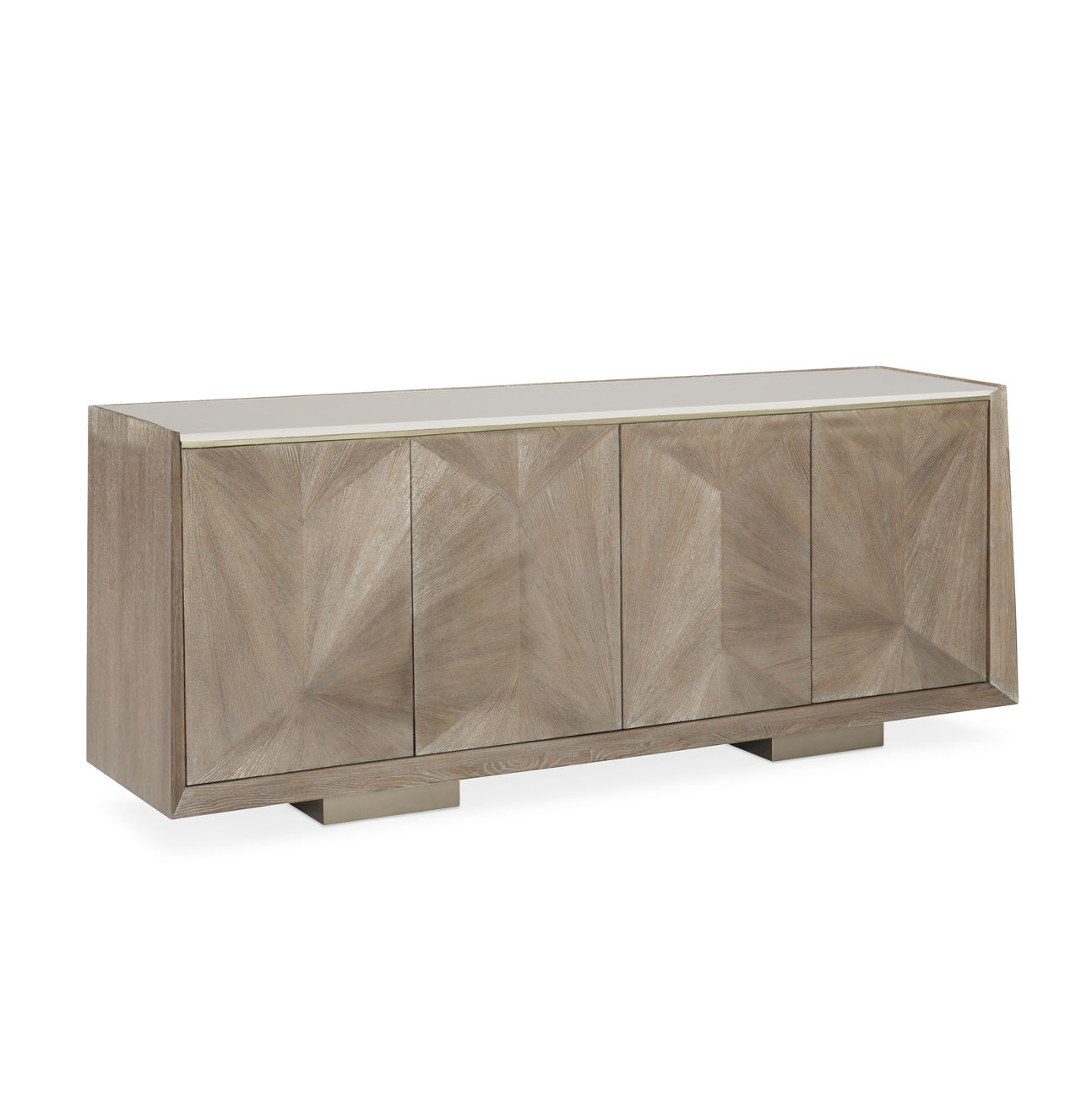 Великолепный буфет Point of View, изготовленный американским мебельным брендом Caracole, заставит вас поменять точку зрения. Его корпус украшен необыкновенными линейными узорами шпона и увенчан каменной столешницей, которая обеспечивает долговечность и удобство использования. Ножки в глянцевом золотистом финише и нежная отделка с текстурой ясеня (Ash Driftwood) передают расслабленное настроение, а штрихи оттенка Sundance Gold придают поверхности нотку роскоши. Четыре дверцы с сенсорными защелками скрывают полностью законченный интерьер в бежевых тонах, предлагающий достаточно место для хранения.
