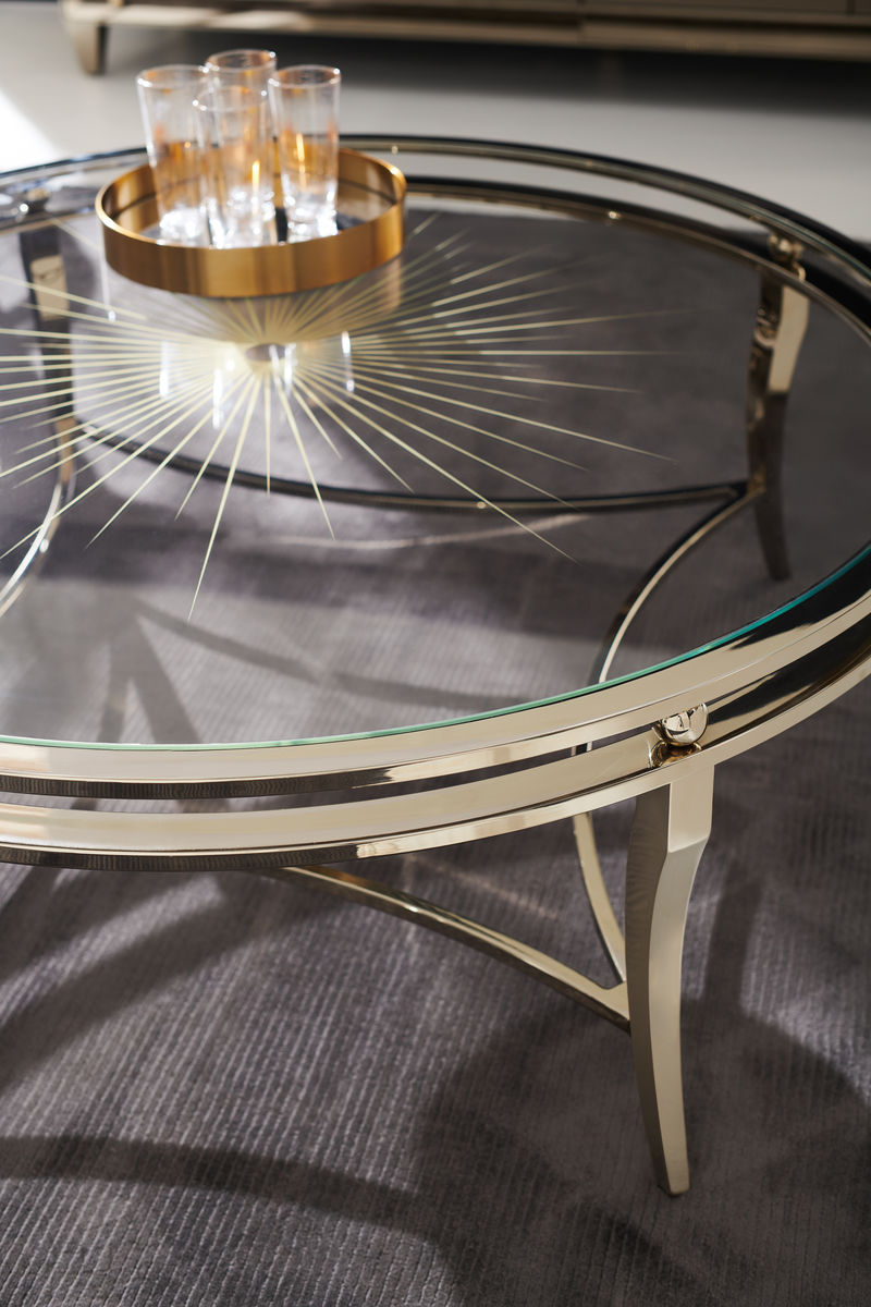 Несмотря на классическую форму, журнальный столик A Star Is Born воспринимается совершенно по-новому: столешницу изделия украшает рисунок в виде золотой звезды, нанесенной на прозрачную поверхность закаленного стекла в технике шелкографии.