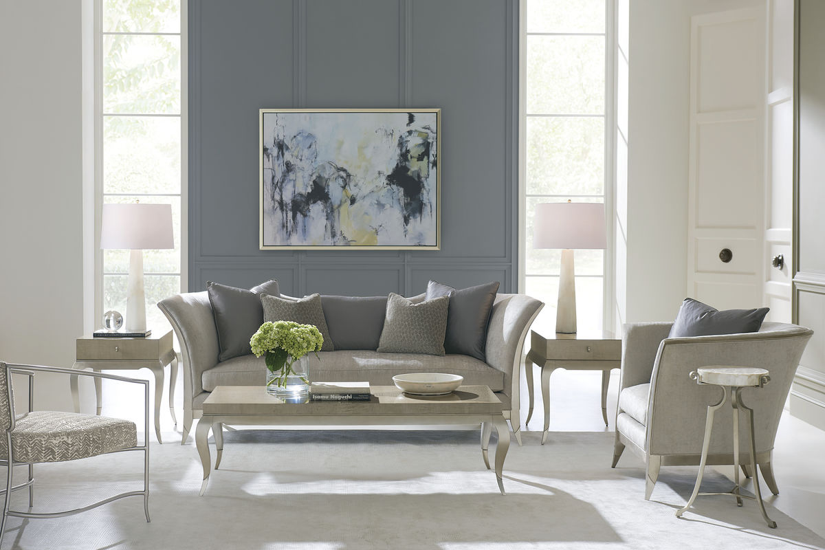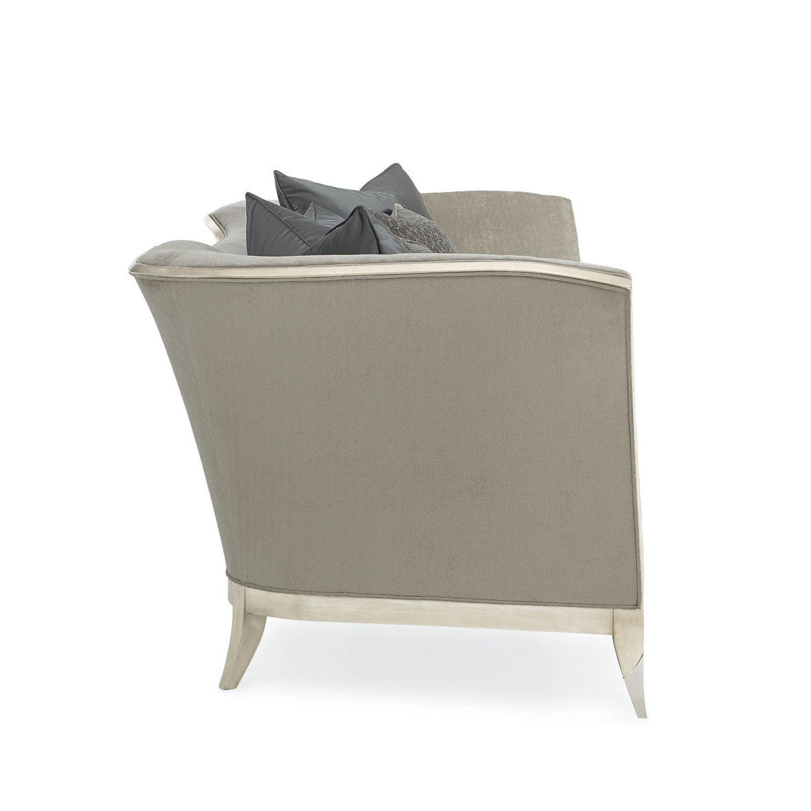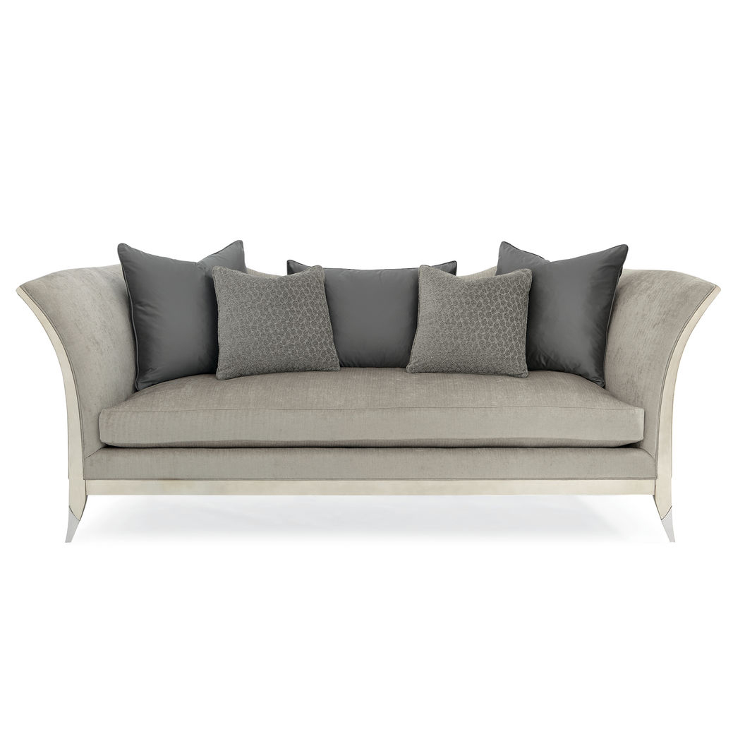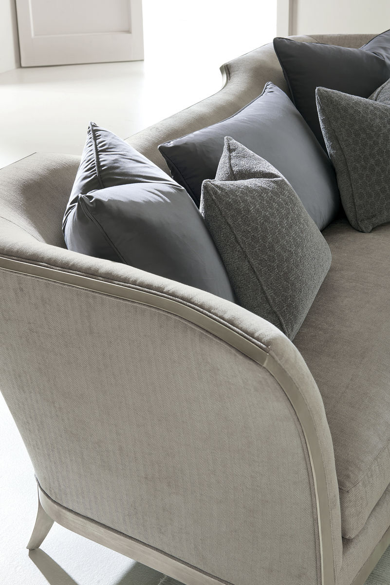 Эстетика этого роскошного дивана строится на сочетании стиля современной классики с абсолютным удобством. Легкий скульптурный силуэт изделия умело подчеркивает тонкий деревянный каркас с серебристой отделкой и элегантным изгибом в центре спинки. Обивка из мягкой ворсовой ткани с рисунком «в елочку» стального цвета и элегантные декоративные подушки натуральных оттенков дарят дополнительный комфорт, а металлические хромированные наконечники на зауженных ножках добавляют модели очарования, характерного для многих моделей американского бренда дизайнерской мебели Caracole.