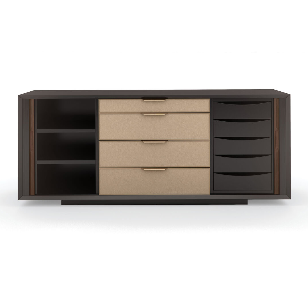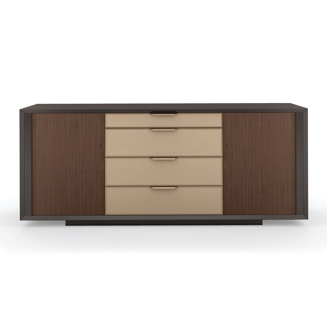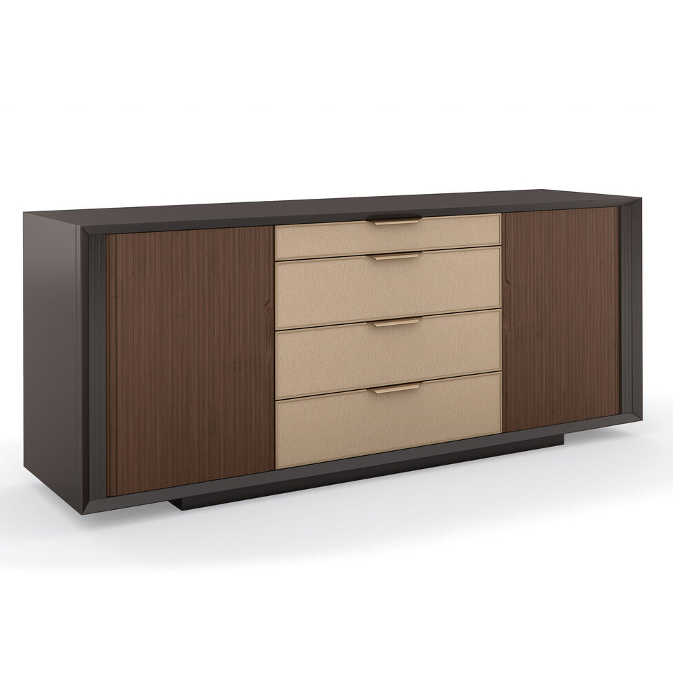 Буфет Around The Corner в стиле середины века, представляющий собой мастерское сочетание формы и функциональности, вызывает интерес своим линейным дизайном и множеством вариантов хранения. Раздвижные дверцы в отделке Rich Walnut добавляют текстуру и контраст к отделке Dark Chocolate. Четыре центральных ящика с виниловыми фасадами, обрамлены окантовкой цвета шампань, украшены узором, напоминающим струйки дождя по оконному стеклу. Возможности хранения обеспечивают две стационарные полки слева и пять выдвижных ящиков с плавным закрыванием справа. Современный и многофункциональный дизайн с четкими линиями хорошо подходит для интерьеров гостиной, столовой и спальни.
