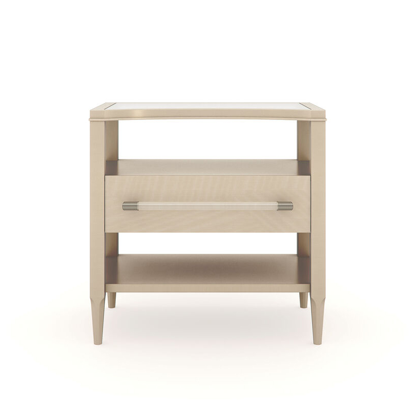 Внося ноту непринужденного гламура, прикроватная тумба Clearly Open привносит бескомпромиссную красоту в интерьеры спален и гостиных комнат. Грациозные изгибы сходятся с чистыми линиями в изысканном сочетании отделки, органических текстур и материалов. Изгиб в форме полумесяца придает интересную деталь столешнице из матового стекла, красиво сбалансированной на основании Champagne Pearl. Под и над выдвижным ящиком цвета Natural Glow находится открытая система хранения ваших любимых предметов декора и книг. Прозрачная акриловая ручка завершает образ, придавая ему особый шарм.