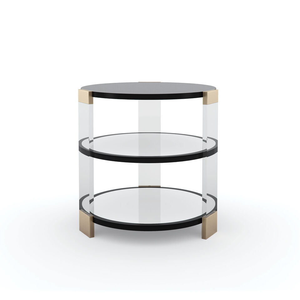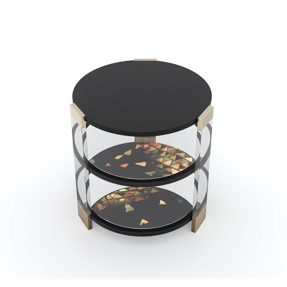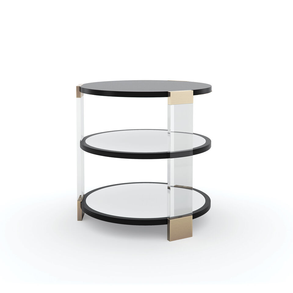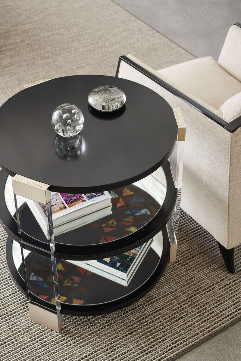 Боковой столик Go Around It - великолепный образец элитной мебели от бренда Caracole. Столешница и две полки цвета Tuxedo Black словно парят на прозрачных акриловых стойках, вызывая интерес, но не навязывая его. Центральная и нижняя полки зеркальные, что позволяет увидеть Шелковый путь, оригинальное произведение искусства Ирис Фенг, выполненное цифровым способом и нанесенное вручную под полкой сверху. Металлические акценты цвета шампань создают мерцание и добавляют характера изделию.