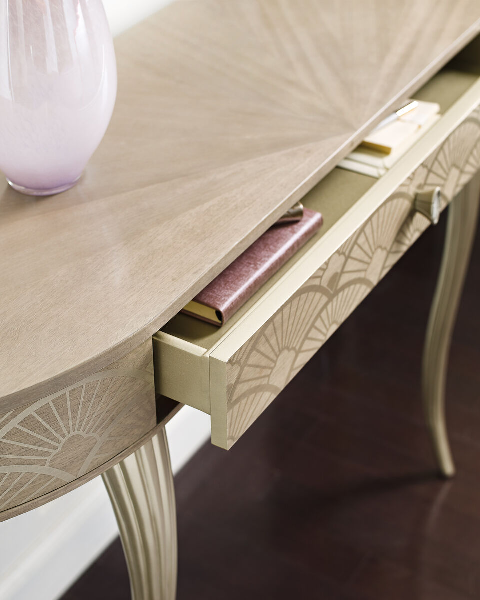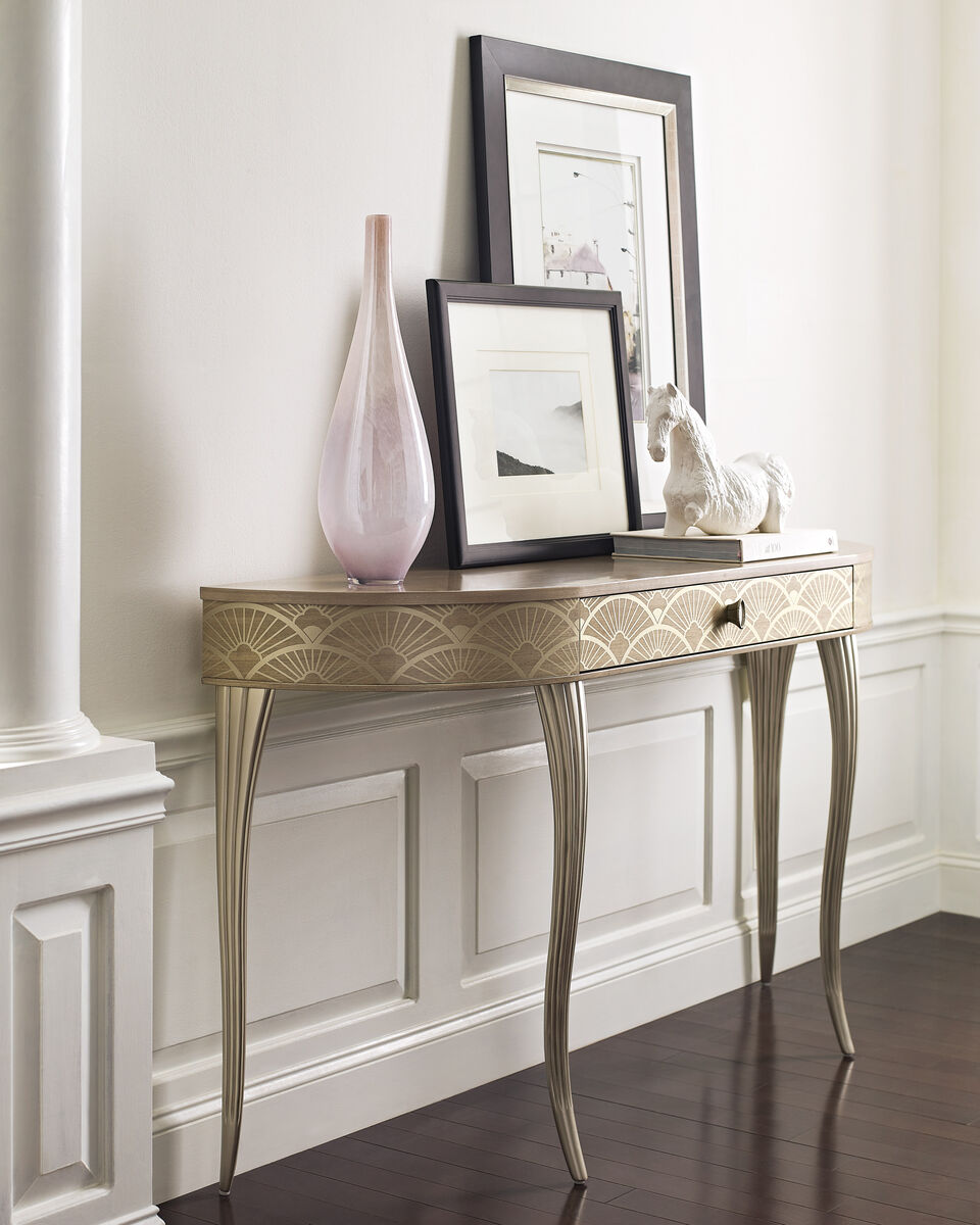 Создайте незабываемое впечатление с консольным столиком Lillian, его уникальная трафаретная отделка добавляет элегантности и стиля. Мотив веера, представленный на консоли, является современным интерпретацией ар-деко стиля. Консоль дополнена ювелирной фурнитурой с керамической вставкой и изящными изогнутыми ножками цвета Soft Radiance, придающими ей изысканность.