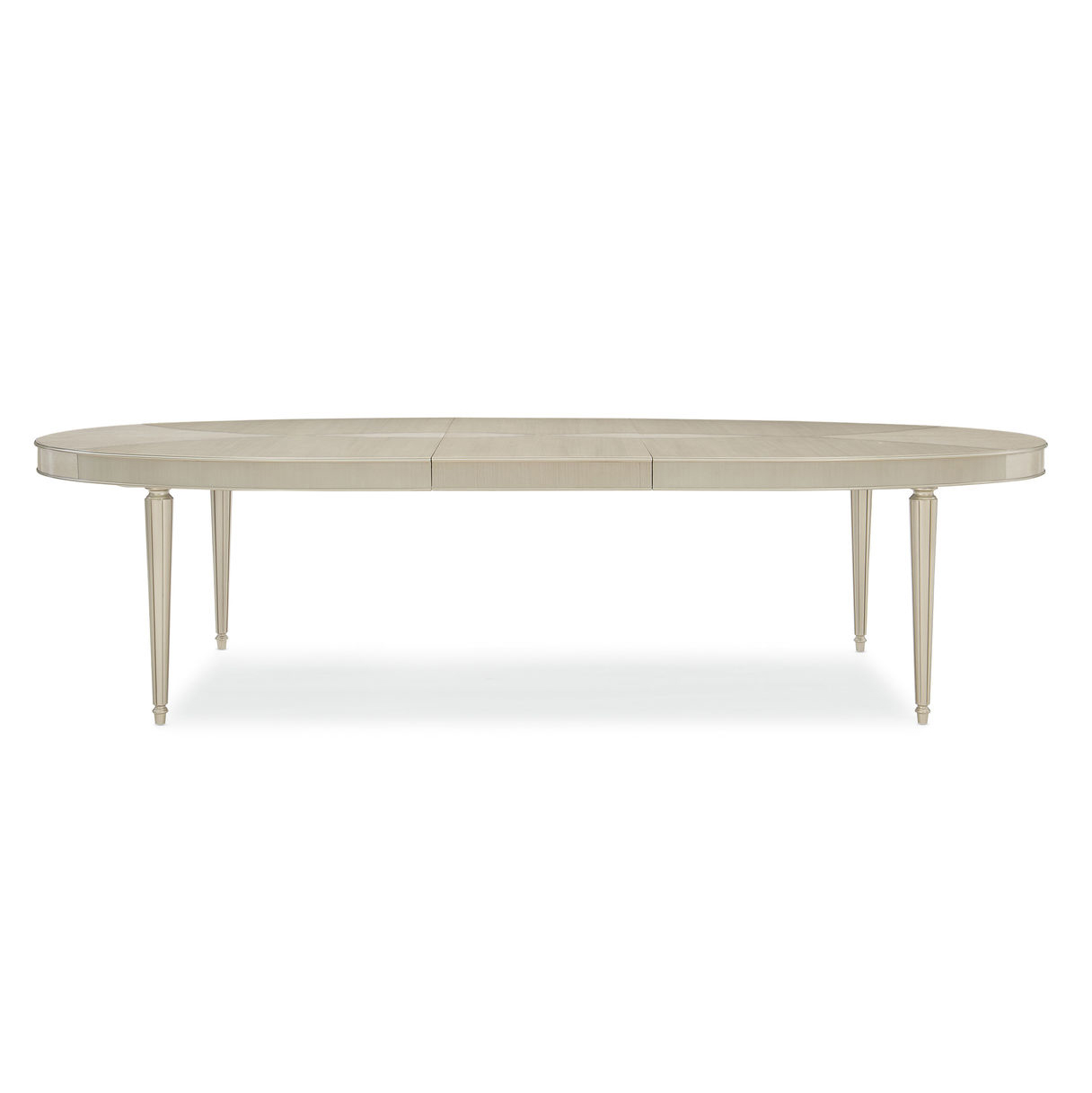 Фартук стола обрамляется уникальным узором, что дополняет его внешний вид и добавляет неповторимого шарма. Конические ножки, окрашенные в изящный цвет Soft Silver Paint, украшены металлическими наконечниками цвета Lightly Brushed Chrome, что придает столу стильный и современный вид.