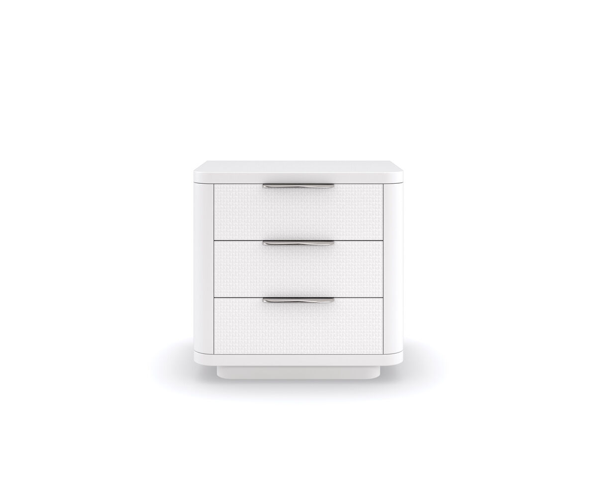 Эта прикроватная тумбочка с изящной отделкой Cloud White придает интерьеру очарование и легкость. Закругленные края тумбы создают уютную атмосферу, а текстурированные фасады ящиков придают ей тактильную привлекательность, напоминая тканевый узор мини-плитки. Фасады также дополнены стильными защелками в форме чашечек для пальцев, изготовленными из сатинированного никеля, что добавляет тумбе характерный шарм.
