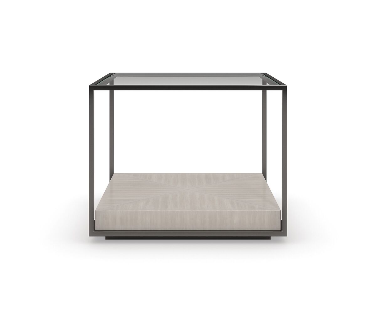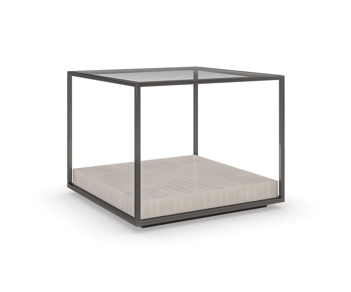 Как в комплекте, так и отдельно, архитектурный дизайн позволяет создать постоянно меняющийся журнальный столик Open Air, который можно интерпретировать по-разному. Рамка из металла бронзового цвета и полка с перламутровой отделкой Moonstone подчеркивают линейную текстуру шпона Koto. Увенчанный стеклом со скошенными краями, столик выглядит визуально легким и обладает приподнятым, непринужденным стилем. В сочетании со столиком Solid Ground, обтянутым искусственной шагренью, создается многомерная, многослойная коллекция с роскошной привлекательностью.