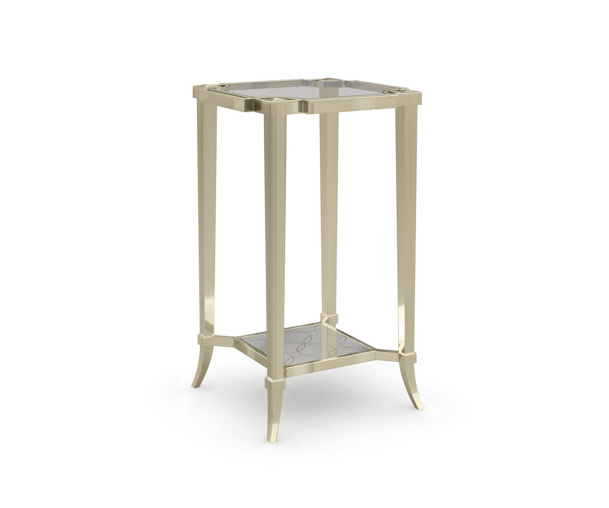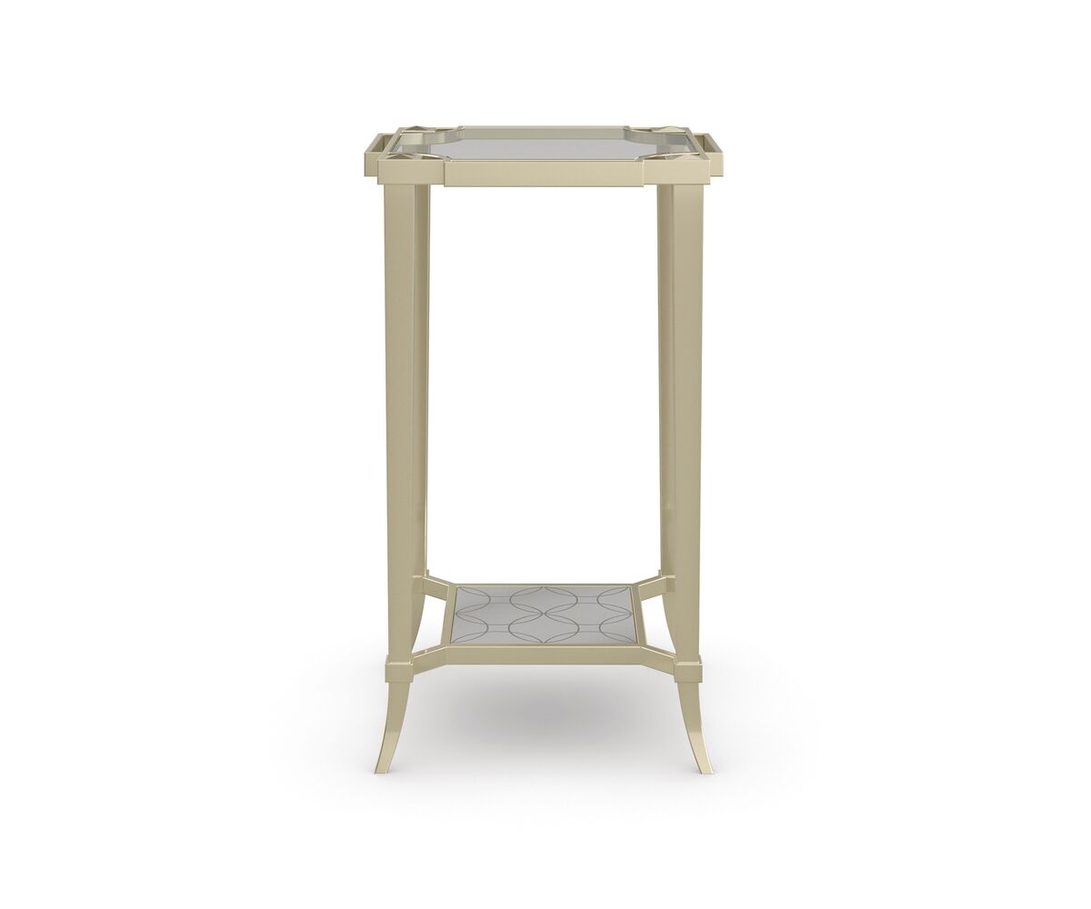 Боковой столик Simply Charming идеально подходит для акцента в любой комнате, сочетая замысловатые детали с роскошными материалами и мягкой золотой отделкой. Высокий куб с квадратными металлическими ножками, расположенными так, чтобы компенсировать дугообразные углы, поддерживает скошенную стеклянную столешницу в тонкой двойной раме. Небольшая зеркальная полка с гравировкой из сусального серебра на задней стенке подчеркивает его элегантность. Отлично сочетается с журнальным столиком Prince Charming и боковым столиком Third Time's A Charm.