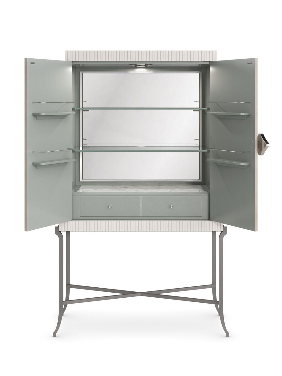 Фурнитура Majestic Gold с потрескавшейся акриловой вставкой добавляет барному шкафу блеска и утонченности. Внутри его светло-голубого интерьера расположено светодиодное освещение с сенсорным диммером, зеркальная задняя панель и достаточно места на полках для хранения различных развлекательных предметов.