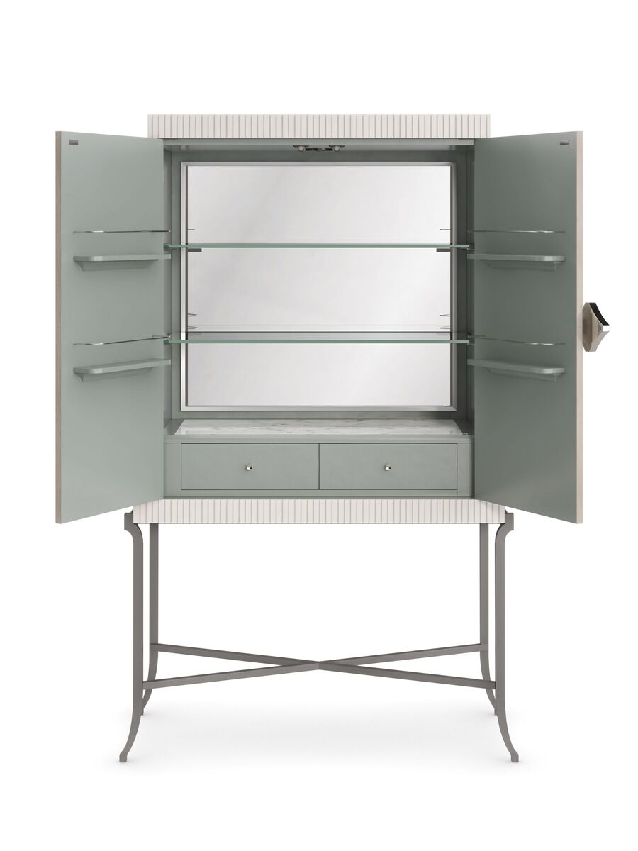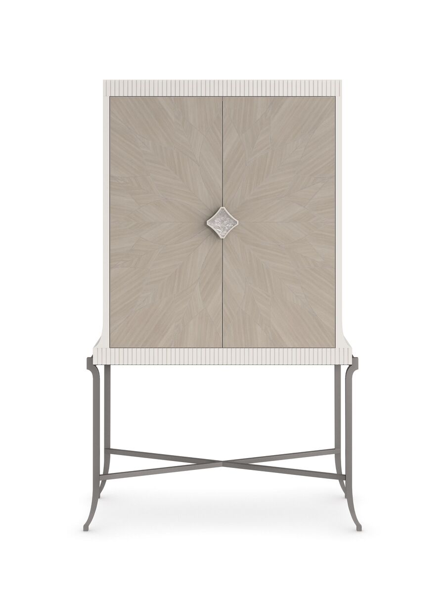 High Expectations - это барный шкаф, который излучает красоту как внутри, так и снаружи, и станет великолепным дополнением к интерьеру вашей гостиной или столовой. Поставленный на тонкой металлической раме, он обладает высокими дверьми, искусно отделанными шпоном кото, создающими романтический рисунок в виде розетки, который искусно подчеркивают деревянные бусины, окрашенные в жемчужно-белый цвет.