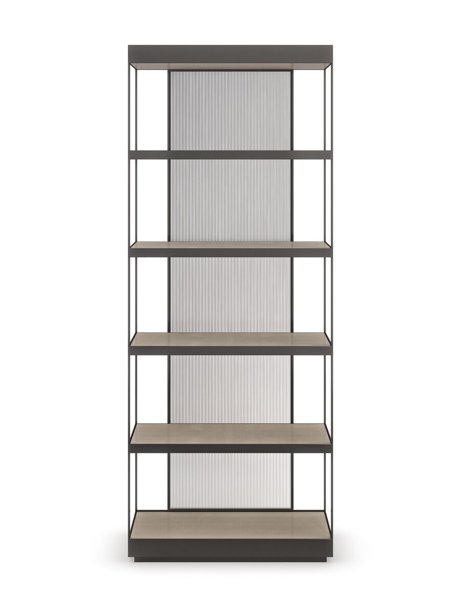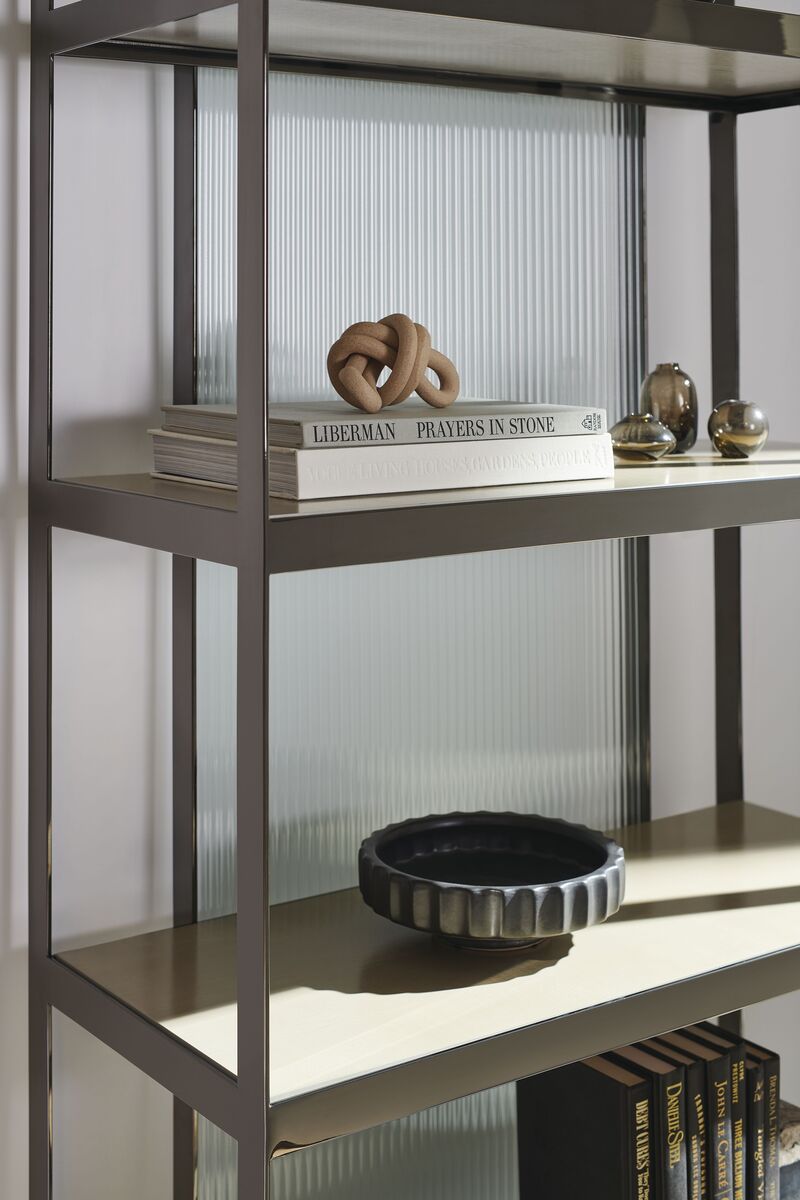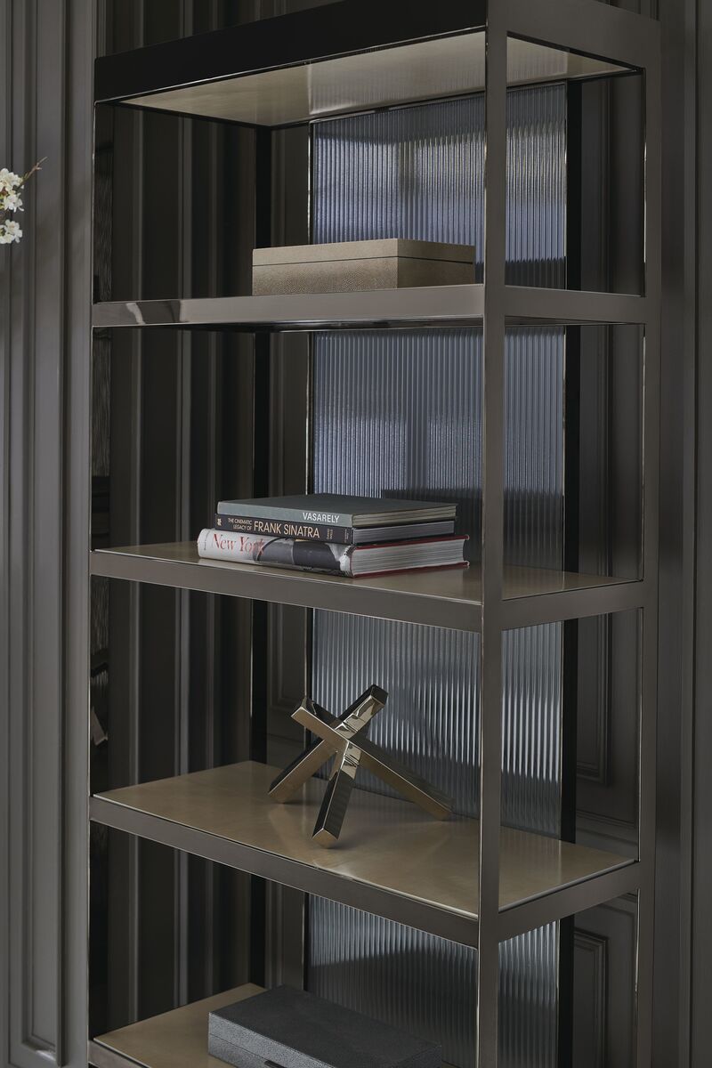 Каскадная задняя панель, выполненная из тростникового стекла, придает стеллажу объем и ловит свет, создавая уютное отражение в металлической раме Deep Bronze. Shelf Life оснащен четырьмя съемными полками, изготовленными с тщательной проработкой и отделанными японским шпоном Сен в теплой серо-коричневой отделке.