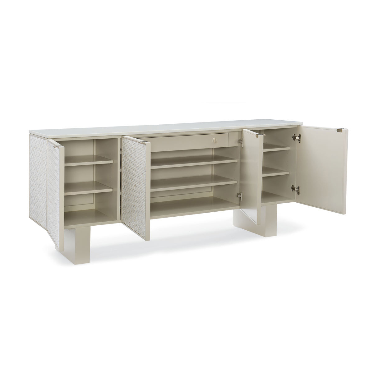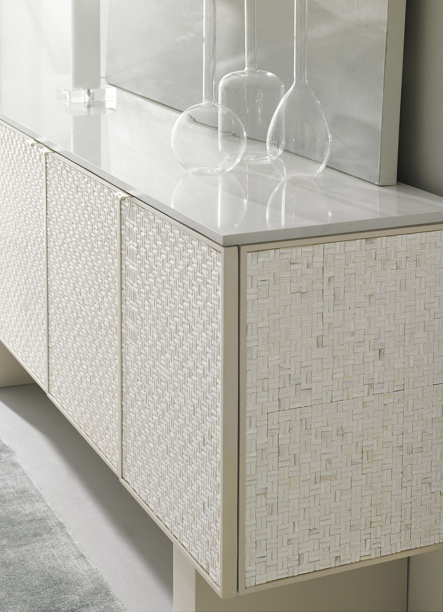 Буфет Bomb-Shell привлекает внимание трехмерными прямоугольниками перламутровой раковины, выложенными в плетеный узор, что придает ему уникальный блеск и сияние. Белый камень облицовки и регулируемые ножки цвета Soft Taupe позволяют изменять высоту от уровня креманки до развлекательного центра. Четыре дверцы со скрытыми ручками и обилие места для хранения делают Bomb-Shell центральным элементом комнаты.
