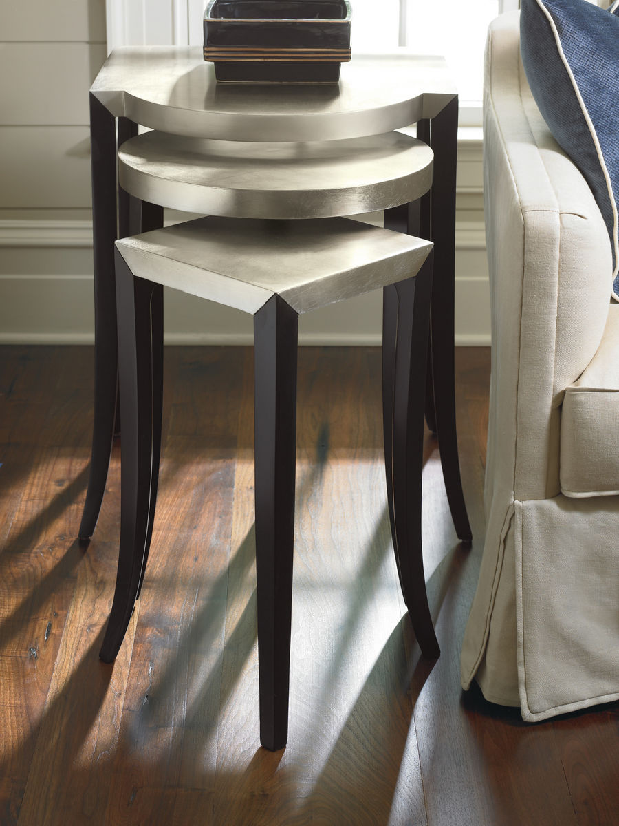 Дизайнеры ценят гнездовые столики, а с набором Out & About  возможности безграничны. Три столика различаются размером и формой. Самый большой стол имеет прямоугольную форму с полукругом на одной стороне, идеально подходящим для лампы. Средний столик круглый, а самый маленький квадратный. Слегка раздвинутые ножки из атласного эбенового дерева плавно переходят в столешницу, покрытую серебристым листом таупа, создавая четкую архитектурную деталь.