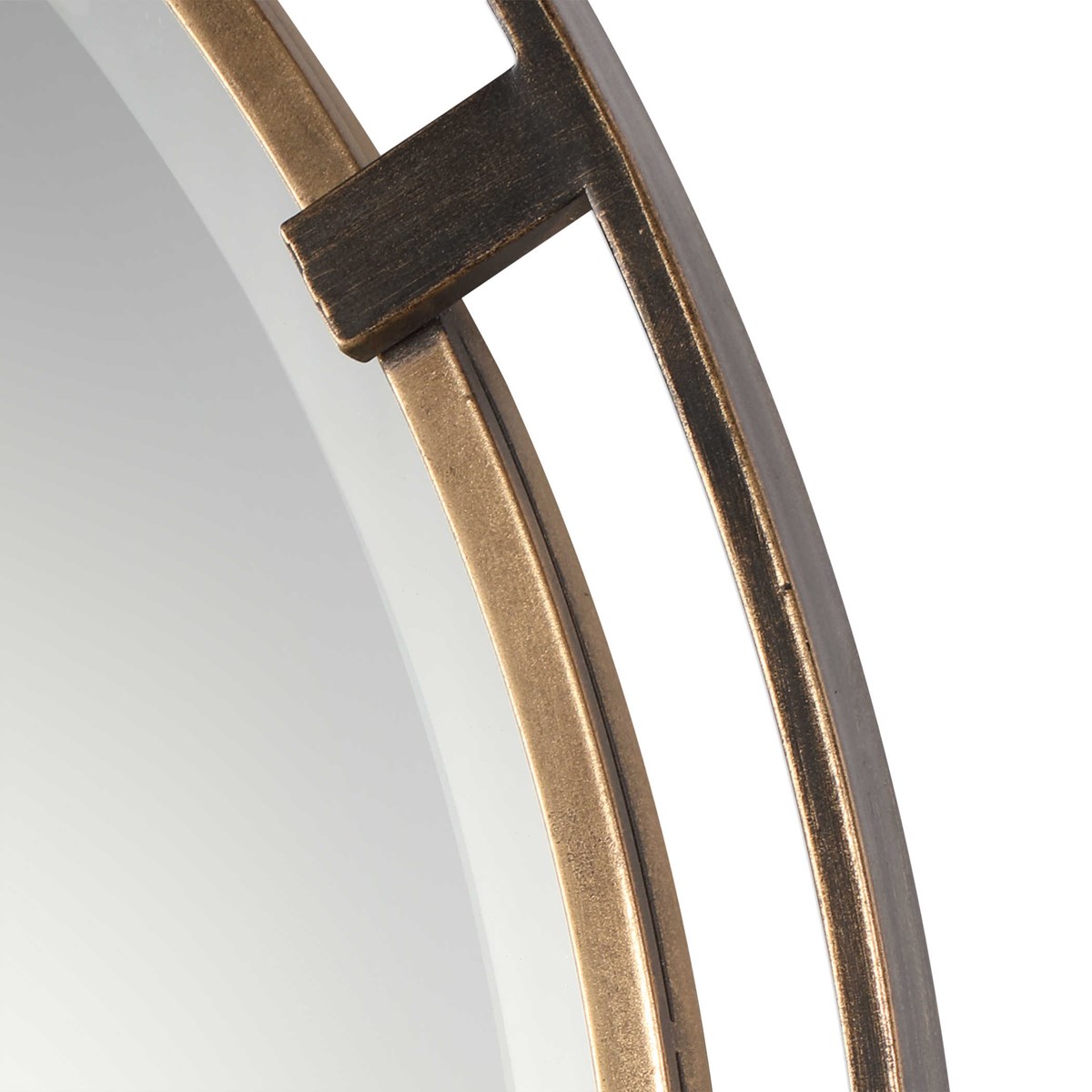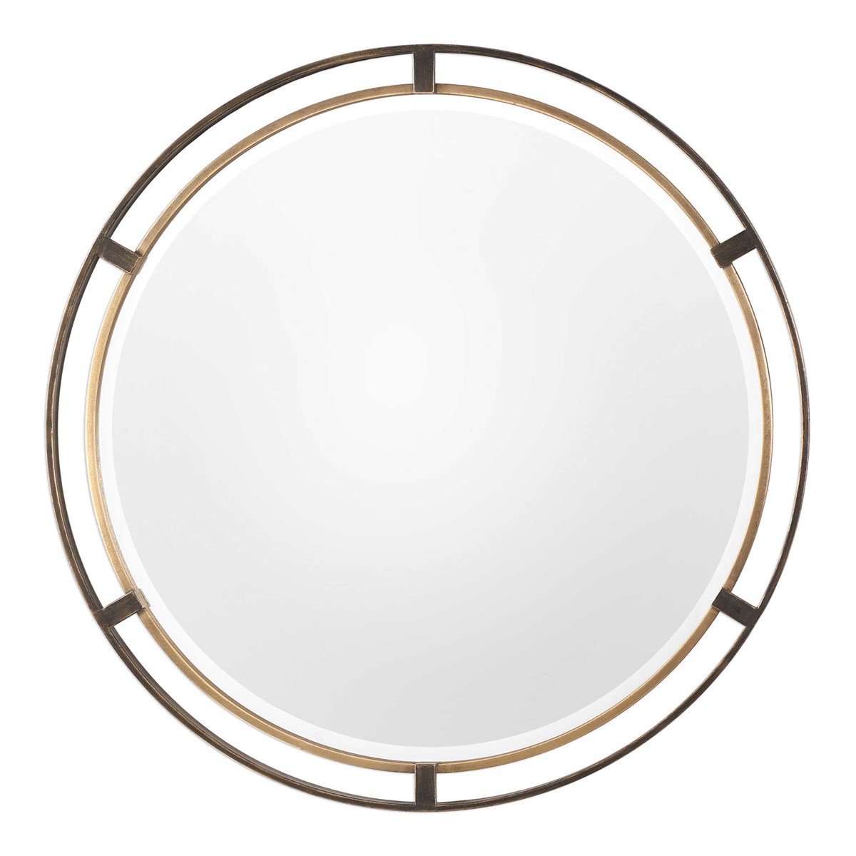 Зеркало Carrizo Round от американского бренда Uttermost - это изысканное изделие, которое будет прекрасным дополнением к вашему интерьеру. Его железная рама имеет трехмерный дизайн с внешней перекрывающейся рамой, отделанной состаренной деревенской бронзой, придавая ему старинный шарм. Внутренний центр рамы дополнительно подчеркнут акцентом на слегка состаренный золотой оттенок. Большой скос рамы составляет примерно 3 см, что добавляет этому зеркалу характер и стиль. Зеркало можно подвесить как горизонтально, так и вертикально, что делает его универсальным и элегантным аксессуаром.