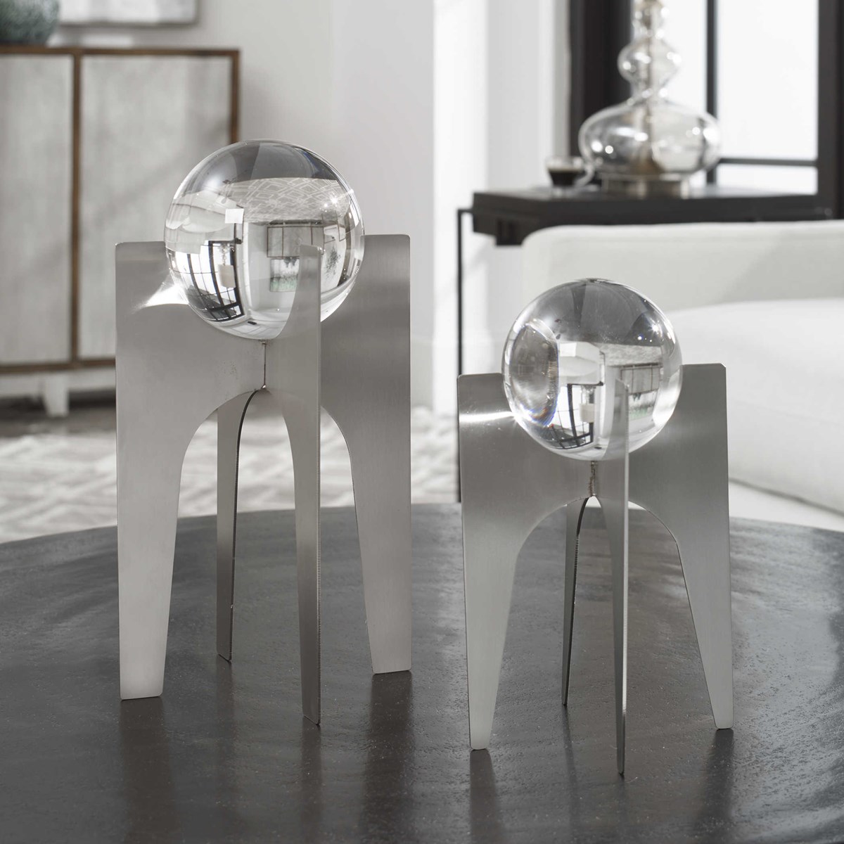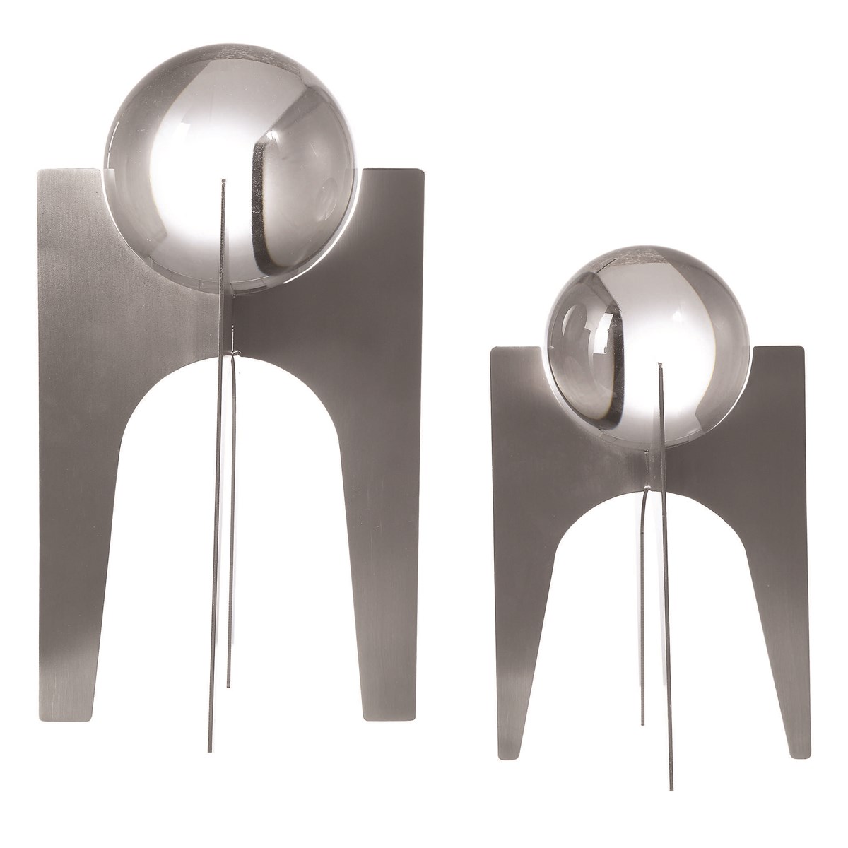 Элегантный настольный аксессуар Ellianna Silver представляет собой искусно выполненные хрустальные сферы, возвышающиеся на стойки из нержавеющей стали. Они украшены матовым серебристым покрытием, которое придает им изысканный и современный вид.
