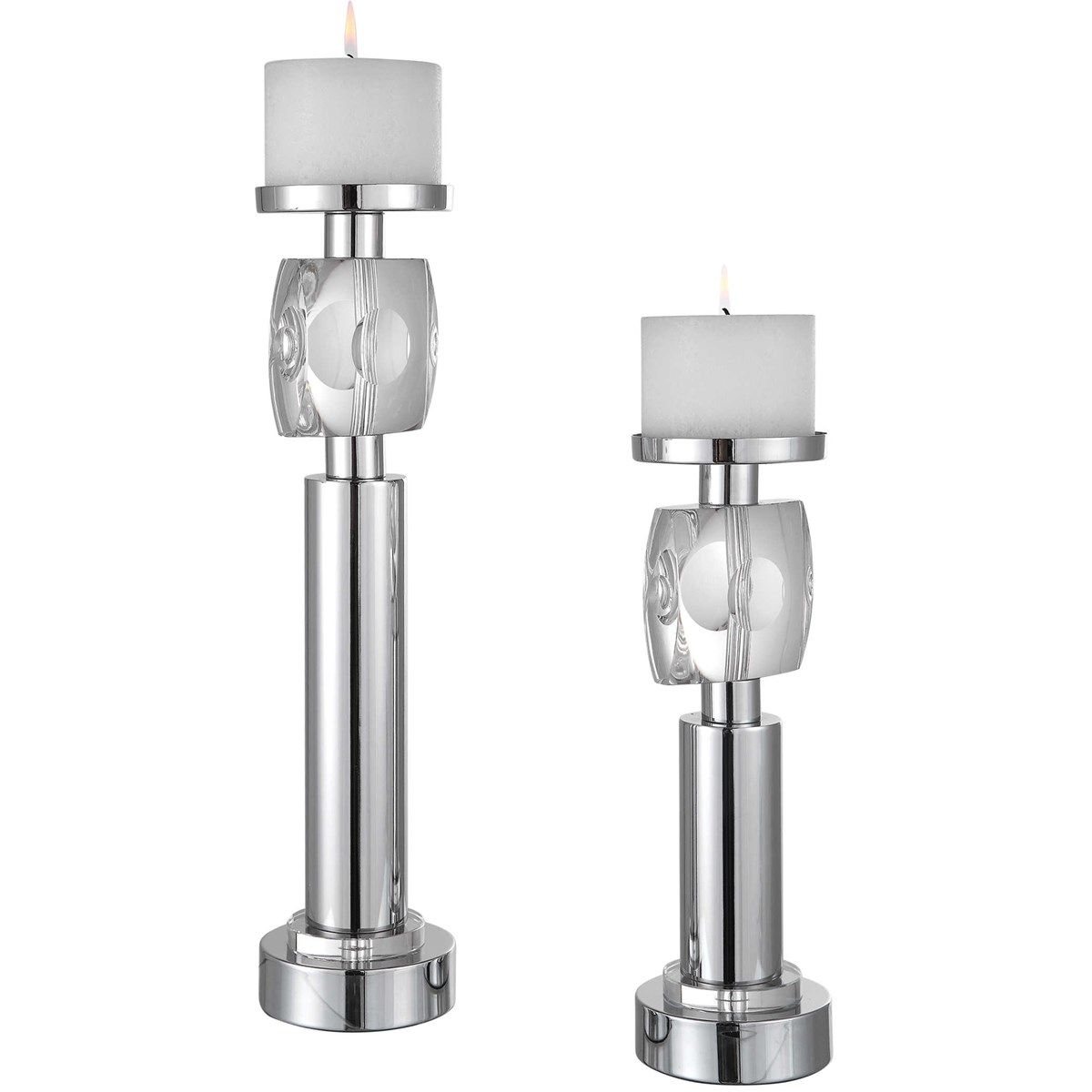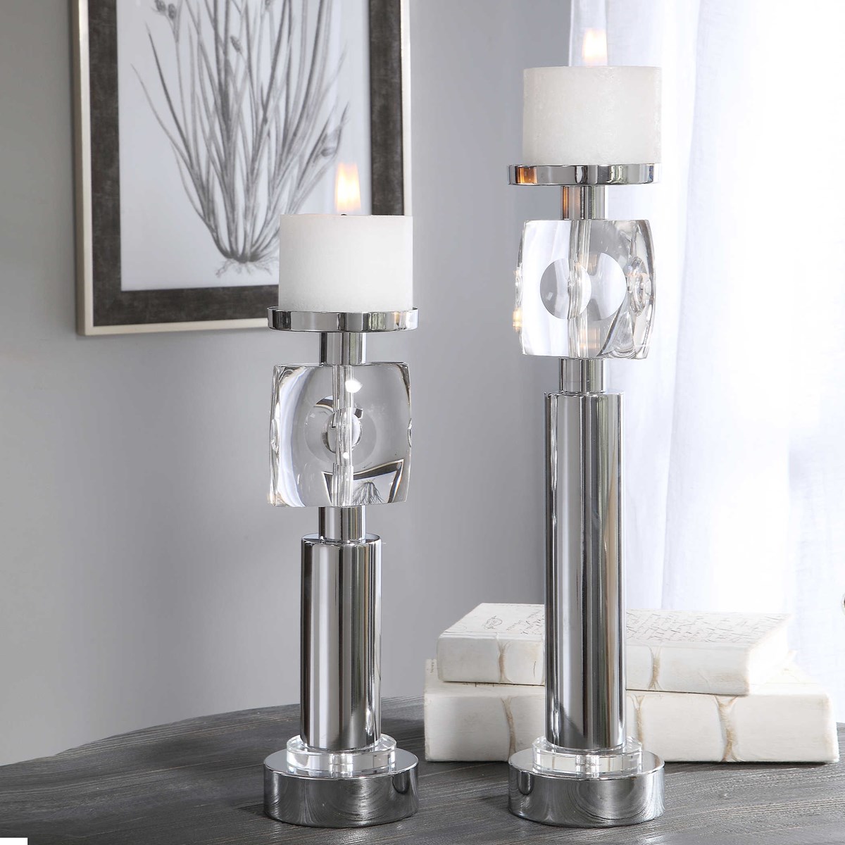 Подсвечник Kyrie - это истинное произведение искусства, которое привносит блеск и изыск в ваш интерьер. Элегантная коллекция из двух подсвечников, изготовленных из блестящего полированного никеля, приковывает внимание своей утонченной роскошью. Крупные квадратные вставки из кристаллов добавляют игры света и призматическую магию, создавая завораживающий эффект.