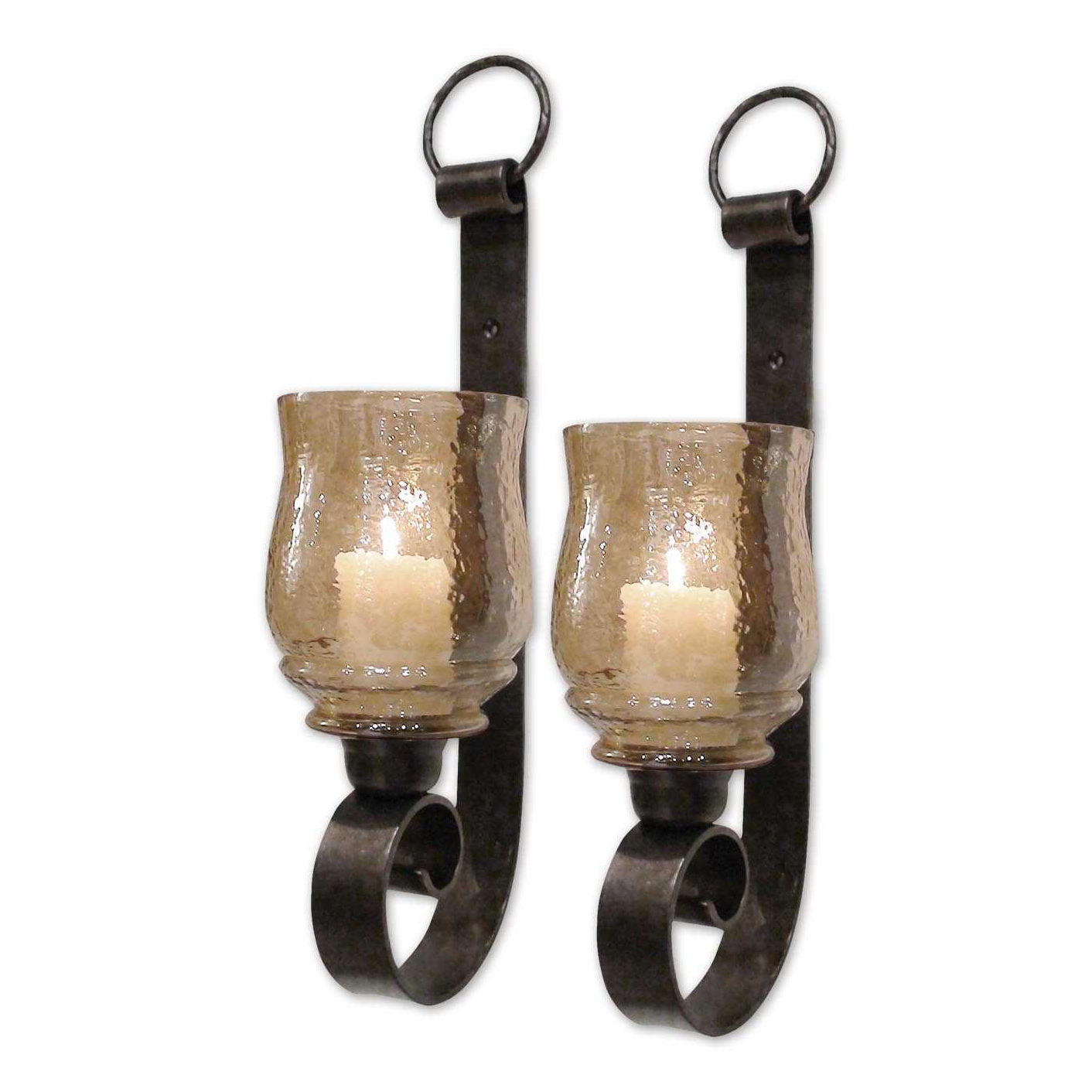 Их металлическая основа, отделанная под старинную бронзу, придает им элегантность и изысканность. Прозрачное янтарное стекло, окружающее свечи, создает завораживающее отражение света и тени, наполняя пространство атмосферой уюта и романтики.