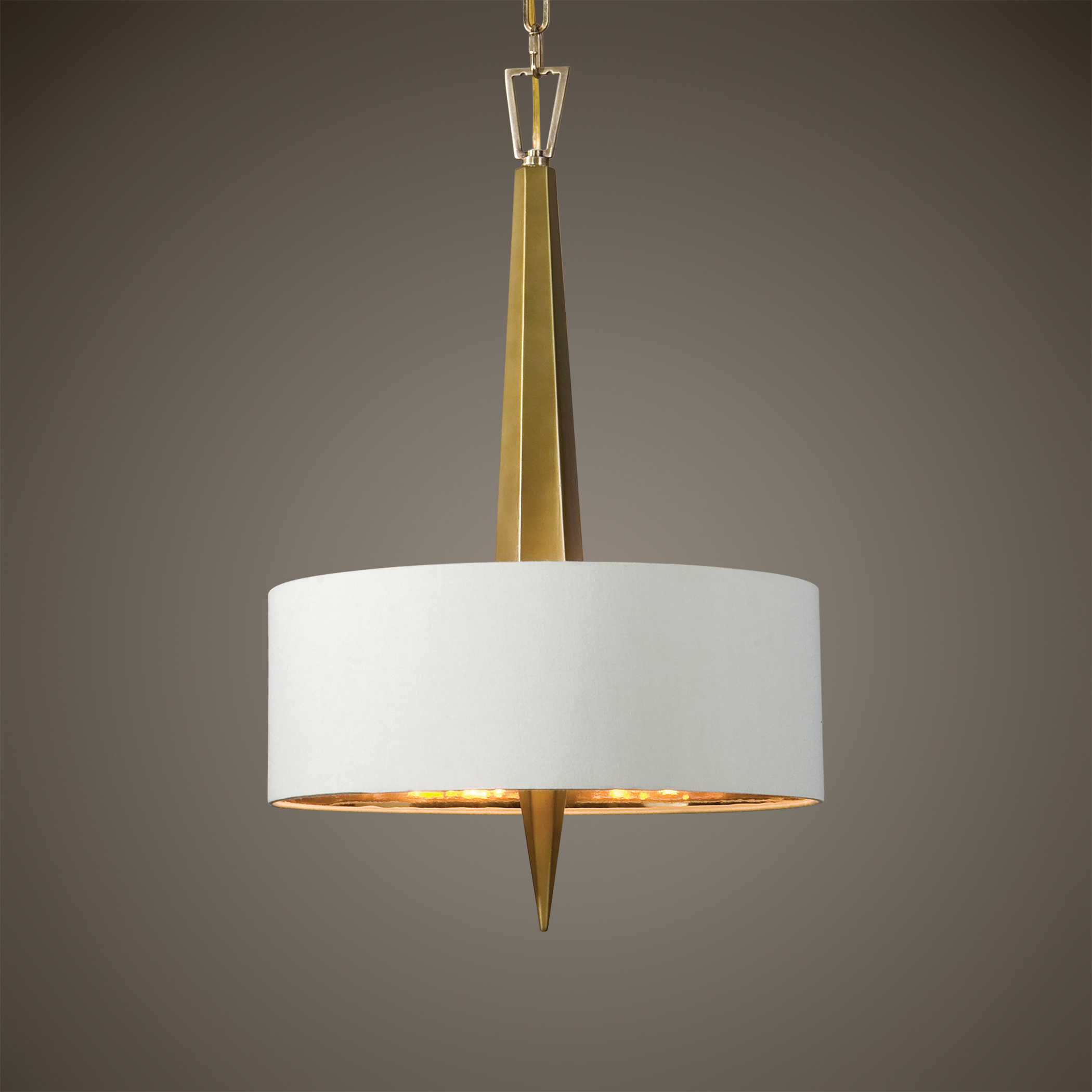 Бежевый абажур из льняной ткани с твердой обложкой и золотой внутренней отделкой придает этой люстре неповторимый шарм ар-деко и создает теплую и уютную атмосферу в вашем помещении.