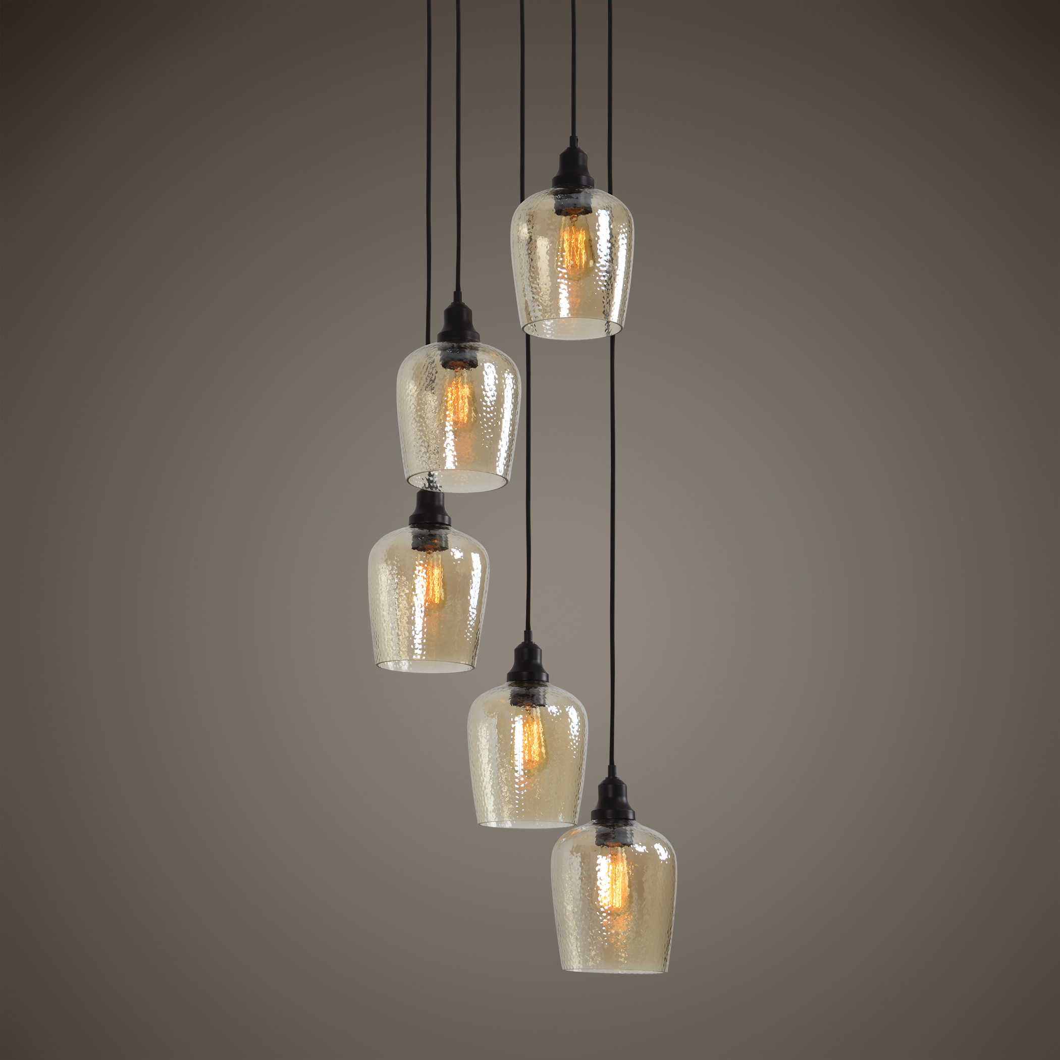 Приглашаем вас познакомиться с люстрой Aarush - 5-ламповым подвесным светильником, где насыщенное янтарное молотое стекло становится центром внимания. Его металлическая отделка выполнена в бронзовом цвете с масляным напылением, придавая светильнику изысканный вид.