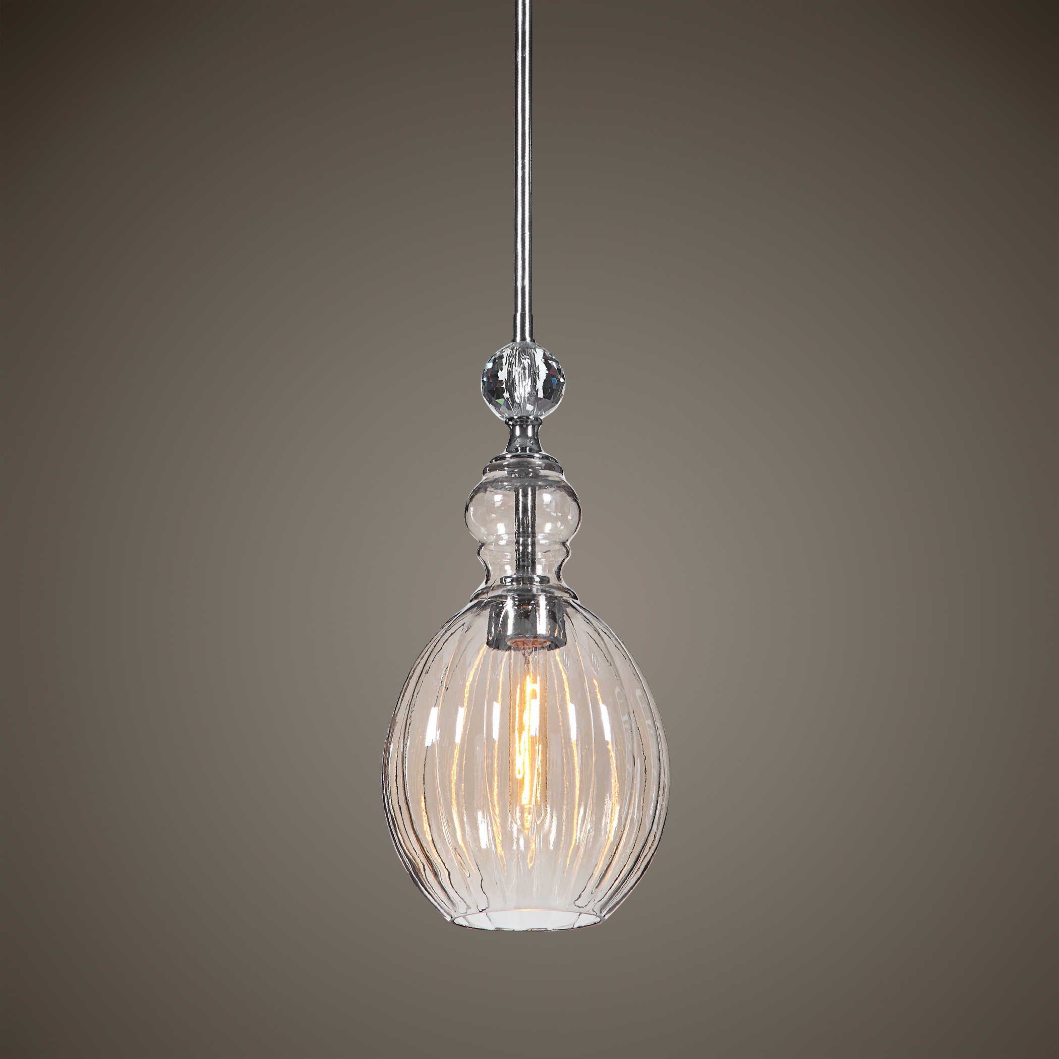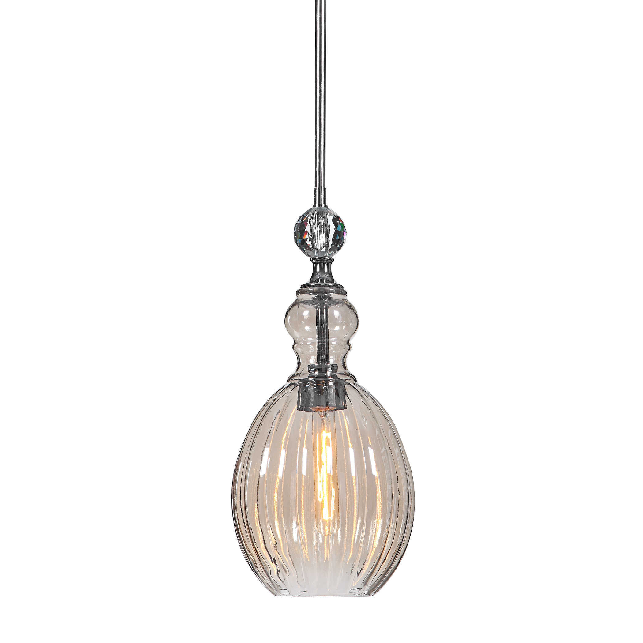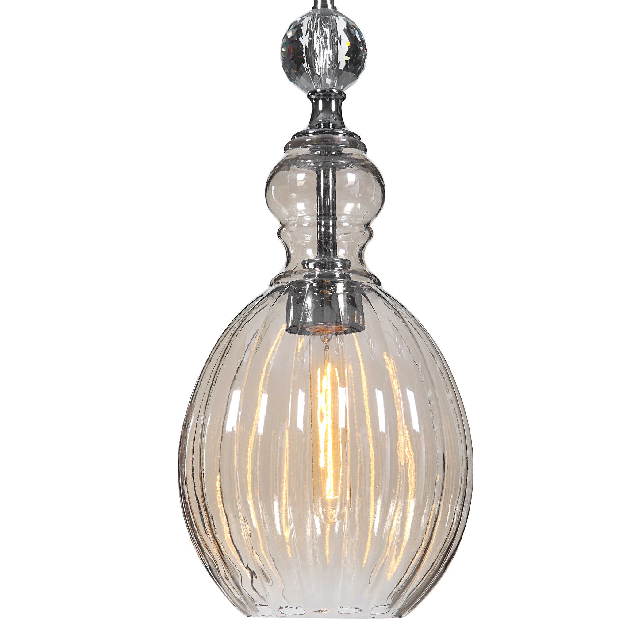 Люстра Gigi — это воплощение нежной женственности и изысканной элегантности. Сделанная с использованием стекла с коньячным покрытием и впечатляющим хрустальным шаром в центре, этот мини-кулон весом всего 1 литр очаровывает своей изысканностью.