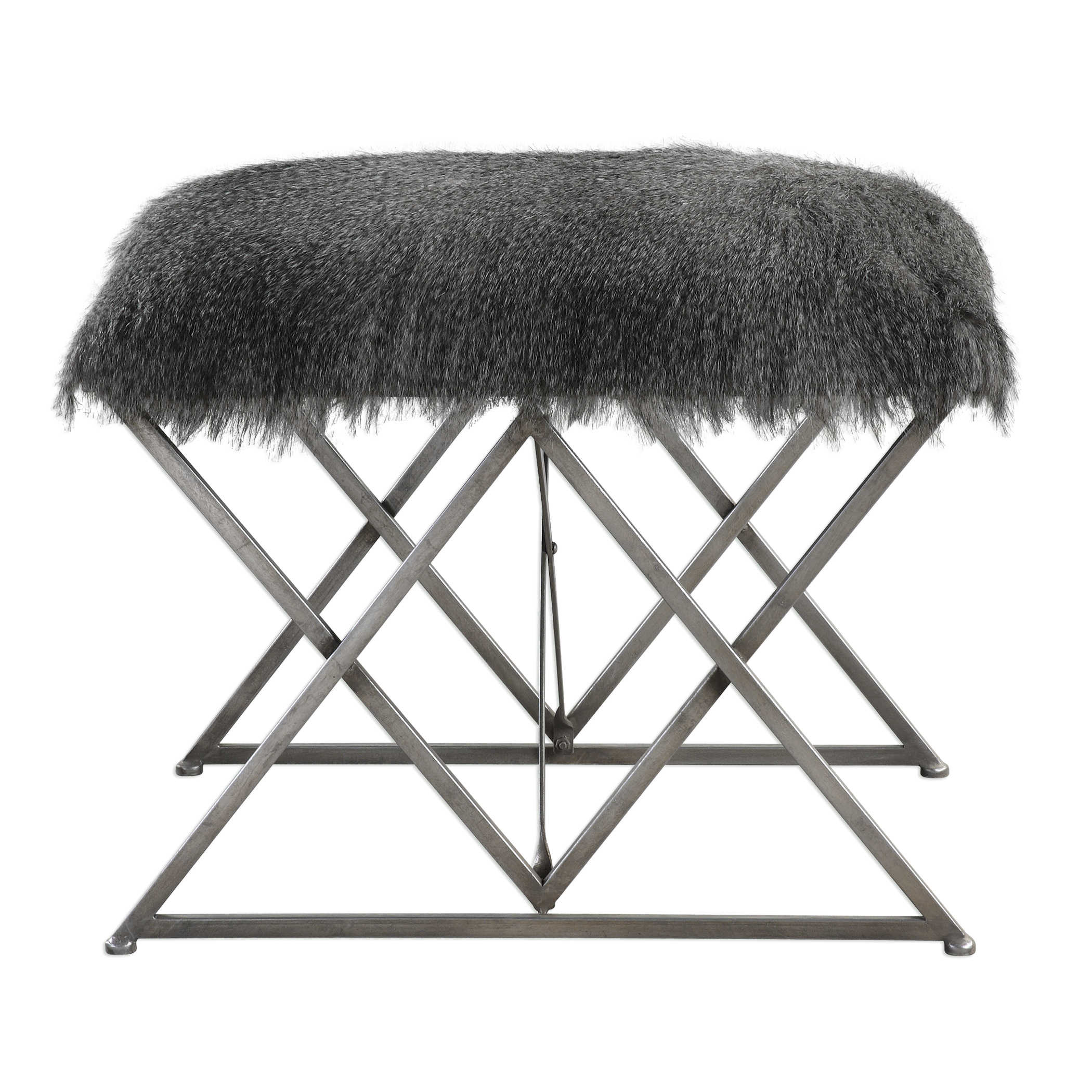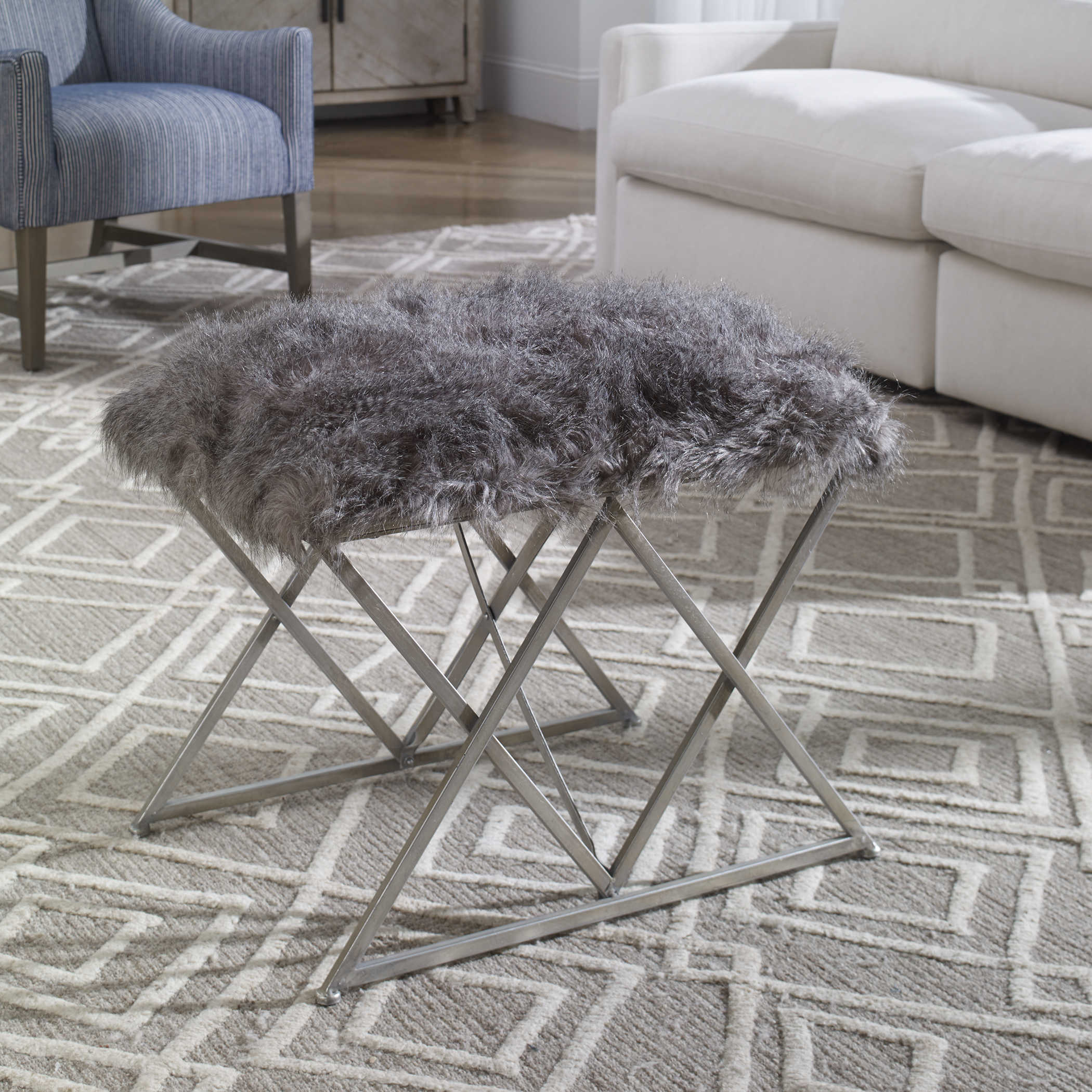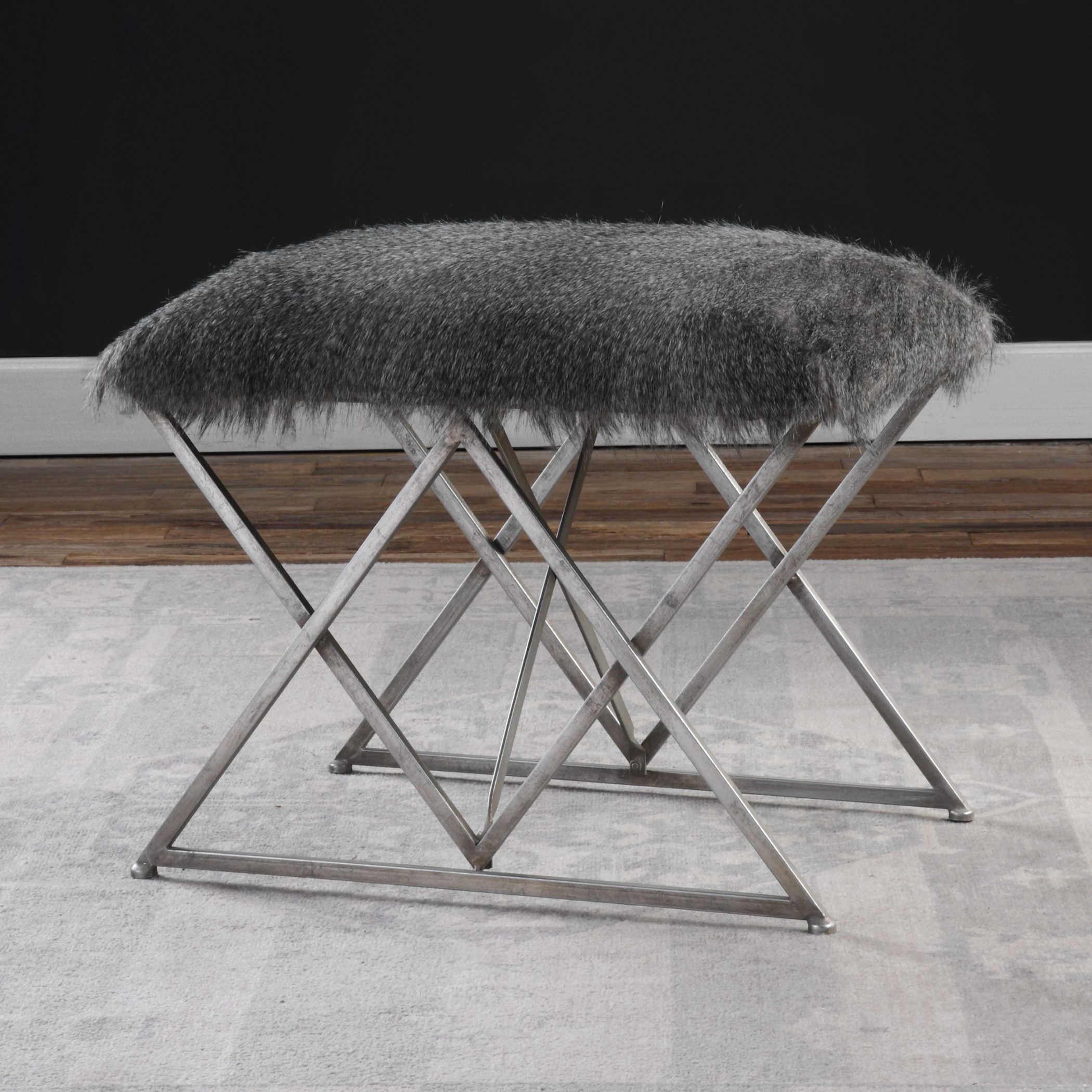 Эта маленькая банкетка Astairess - это произведение искусства, которое сочетает в себе роскошный плюшевый искусственный мех, вдохновленный природой, и разноцветные серые оттенки, создавая неповторимый аргайловый узор на ее основе из железа. Каждая деталь обработана вручную с применением теплой серебристой отделки, что придает ей уют и неповторимый шарм. Пушистый мех с мерцающими акцентами добавляет богатства и комфорта этой банкетке. Пожалуйста, обратите внимание, что могут возникнуть небольшие вариации в цвете меха, делая каждую банкетку уникальной.