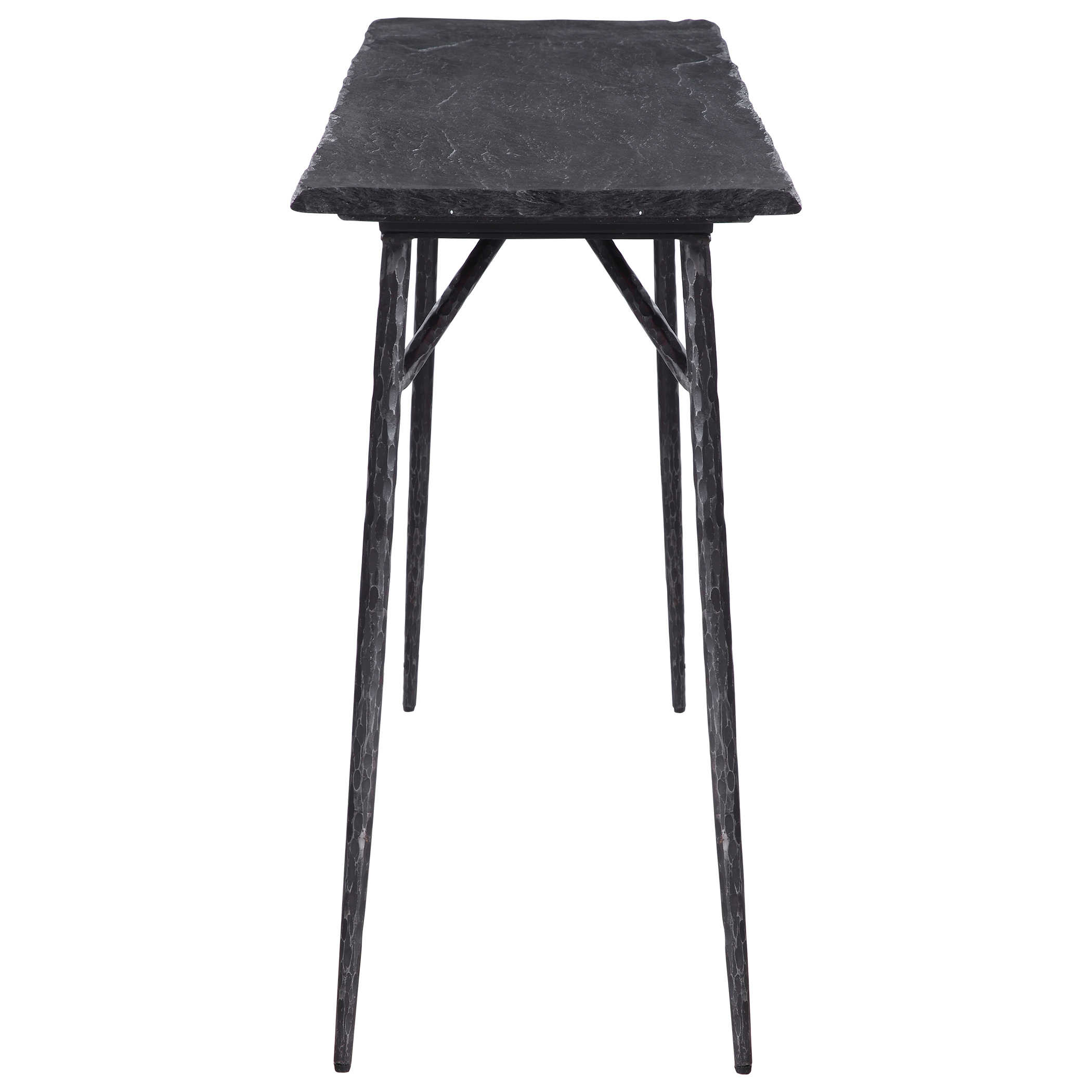 Консоль Kaduna представляет собой современное произведение с индустриальным стилем и неповторимым видом. Она изготовлена из черного сланца, который придает ей естественную текстуру с органическими сломанными краями. Консоль великолепно сочетается с железной козловой основой, на которой выделяются точеные черные детали. Каждый верх консоли имеет уникальные цветовые вариации, такие как крапчатость и естественные линии прожилок, делая каждый экземпляр уникальным и особенным.