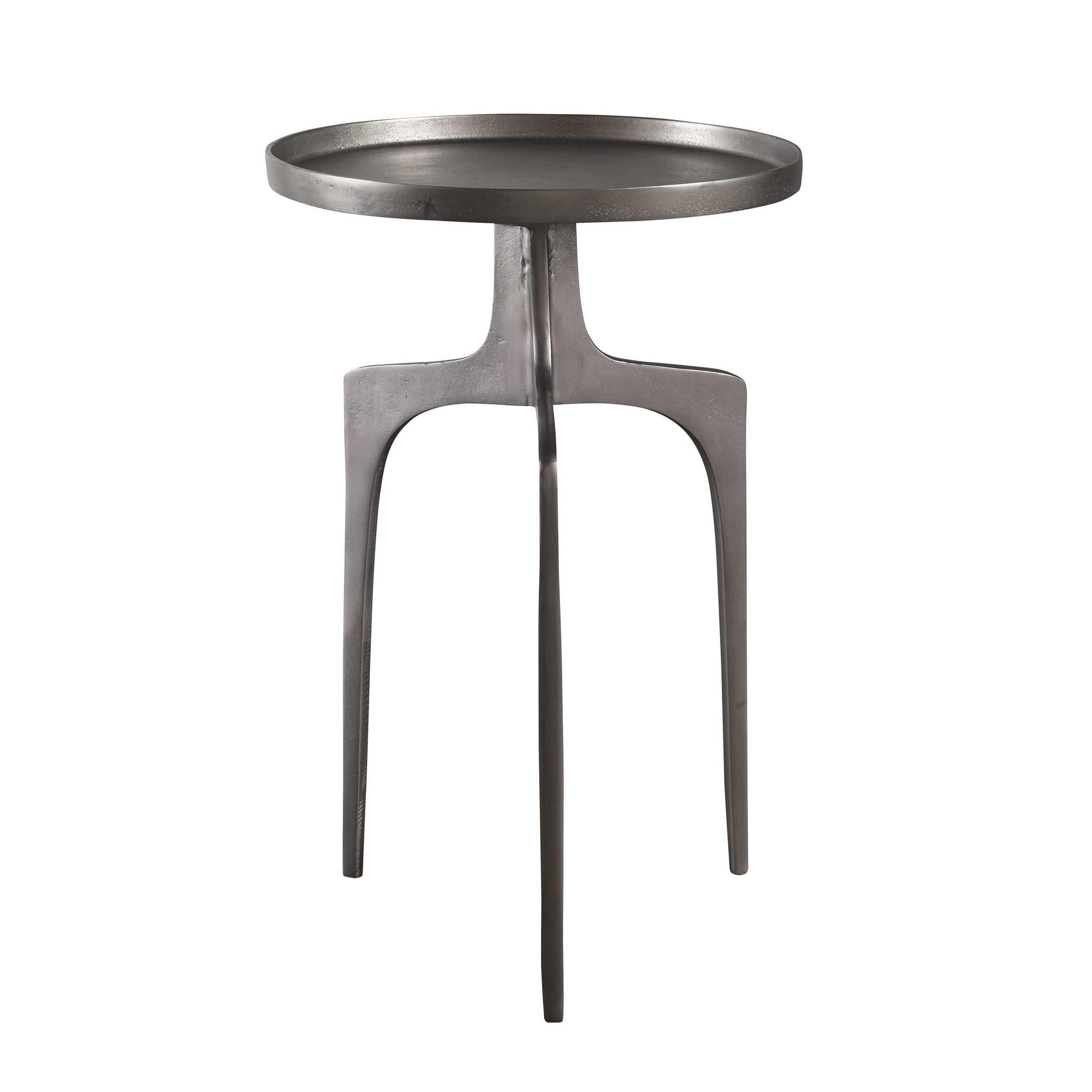 Боковой столик Kenna, выполненный из литого алюминия, отличается изогнутым основанием и круглой столешницей, покрытой текстурированным никелем, что придает изделию органичную эстетику и современную элегантность.