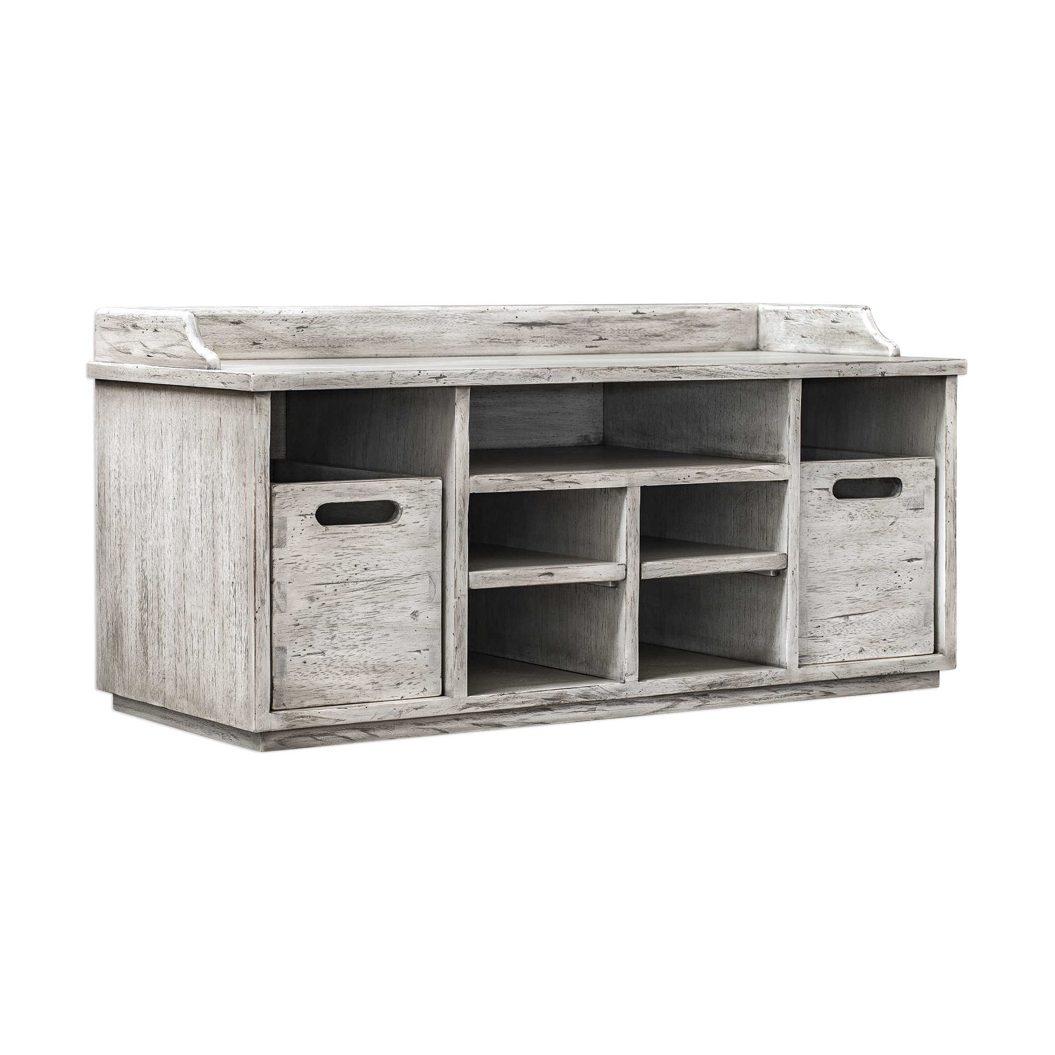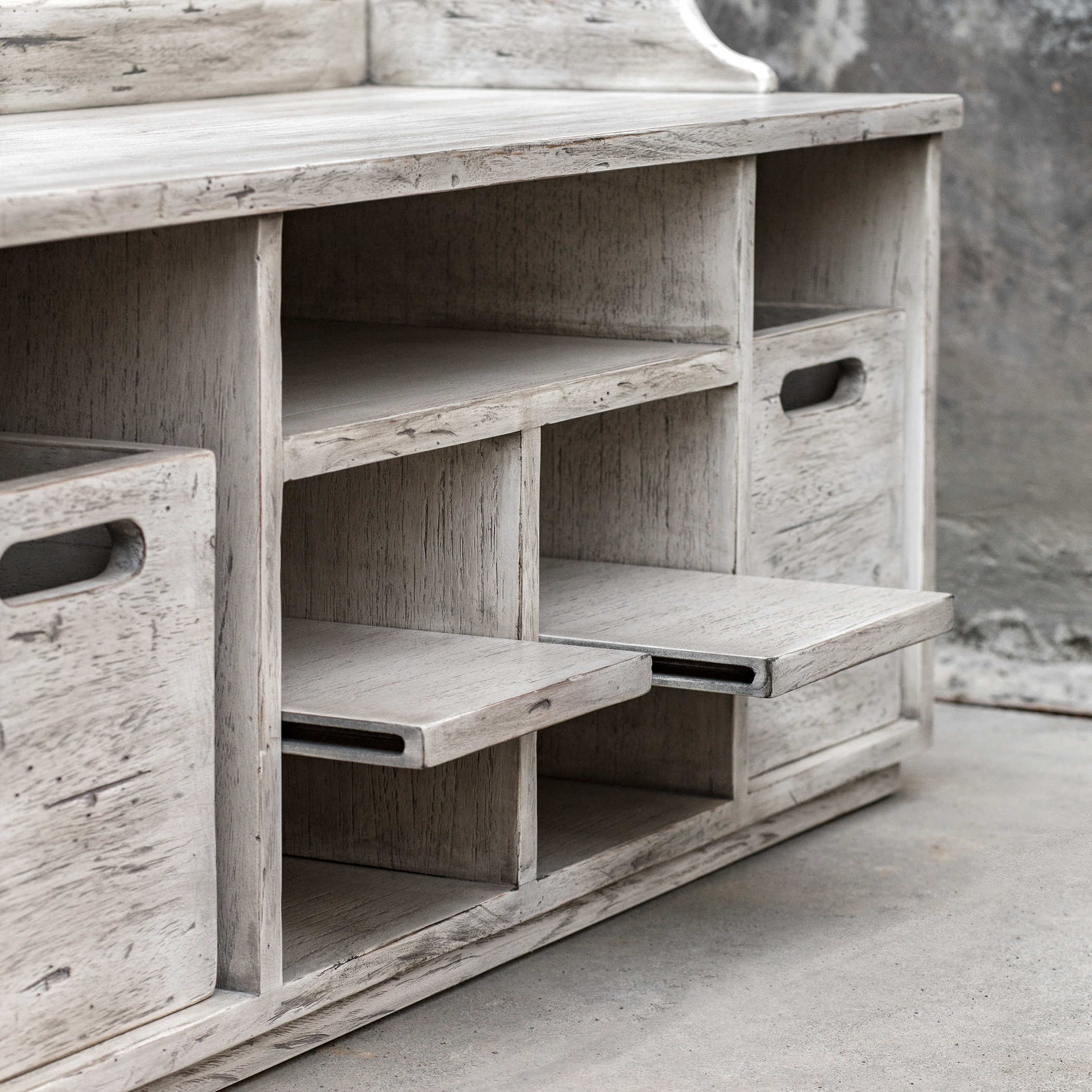 Банкетка предлагает удивительное сочетание функциональности и стиля с двумя твердыми деревянными ящиками, изготовленными с применением техники "ласточкин хвост", и полками для хранения. Ящики отделаны в теплой медовой отделке, создавая приятный контраст с белой поверхностью банкетки.