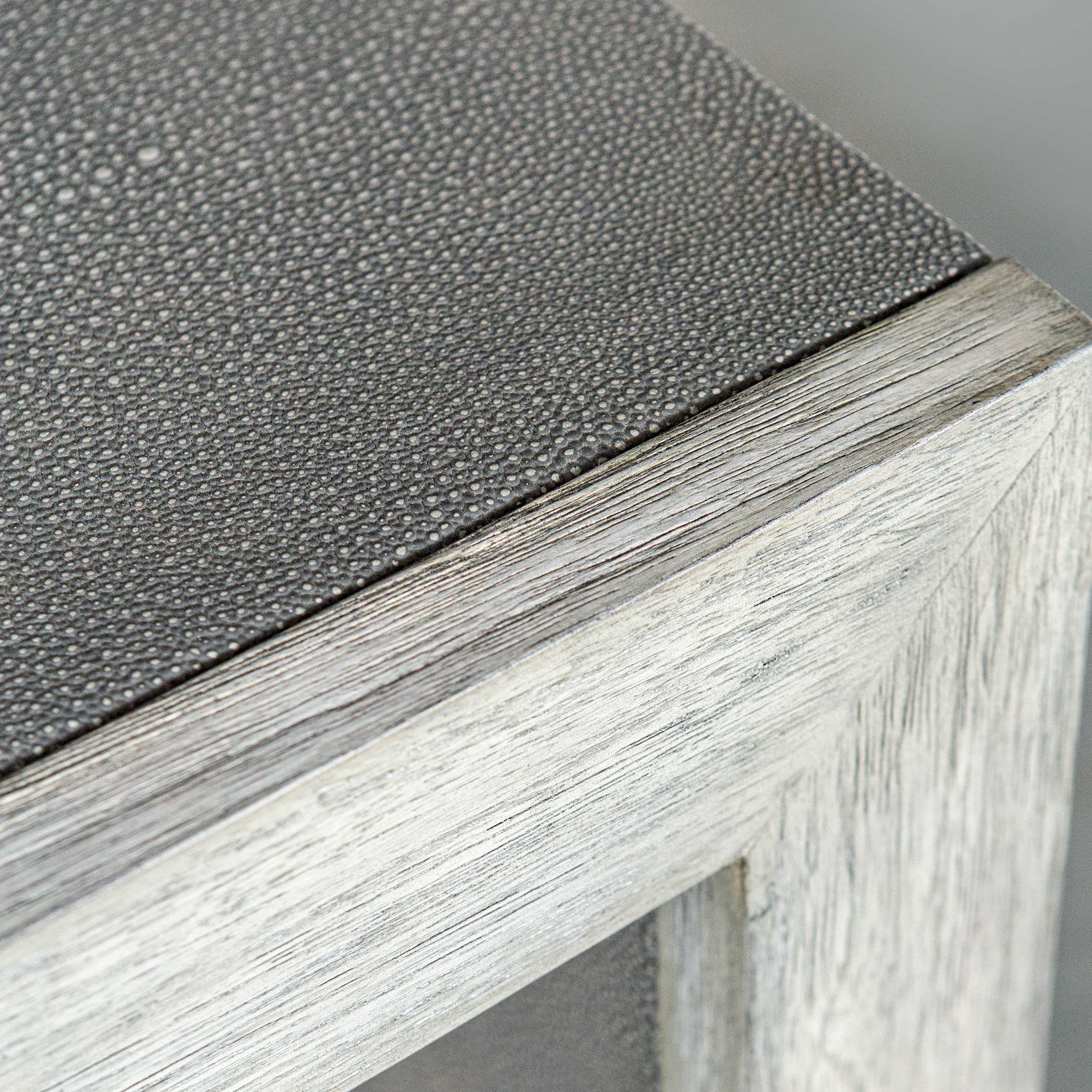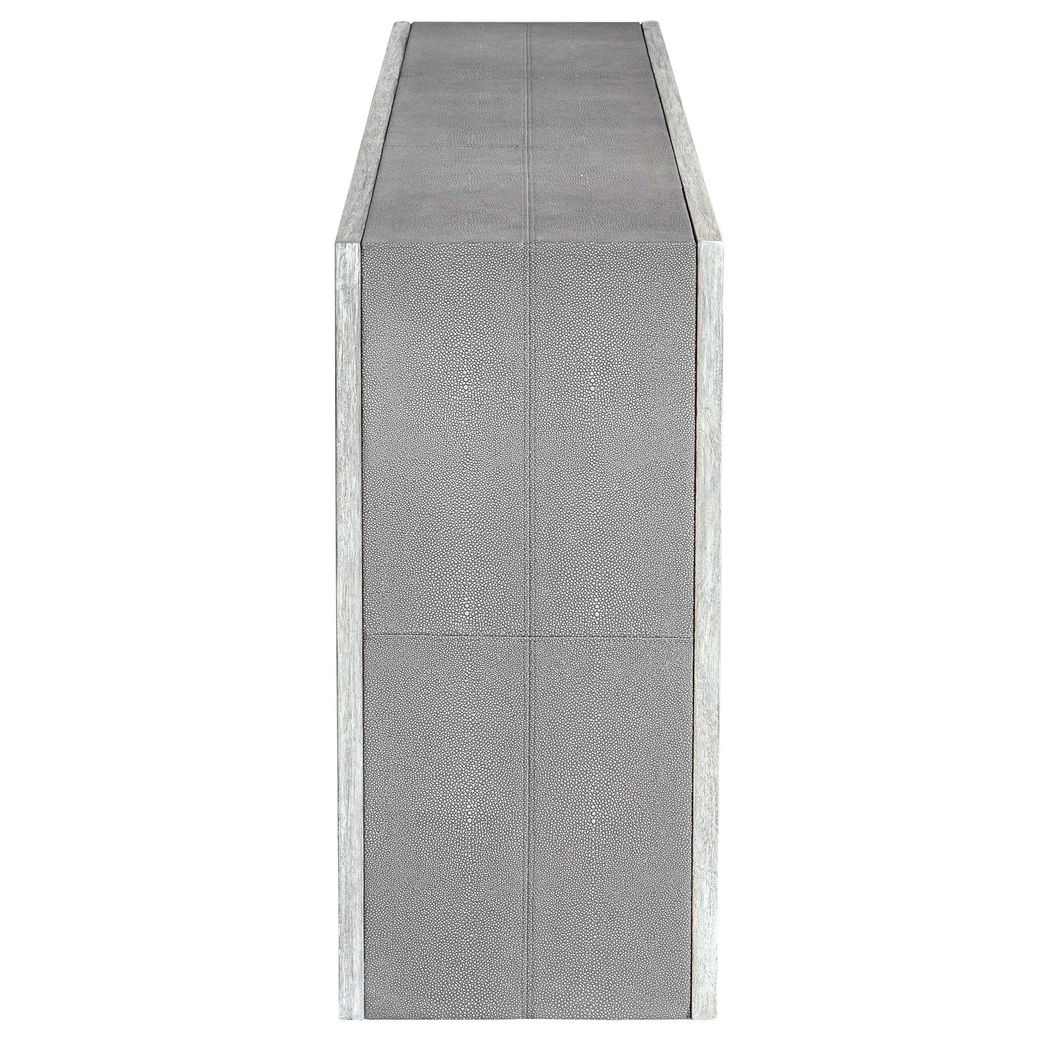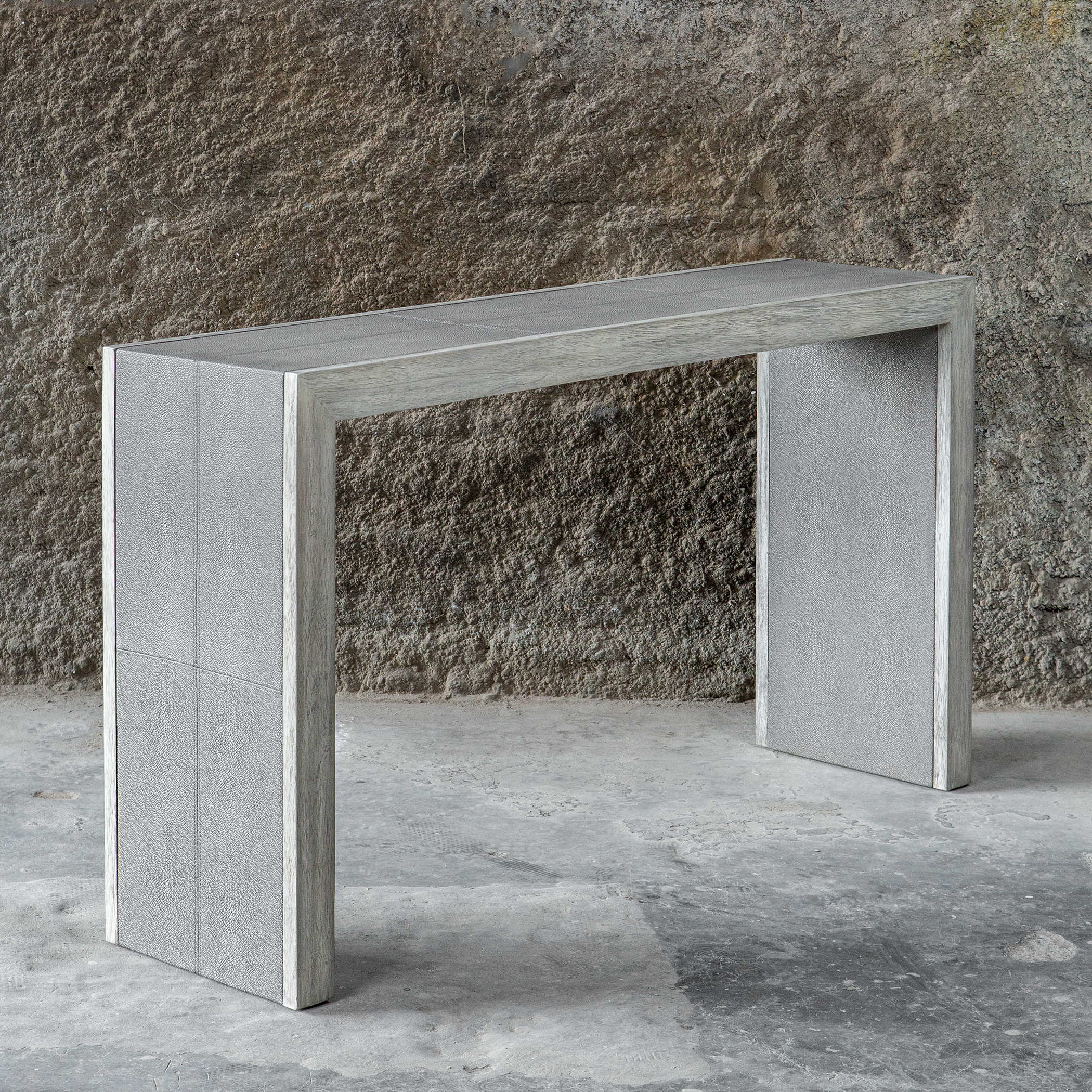 Консоль Aerina от Uttermost - это стильное сочетание современности и переходного стиля. Она оснащена прошитыми панелями из светло-серой искусственной шагрени, что создает интересный контраст с деревянной отделкой в состаренном белом цвете с серыми деталями.
