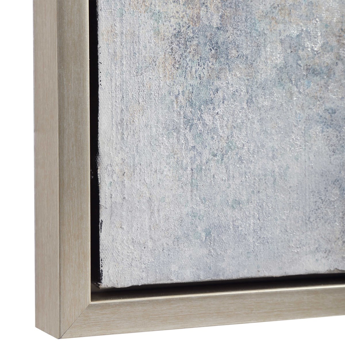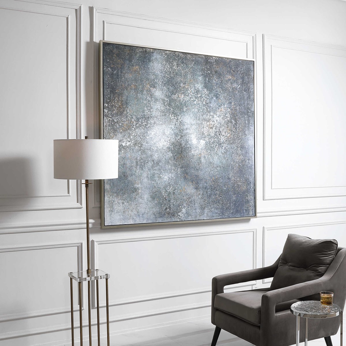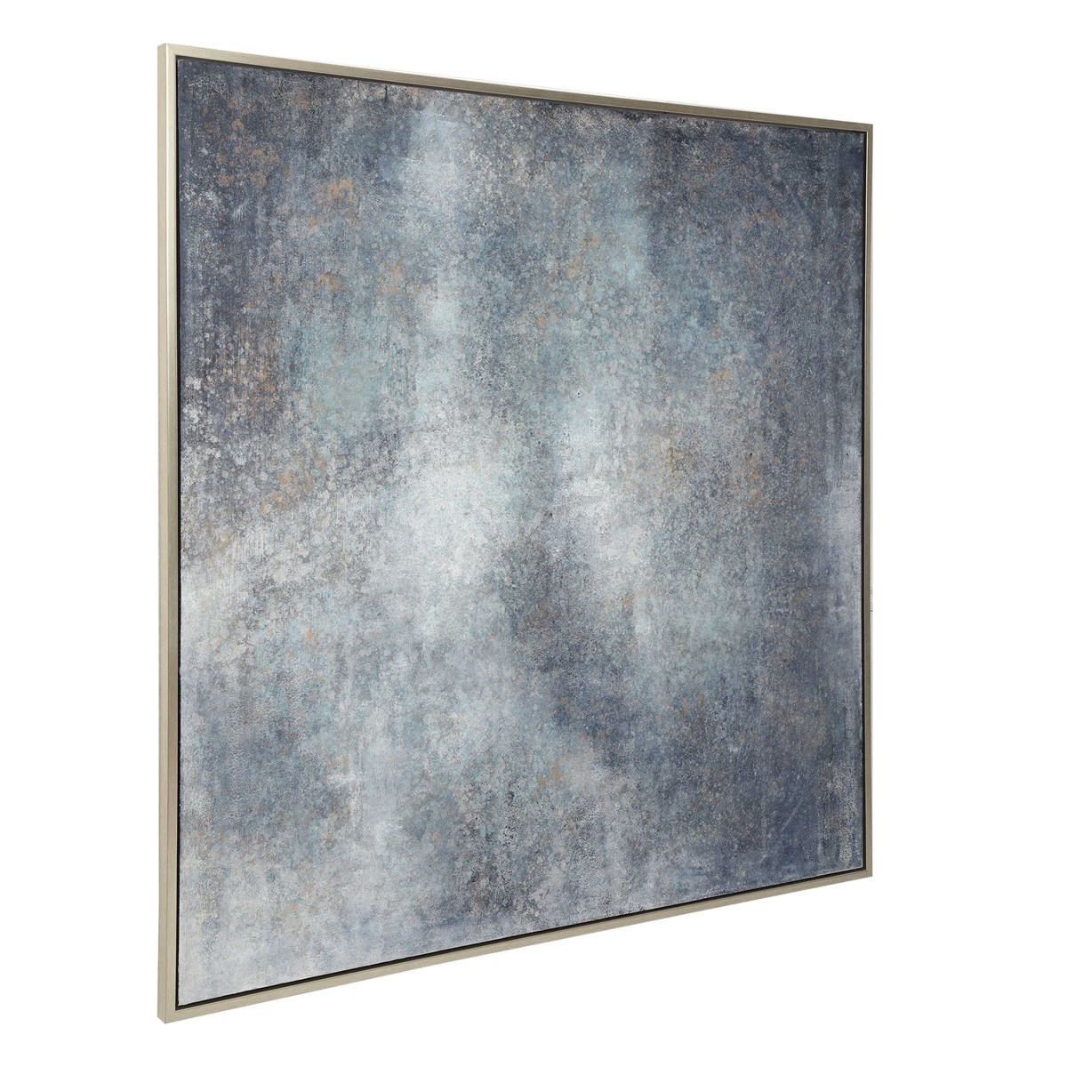 Ручная работа подчеркивает глубокие оттенки синего денима, смешанные с угольно-серыми и светло-серыми нюансами. Абстрактный дизайн придает картине уникальность и загадочность, а серебряная галерейная рама завершает ее стильный внешний вид.