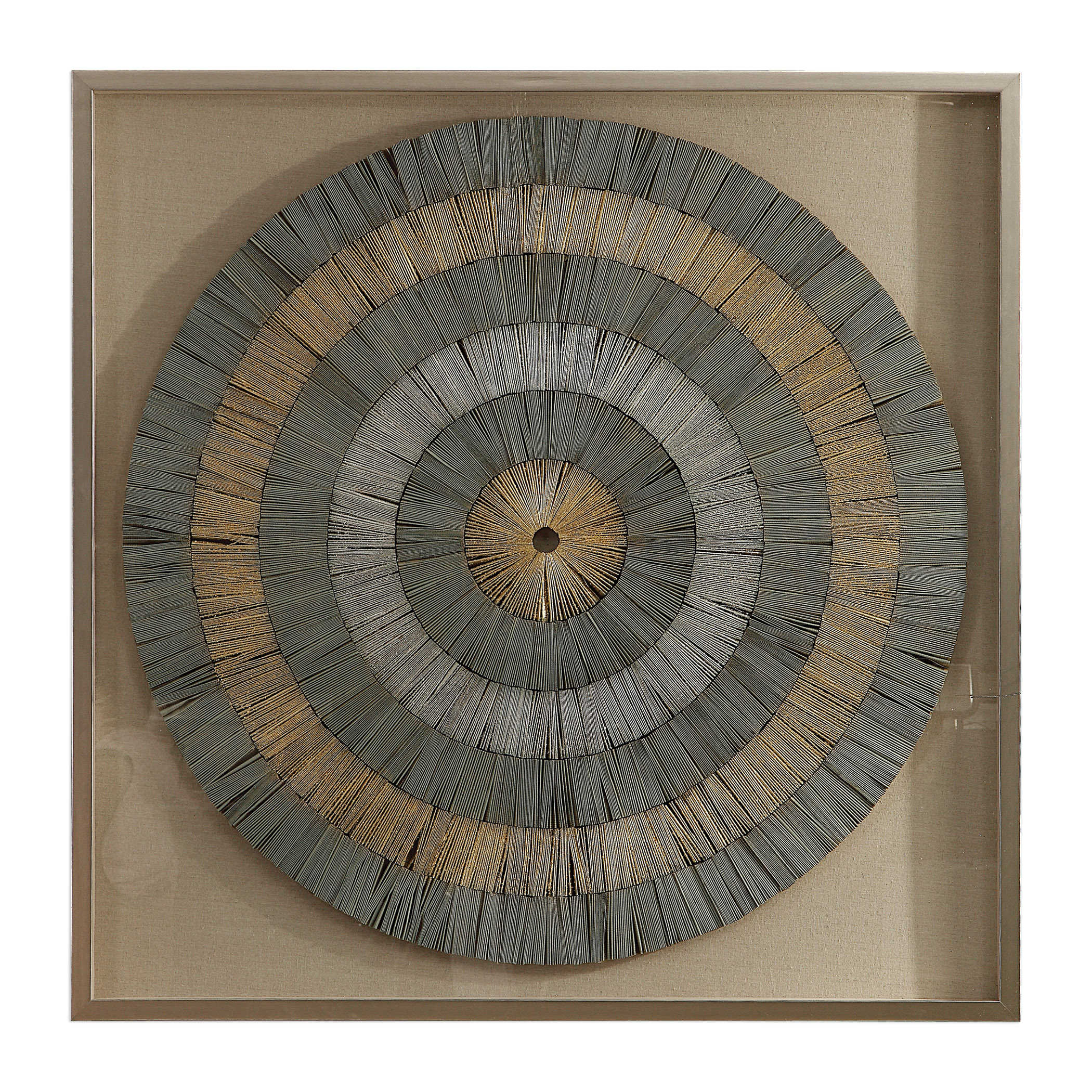 Savala от Uttermost — это уникальное произведение, созданное из переработанных газет, оформленных вручную металлизированными золотыми и серебряными листами. Картина дополнена оттенками зеленого шалфея, расположенными поверх нейтральной льняной ткани, что создает интересный и гармоничный контраст. Это оригинальное творение представлено под стеклом в элегантной коробке для теней, выполненной из сосны и окрашенной в серебристые тона.