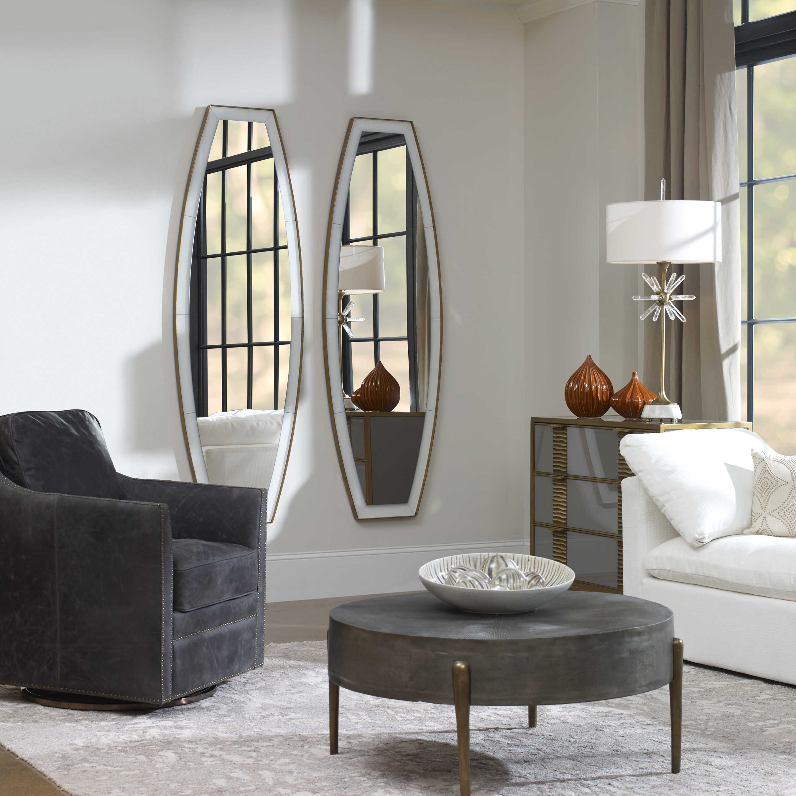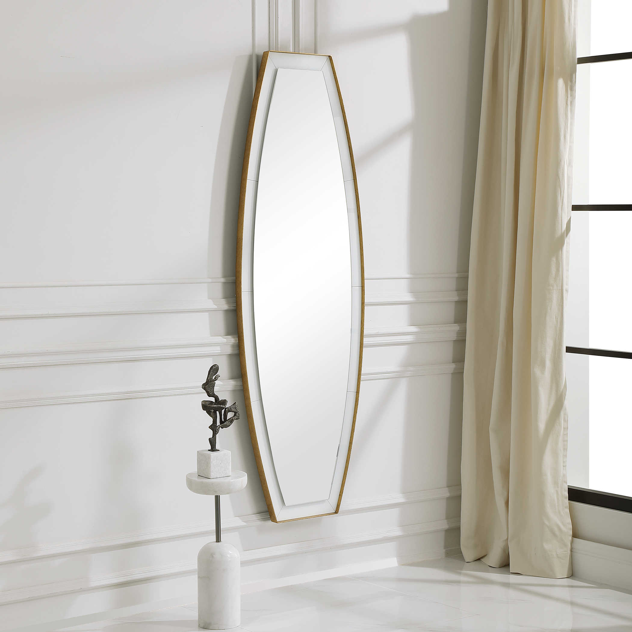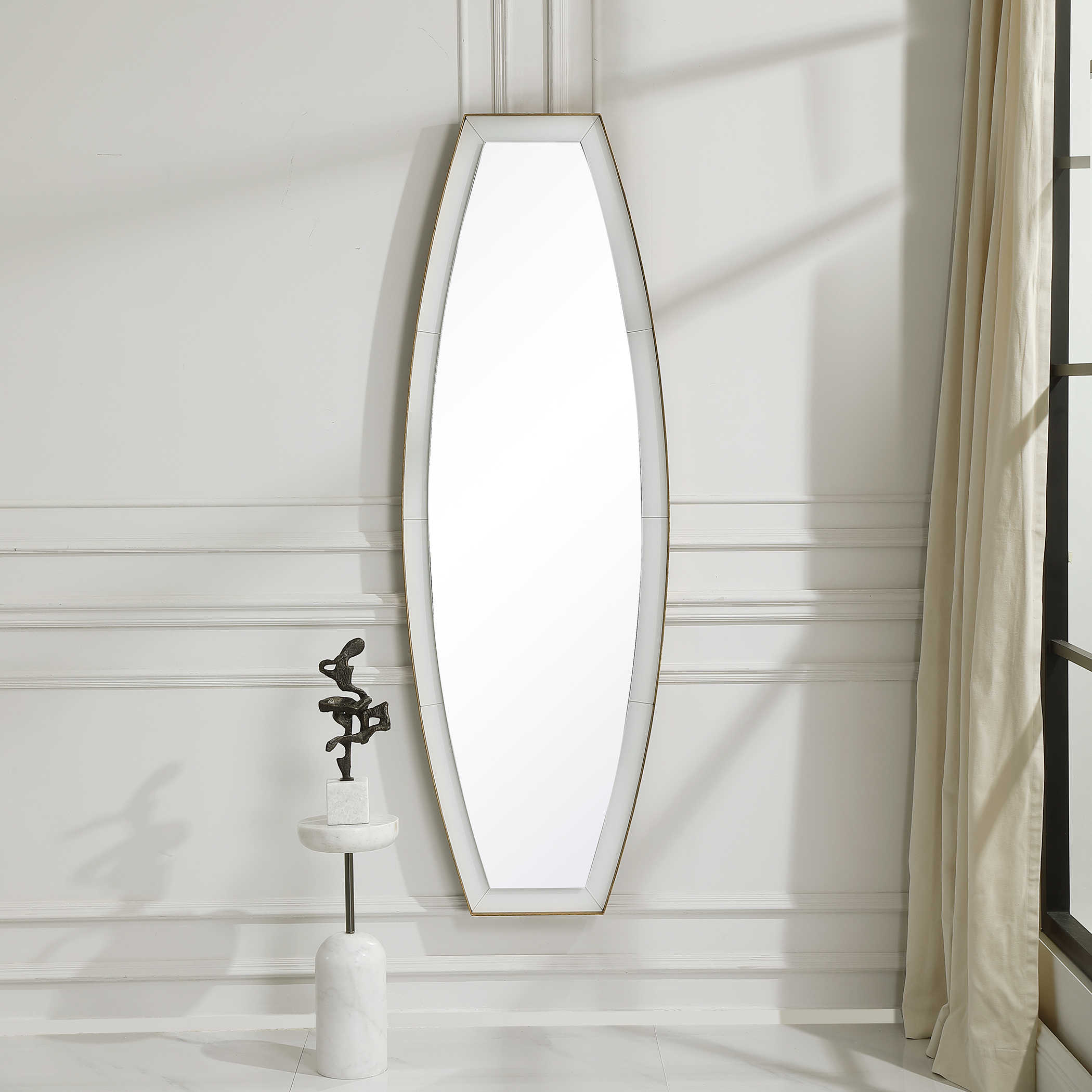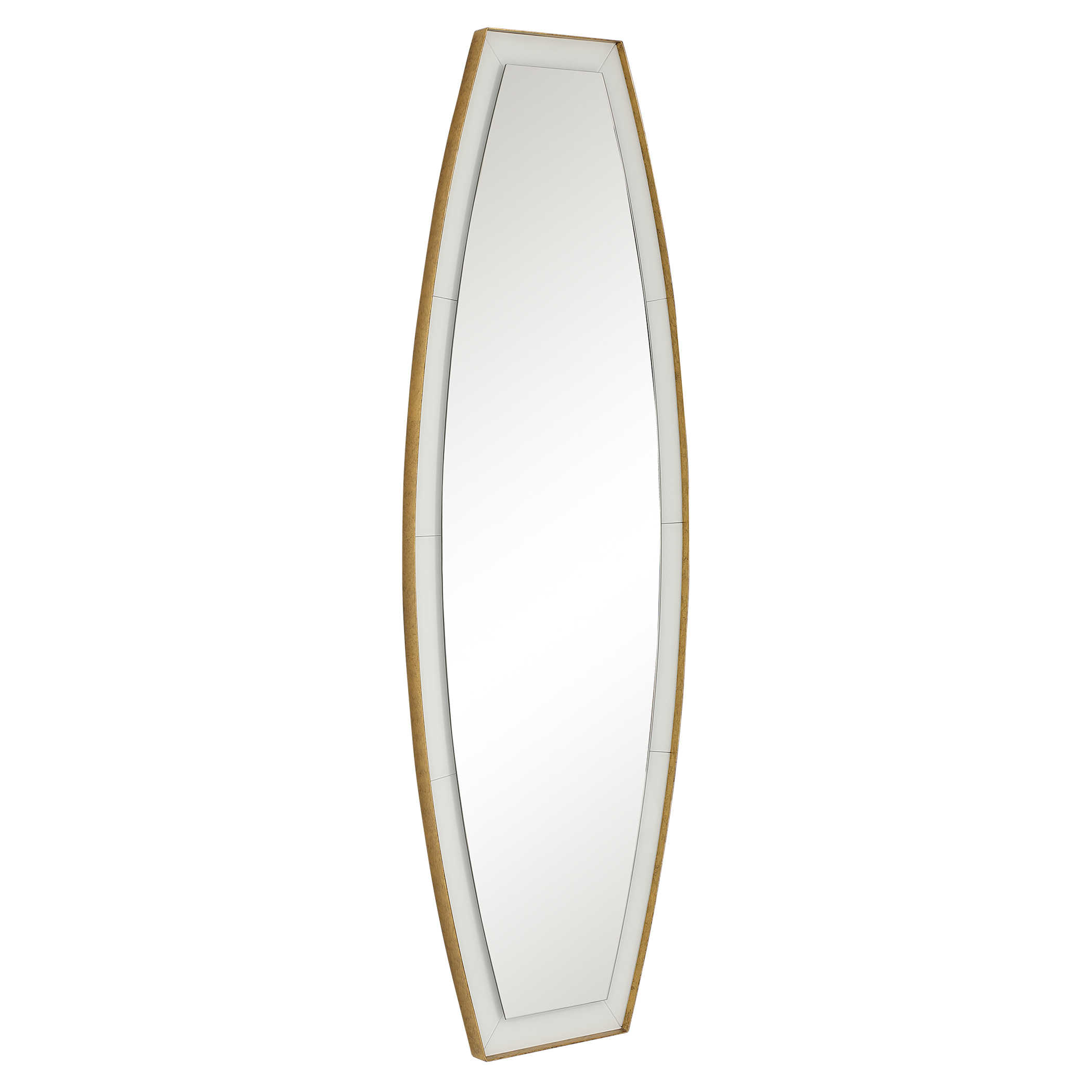Зеркало Elongated от американского бренда Uttermost - это настоящее произведение искусства. В его дизайне центральное удлиненное зеркало дарит ощущение плавности на фоне белого стекла, а обрамление из металла с отделкой под старину в сусальном золоте придает ему изысканный вид.