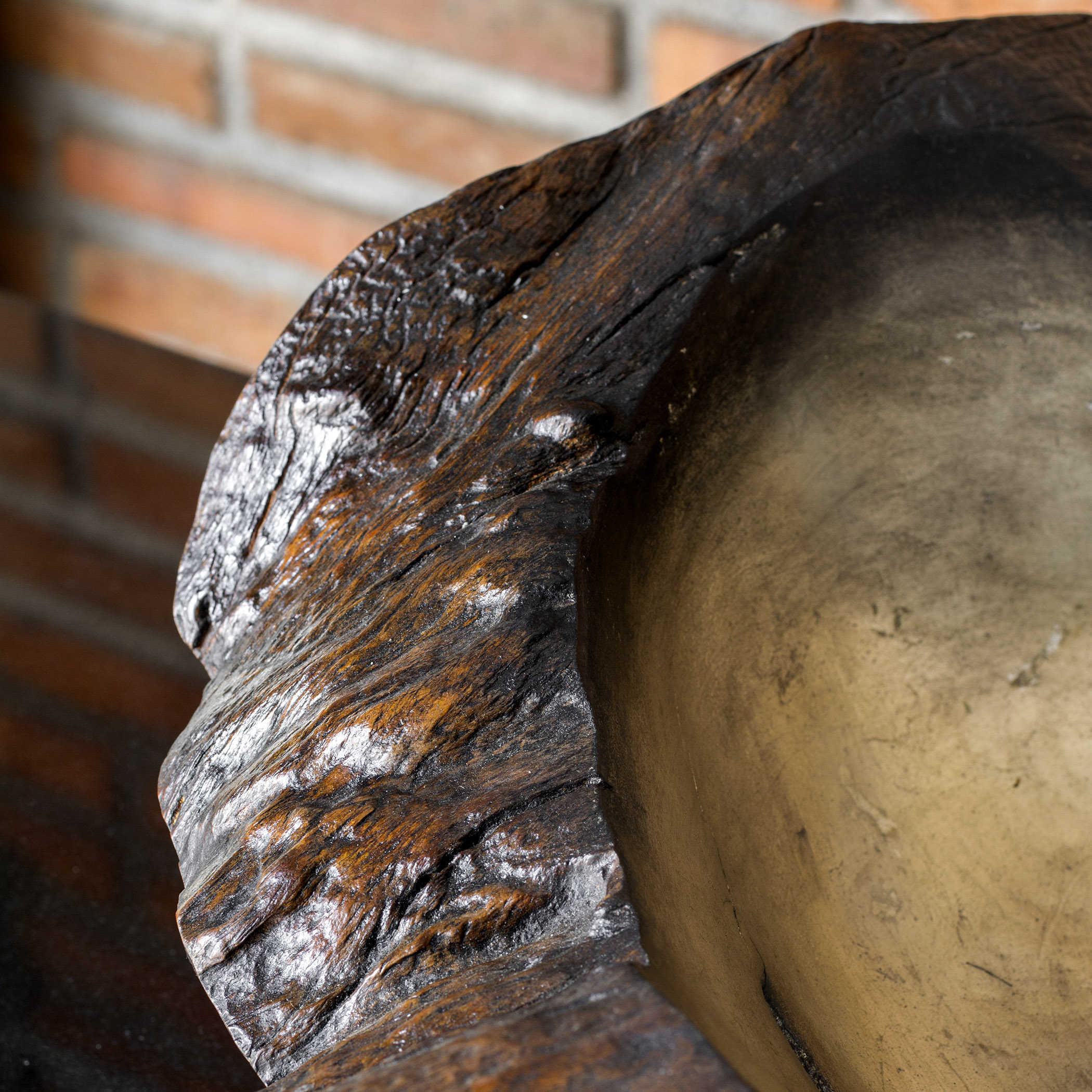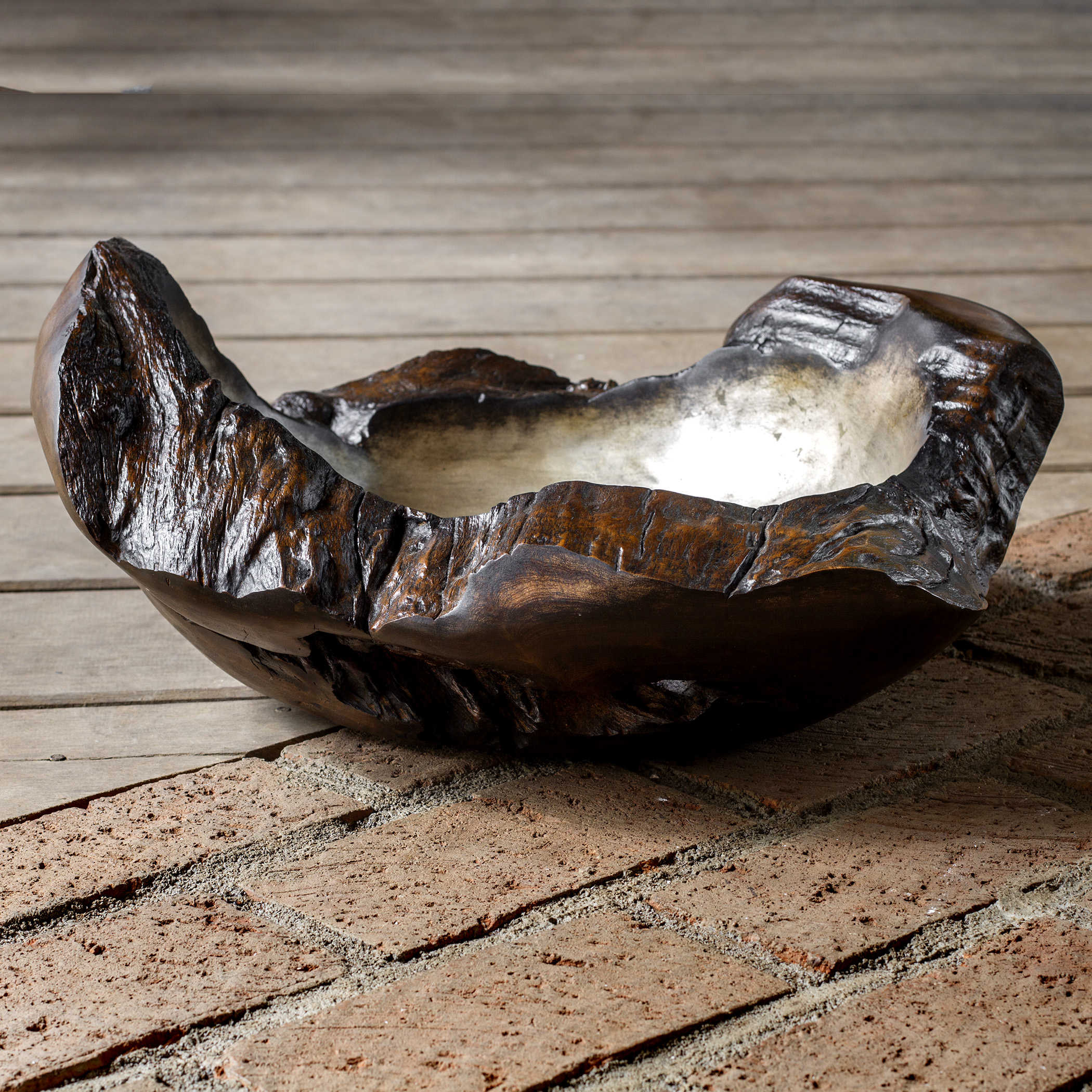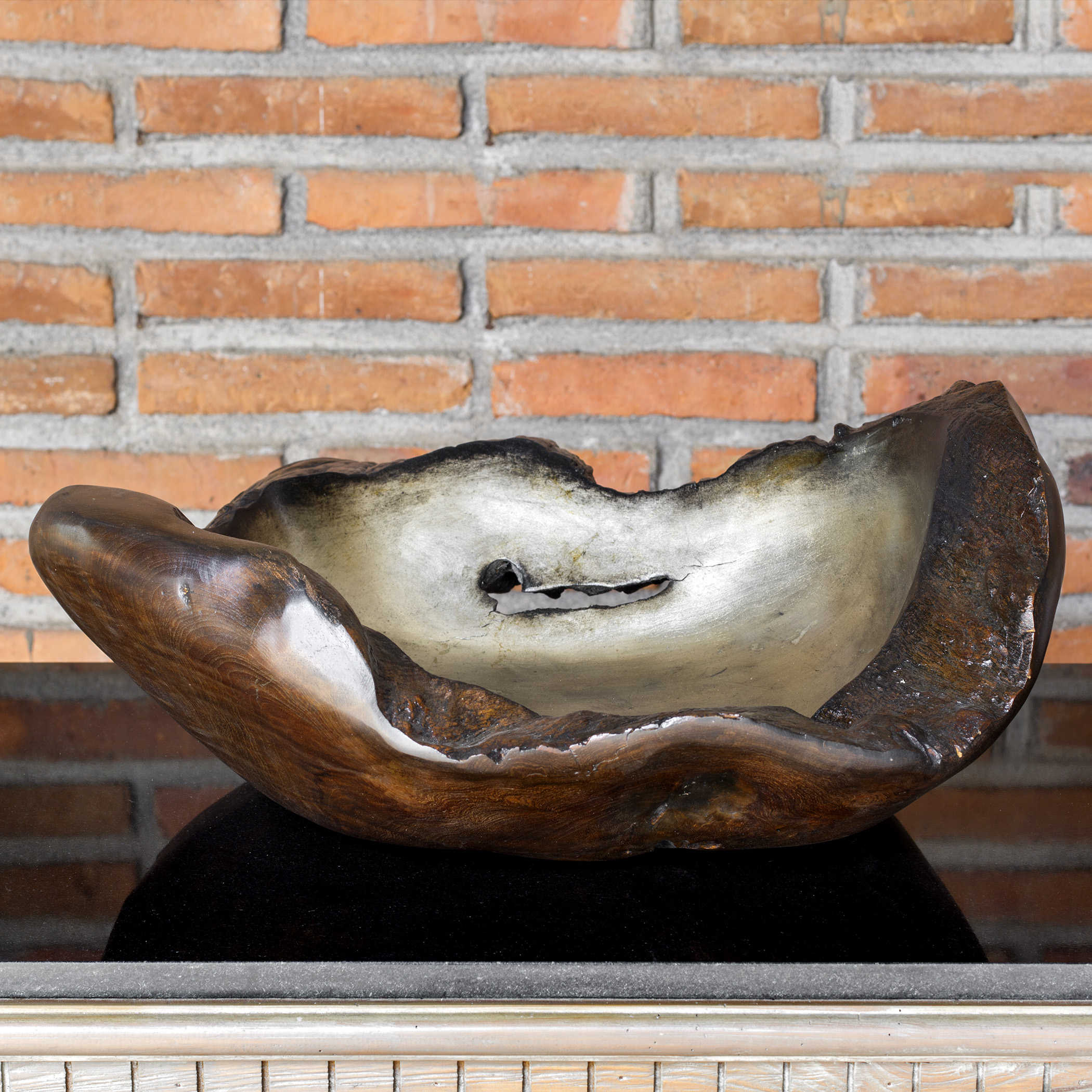 Внешняя часть чаши окрашена в темный цвет, что придает ей загадочность и элегантность. Внутренняя же часть блеском холодного полированного серебра, создавая удивительный контраст между материалами и текстурами.