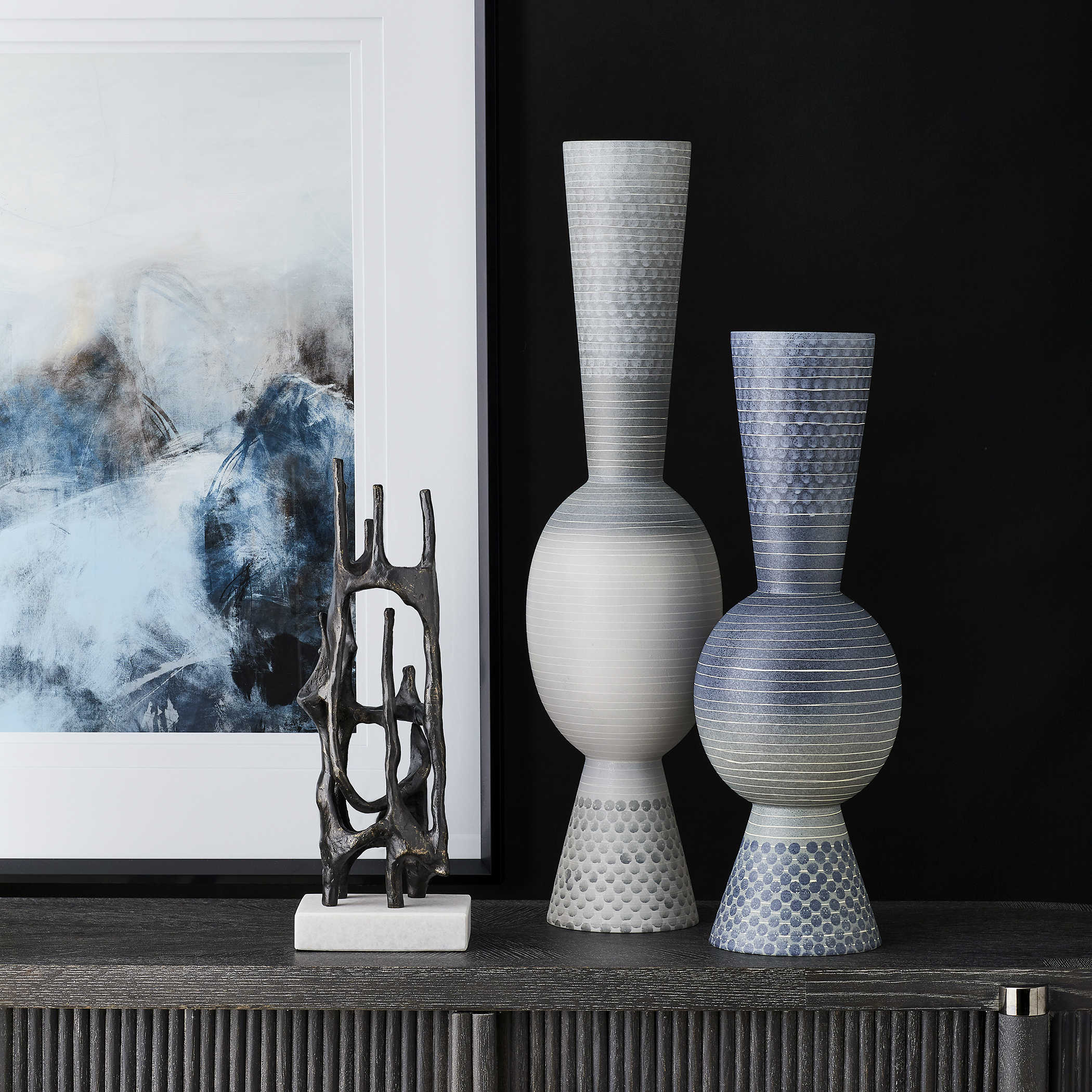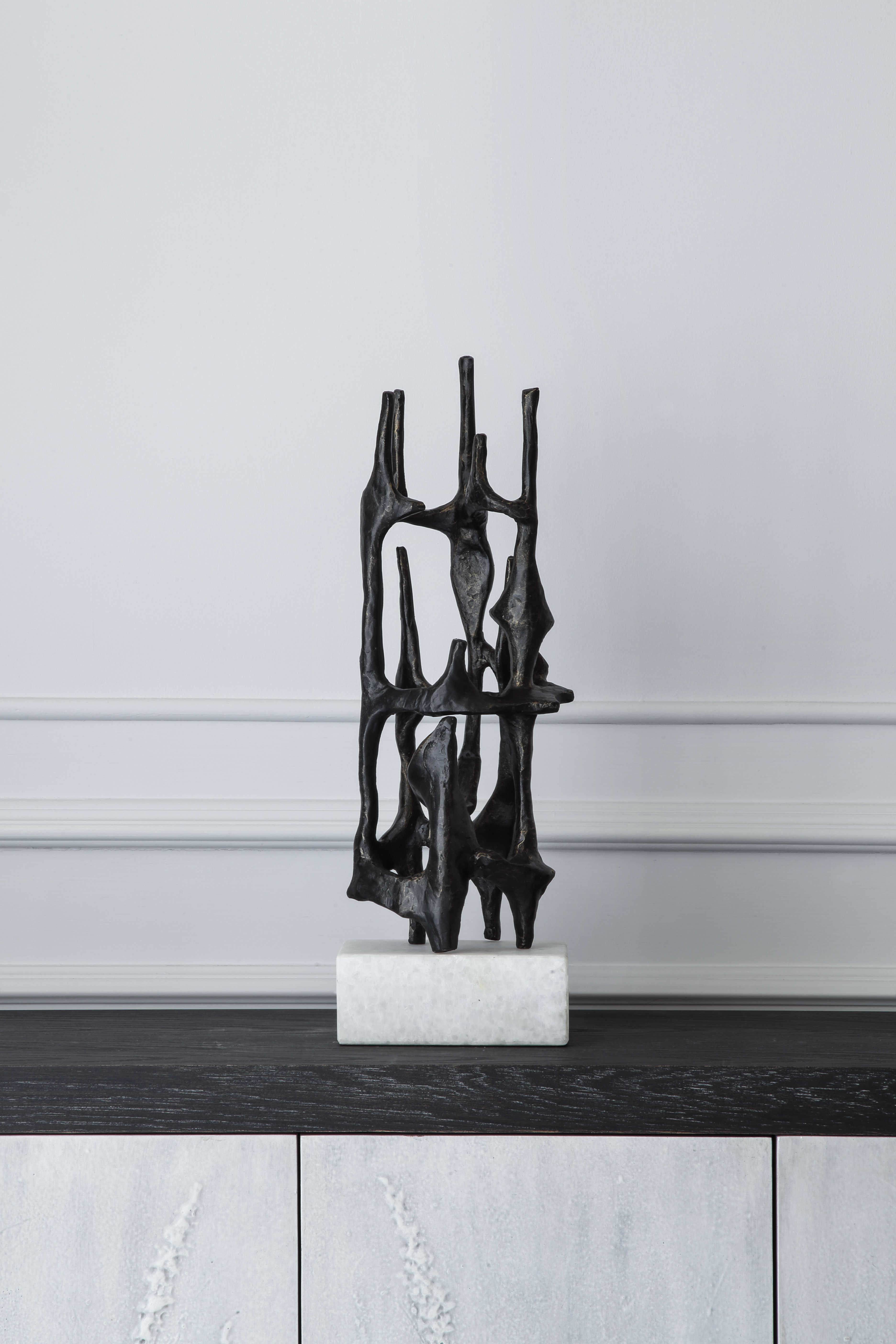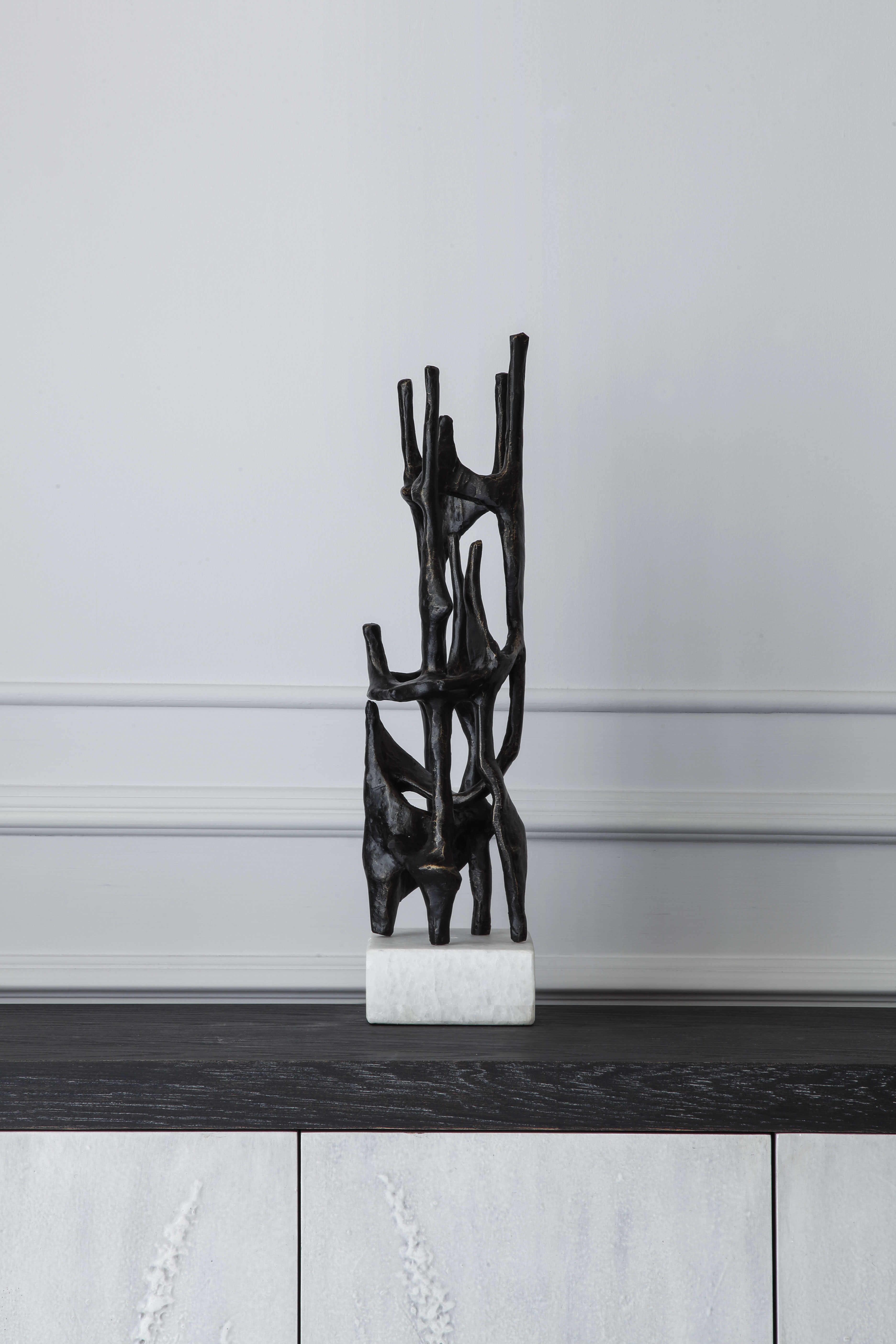 Изготовленная из чугуна, эта скульптура обладает теплой матово-черной отделкой, которая придает ей приглушенный, но в то же время роскошный вид. Ее отшлифованная основа из белого мрамора добавляет контраст и придаст ей стабильность.
