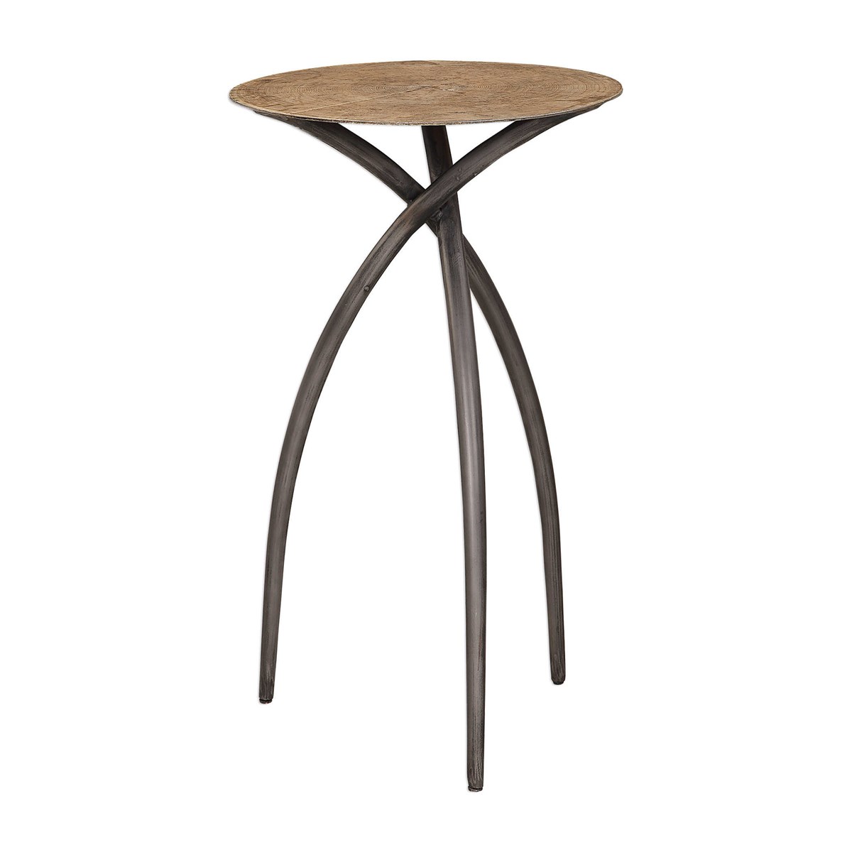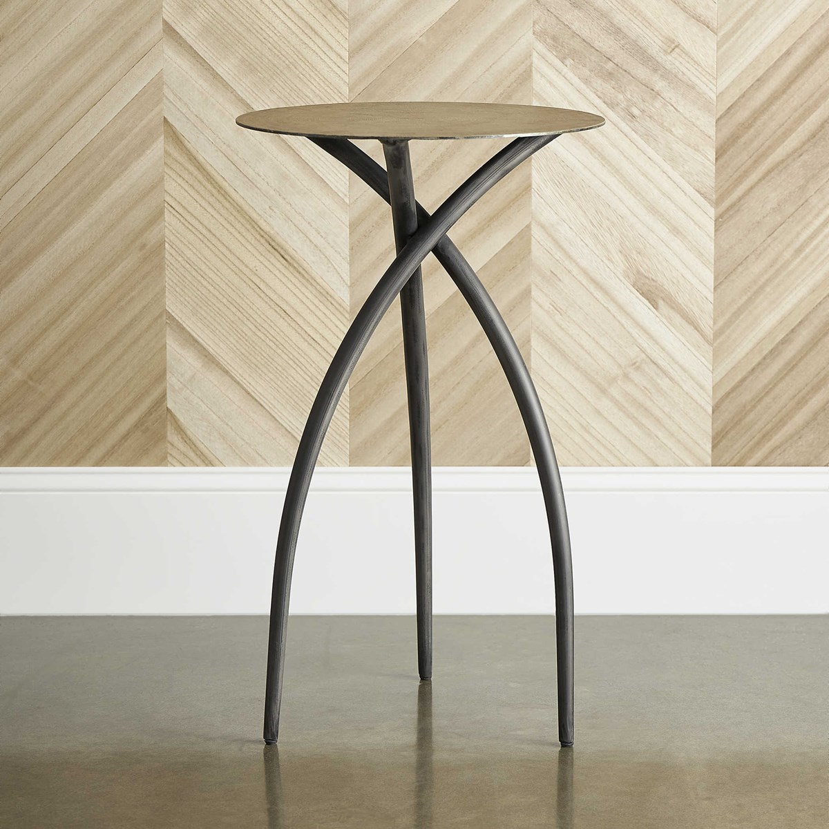 Боковой столик Renly ручной работы сочетает деревенский стиль с индустриальным: столешница из шпона вяза установлена на дугообразной треноге с железным основанием, отделанным состаренной сталью. Столик придаст интерьеру характер и стиль, добавляя функциональность благодаря устойчивой конструкции и уникальному дизайну. Этот элемент декора прекрасно подходит для гостиной или кабинета, создавая уютную атмосферу.