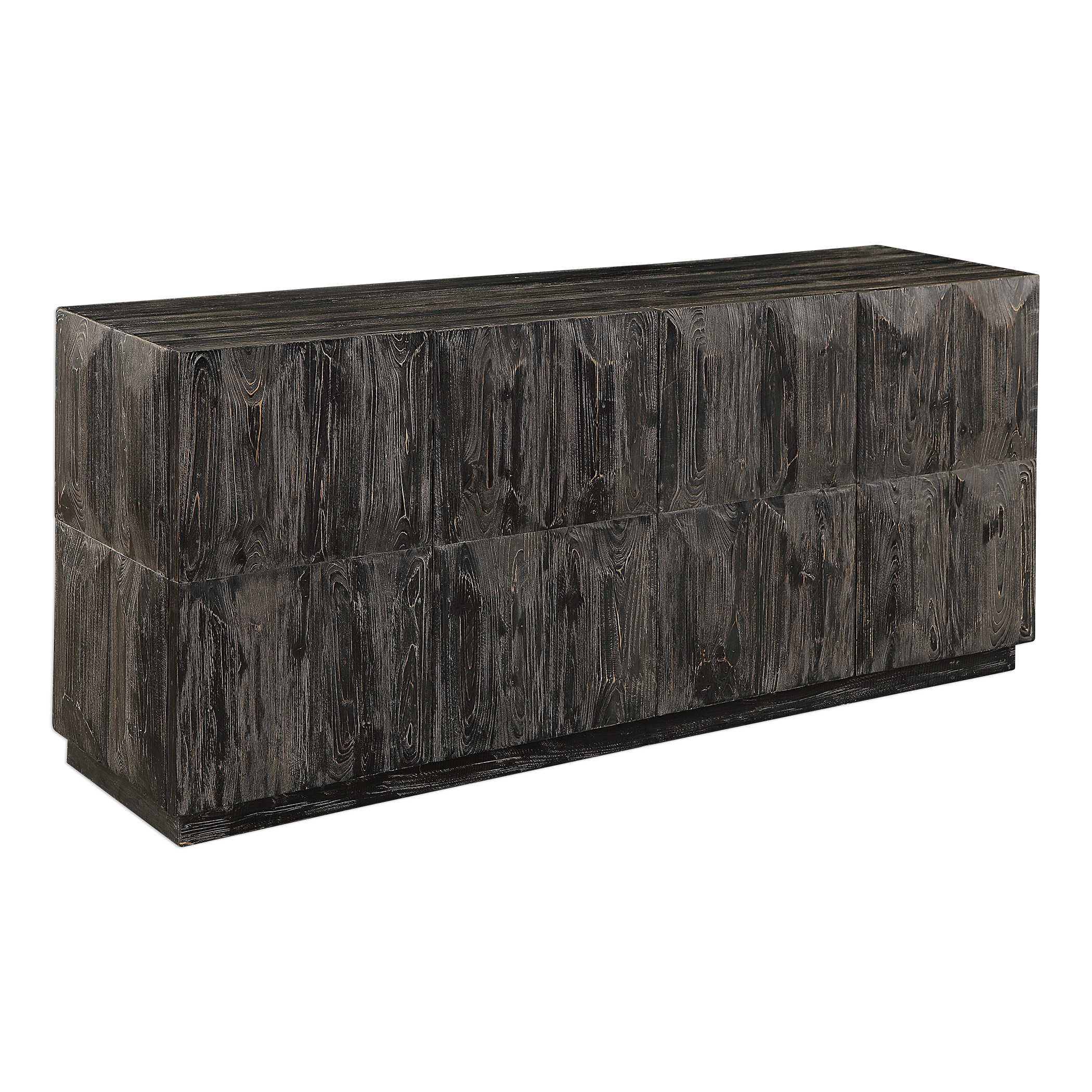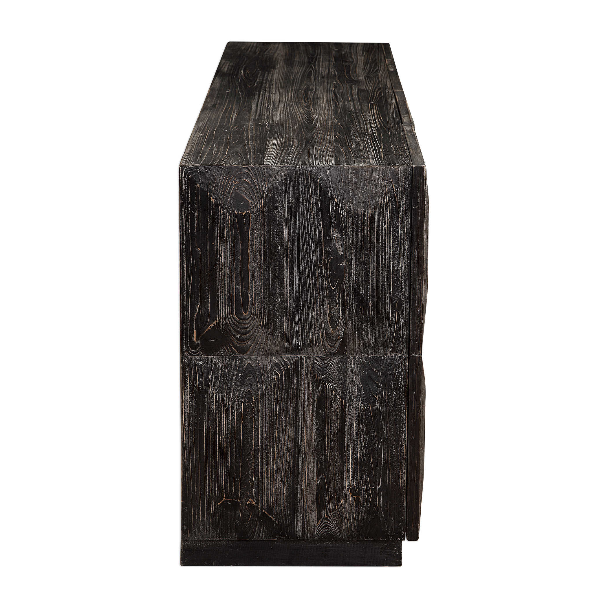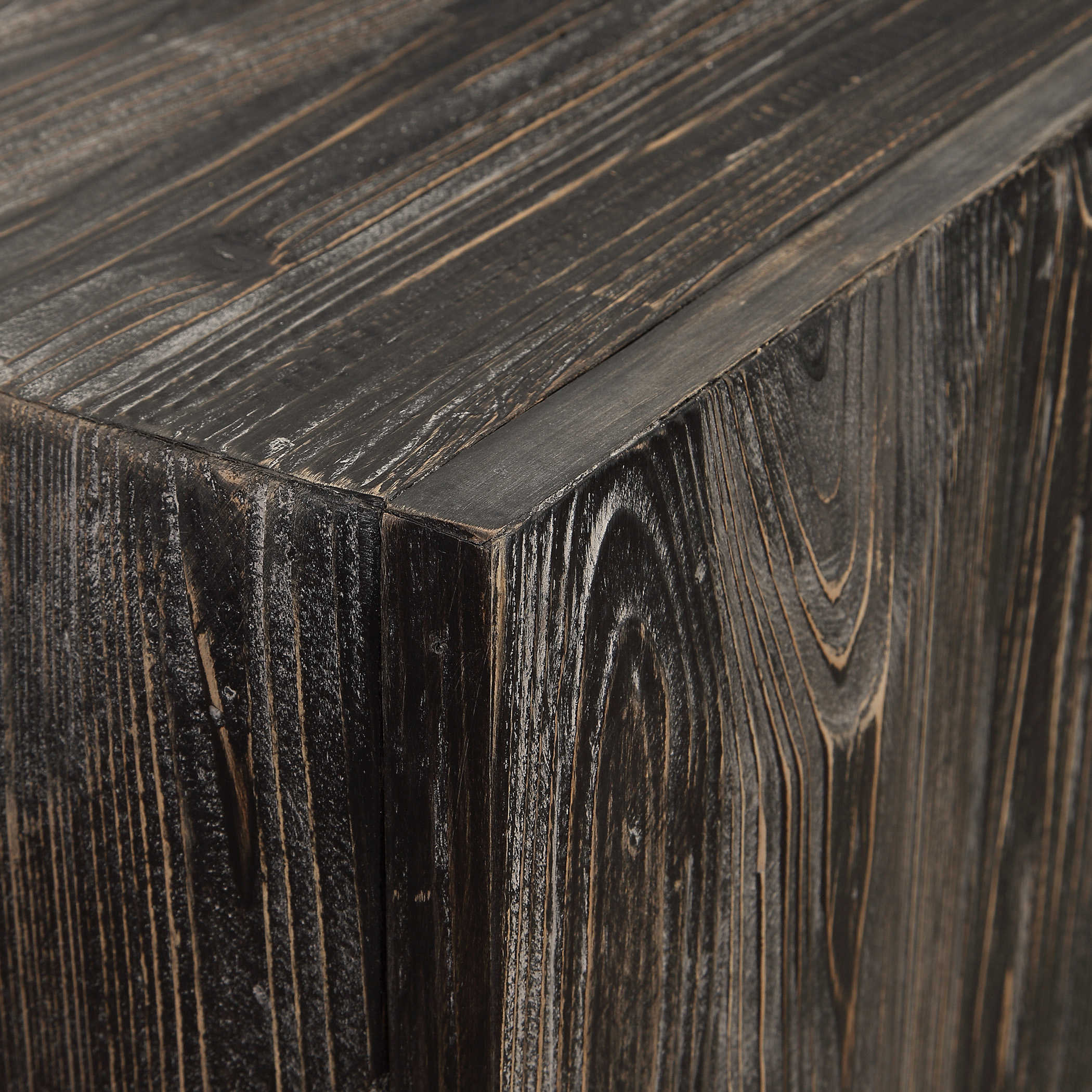 Консоль Barlas, изготовленная почти полностью из массива восстановленной пихты, имеет скошенные передние и боковые панели, отделанные состаренной черной краской со светло-серой глазурью и огненными бликами. Три дверцы с мягким закрыванием открывают доступ к регулируемым полкам в каждом отделении. Массив дерева продолжает изменяться при перепадах температуры и влажности, что может привести к появлению небольших трещин и неровностей, добавляя ему аутентичности и характера.