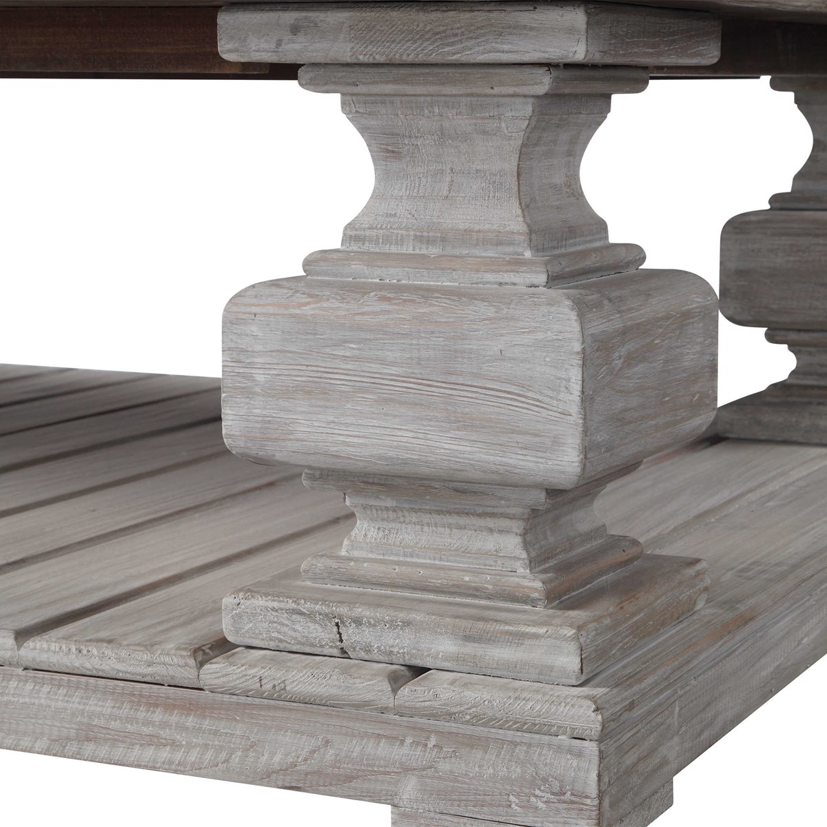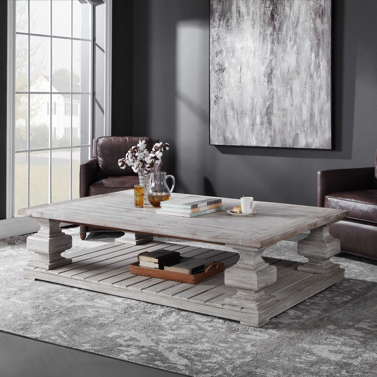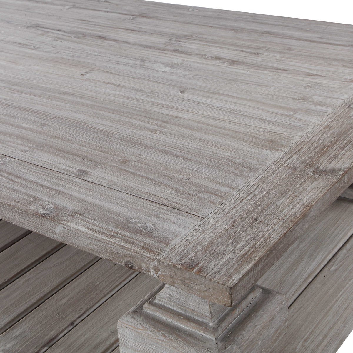 Журнальный столик Baldrick White, изготовленный из 100% восстановленной пихты, представляет собой идеальный элемент в стиле загородного дома. Этот столик имеет реечную столешницу на резных балясинах, а тонкий серый оттенок подчеркивает трещины и естественные углубления древесины. Массив дерева продолжает двигаться при изменении температуры и влажности, что может привести к появлению небольших трещин и неровных поверхностей, добавляя ему аутентичности и характера.