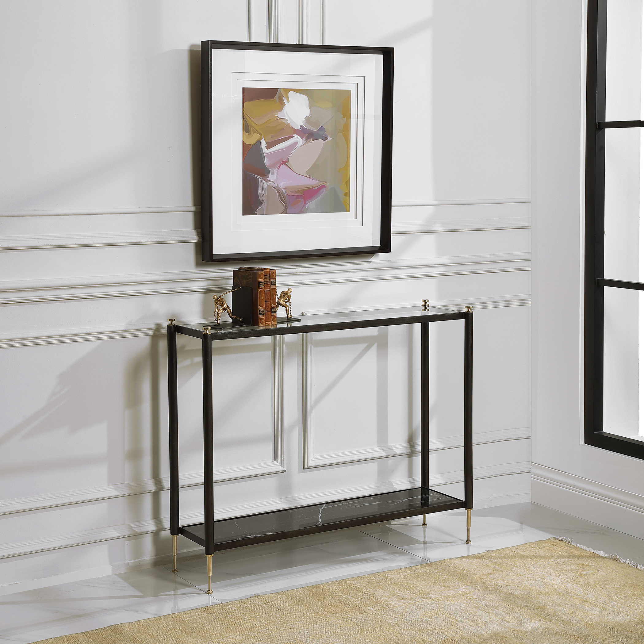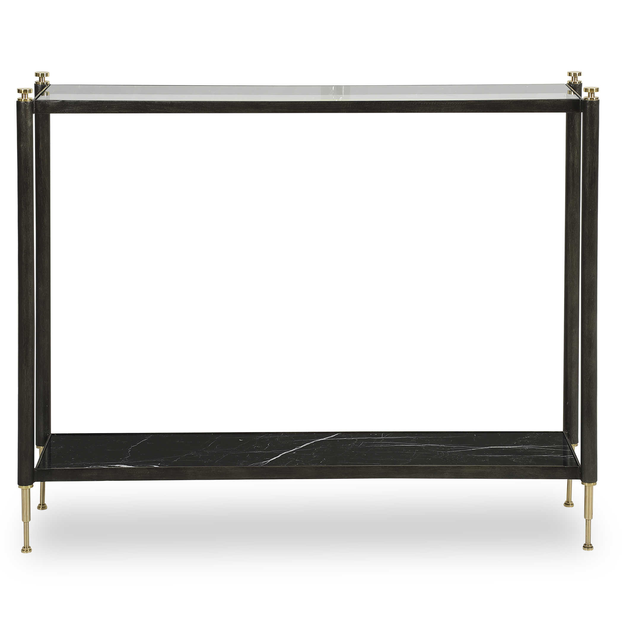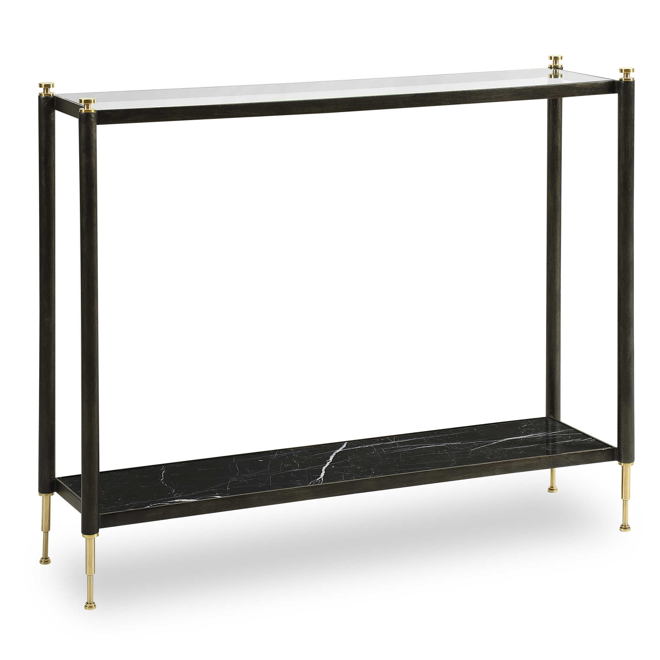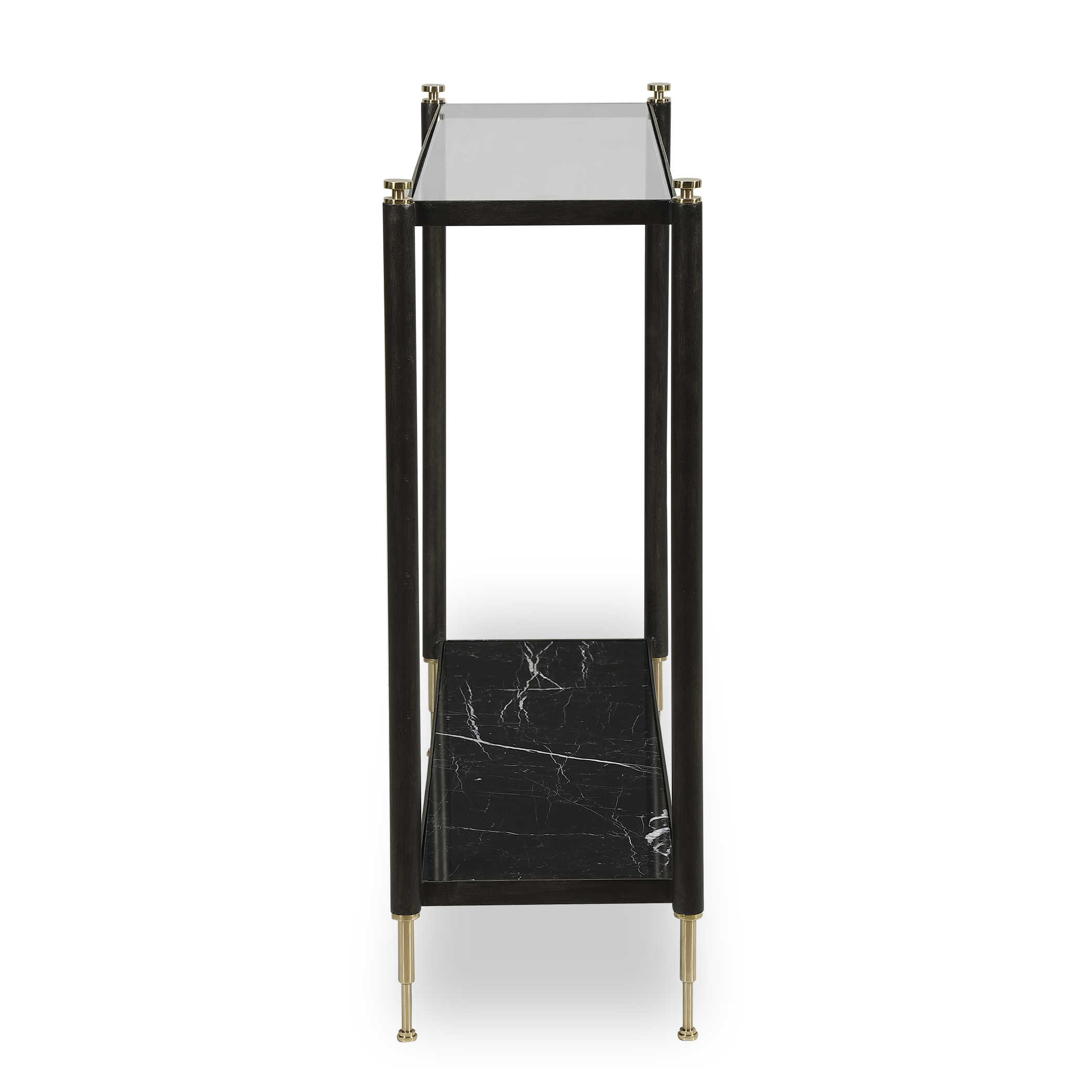 Консоль Viceroy оснащена нижней полкой из полированного черно-белого мрамора, которая не только служит функциональным элементом для хранения и декора, но также добавляет изысканности и роскоши общему внешнему виду. Верхняя столешница выполнена из прозрачного закаленного стекла, подчеркивающего красоту мраморной полки и создающего эффект простора и легкости.