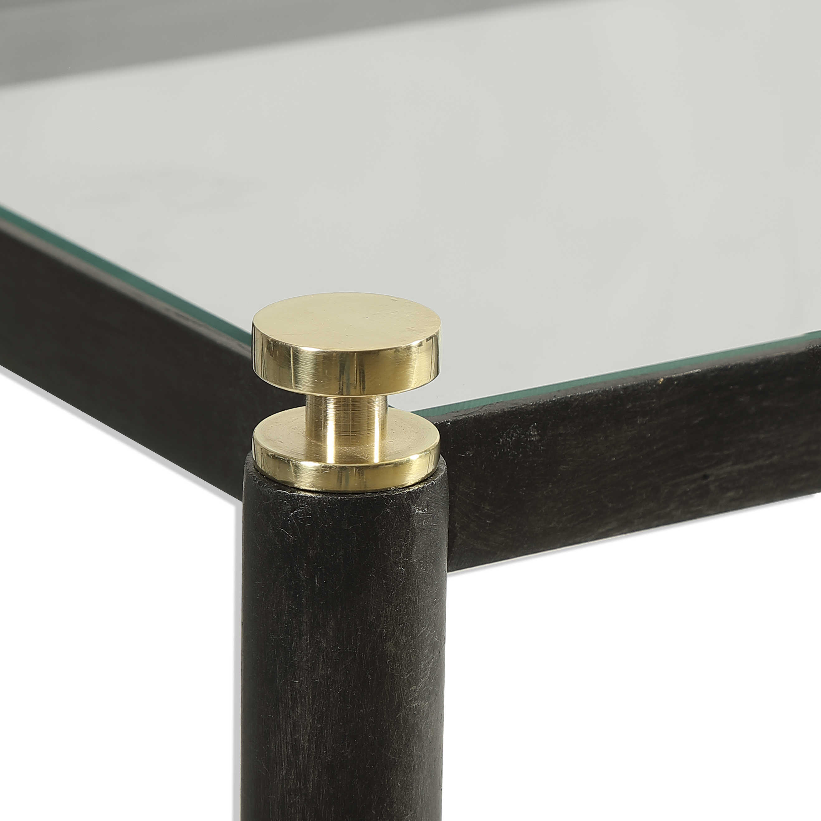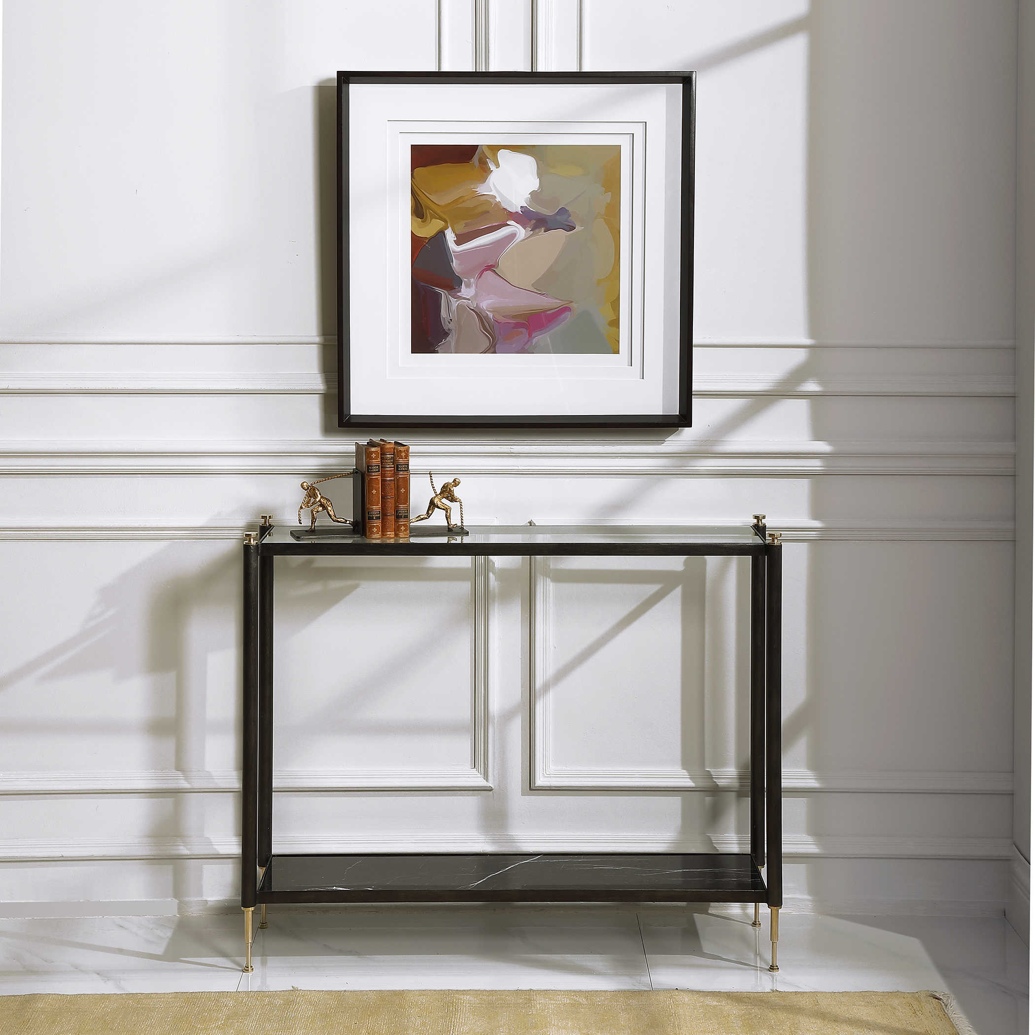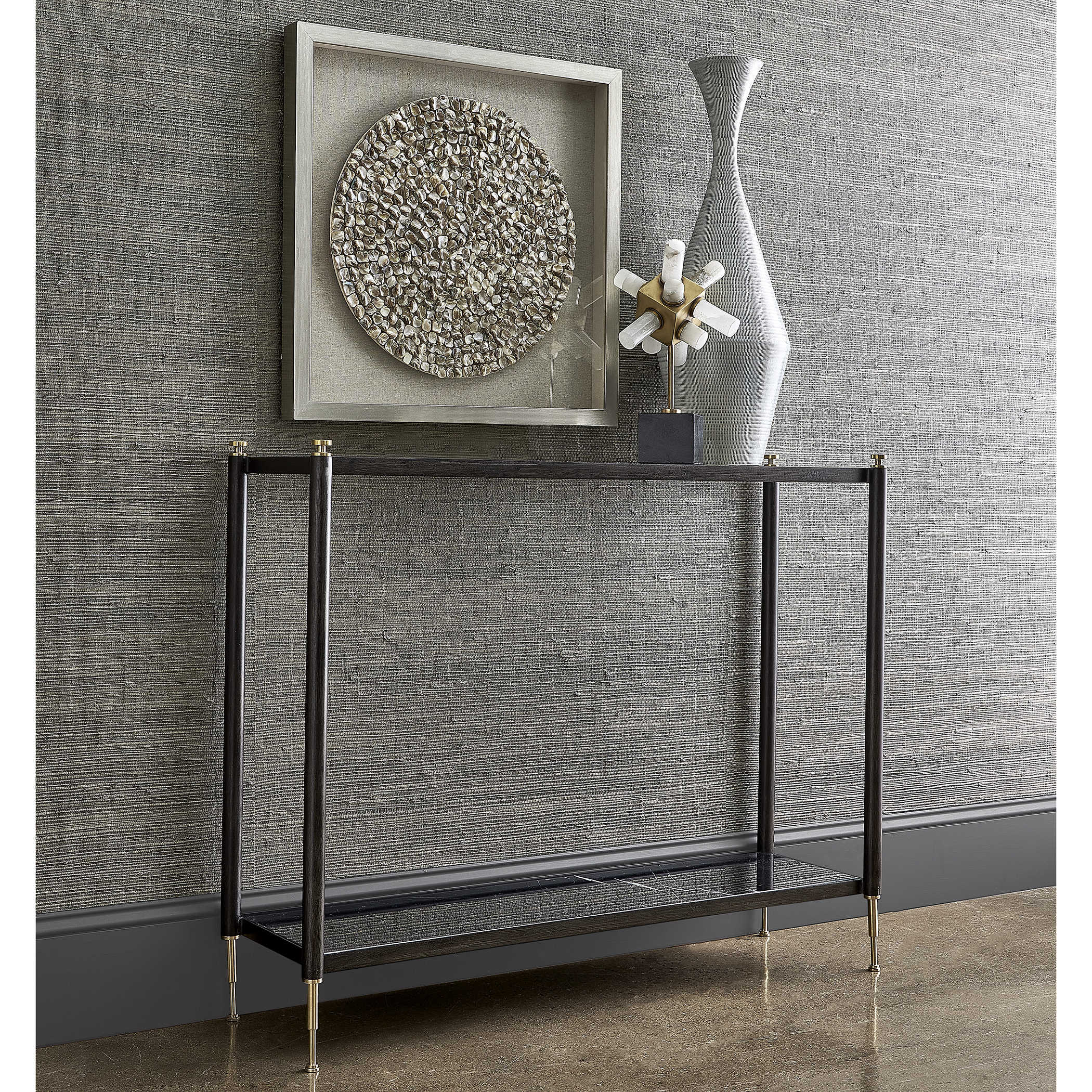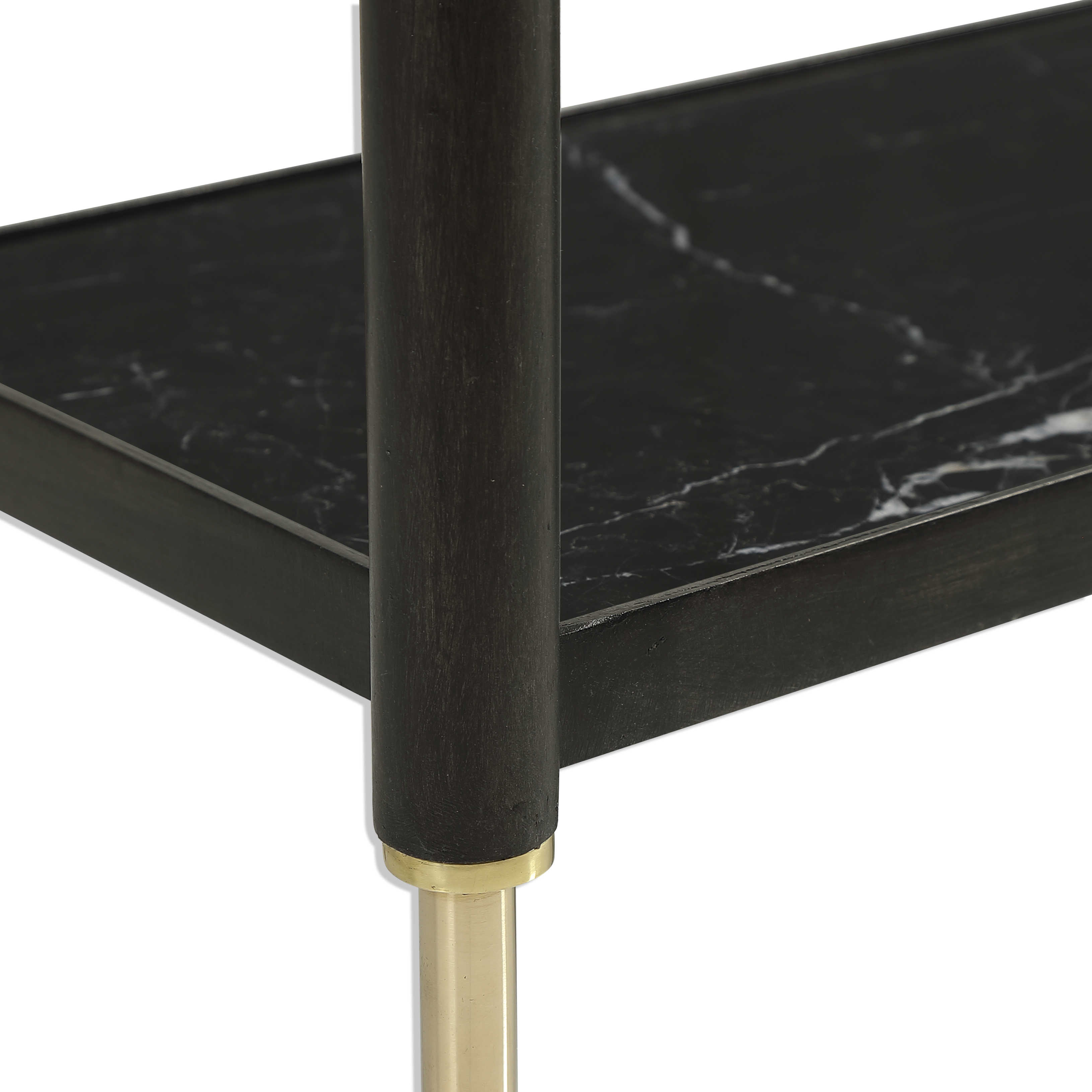 Консоль Viceroy оснащена нижней полкой из полированного черно-белого мрамора, которая не только служит функциональным элементом для хранения и декора, но также добавляет изысканности и роскоши общему внешнему виду. Верхняя столешница выполнена из прозрачного закаленного стекла, подчеркивающего красоту мраморной полки и создающего эффект простора и легкости.